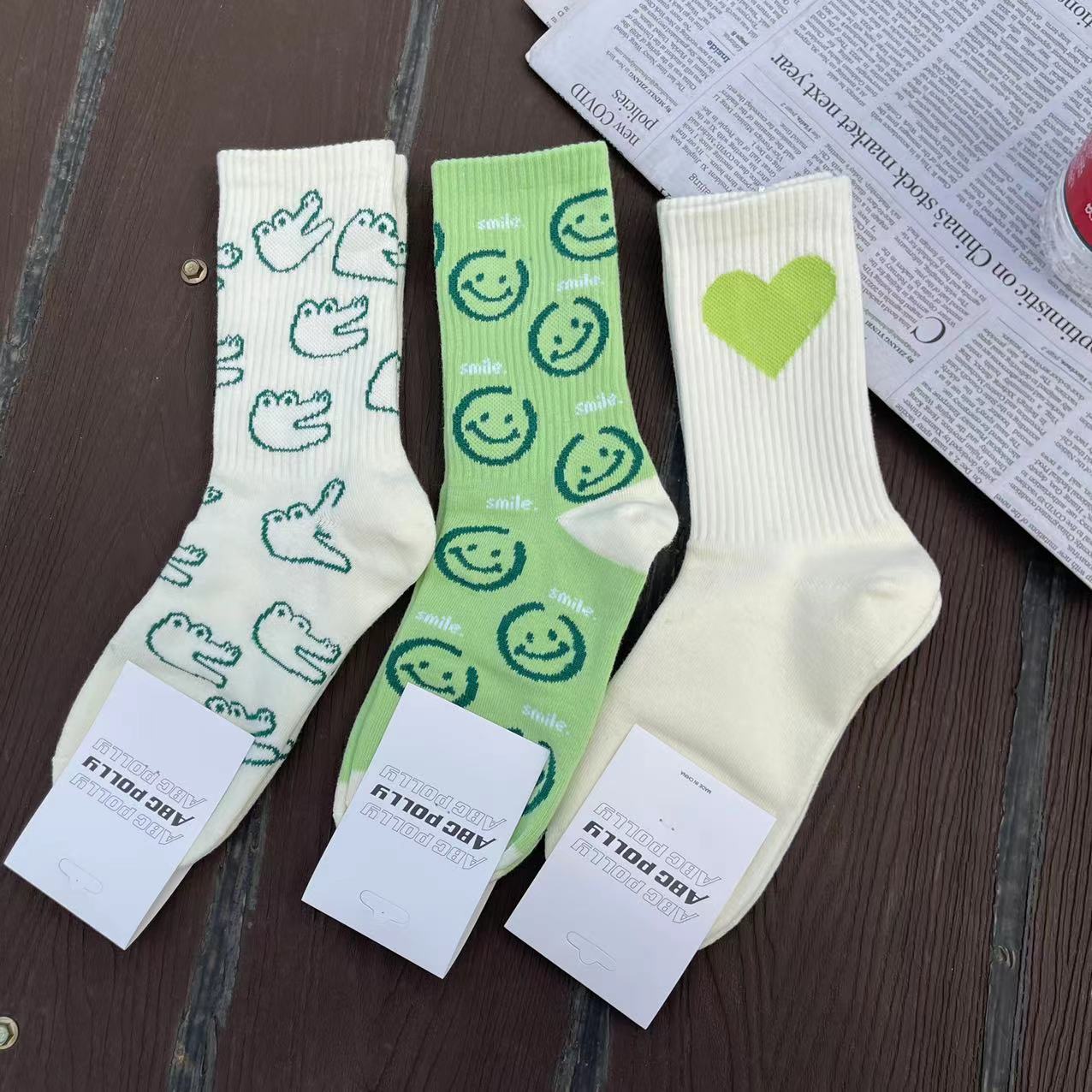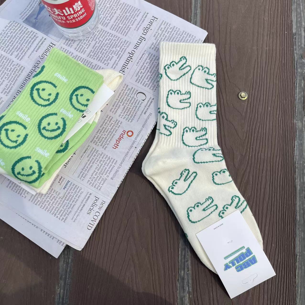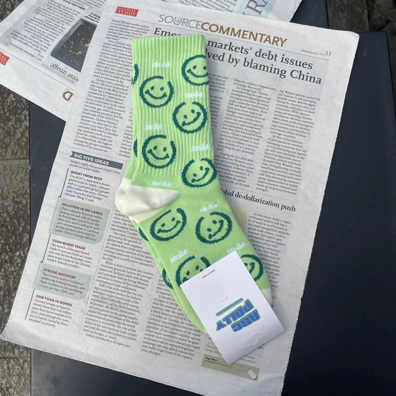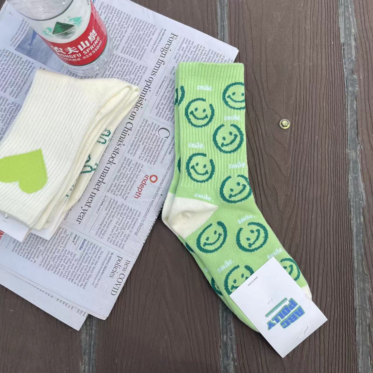 四季笑脸英文设计感荧光绿男女彩色百搭中筒袜ins潮长筒袜子潮袜