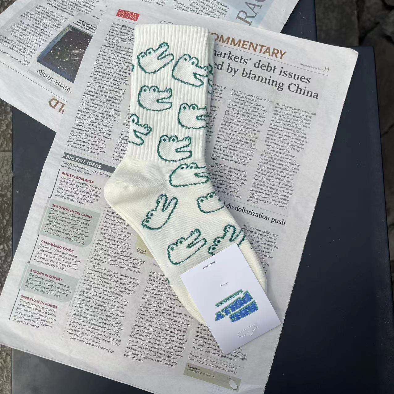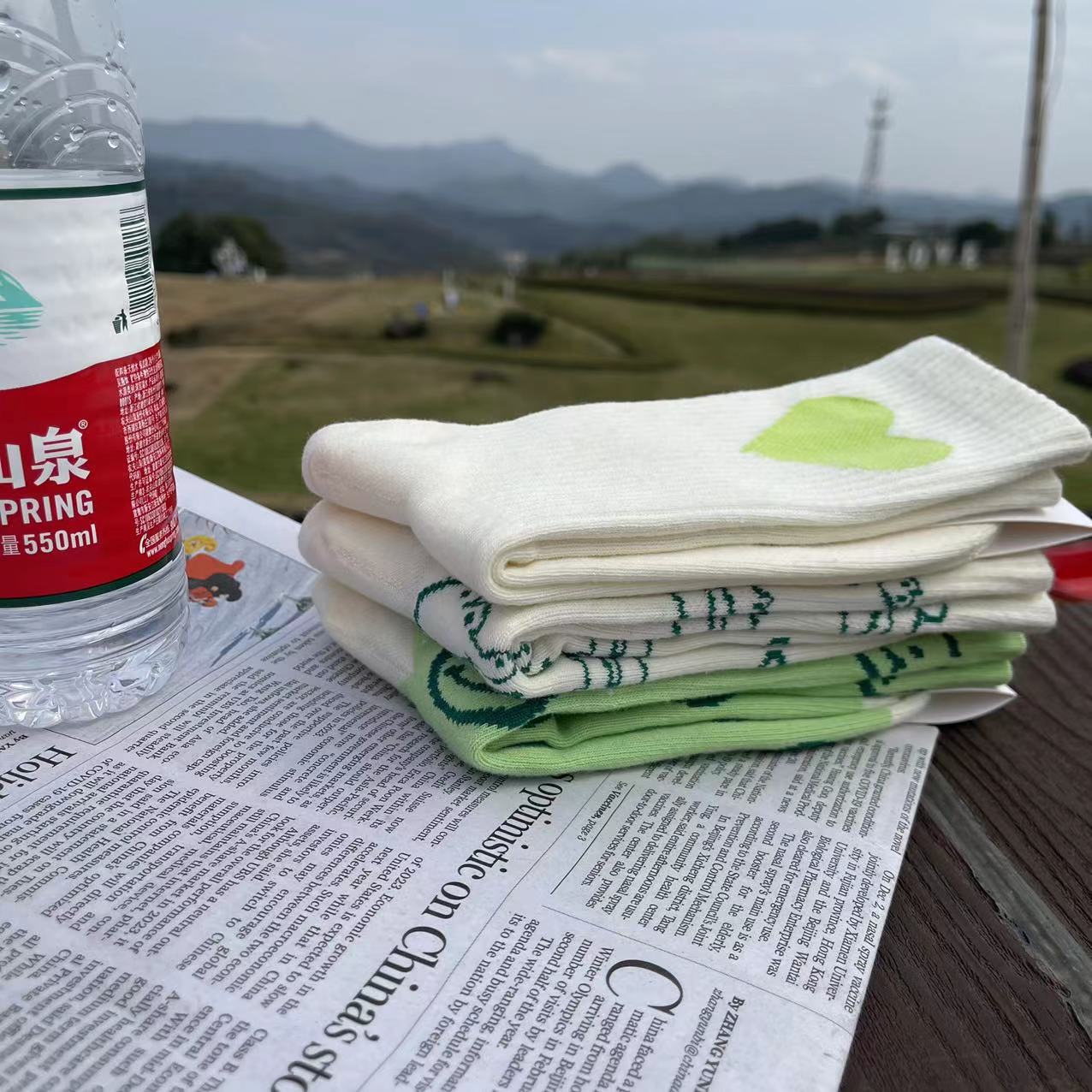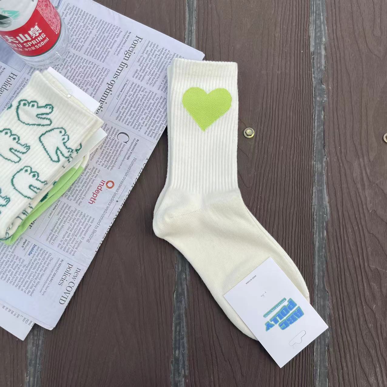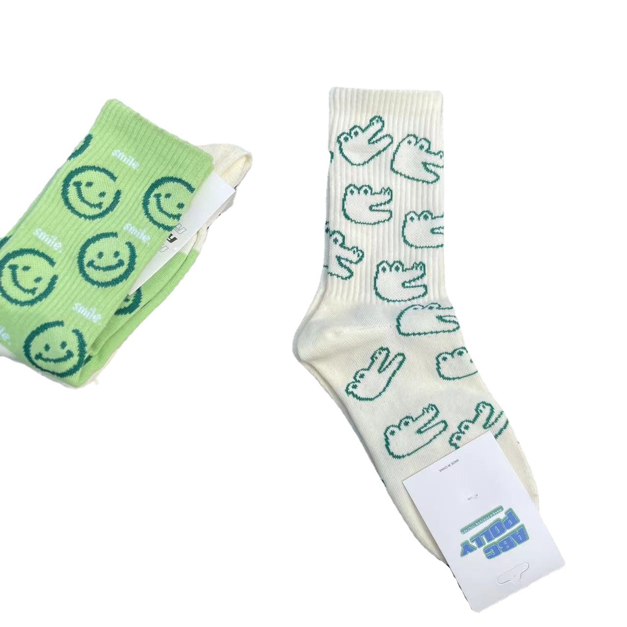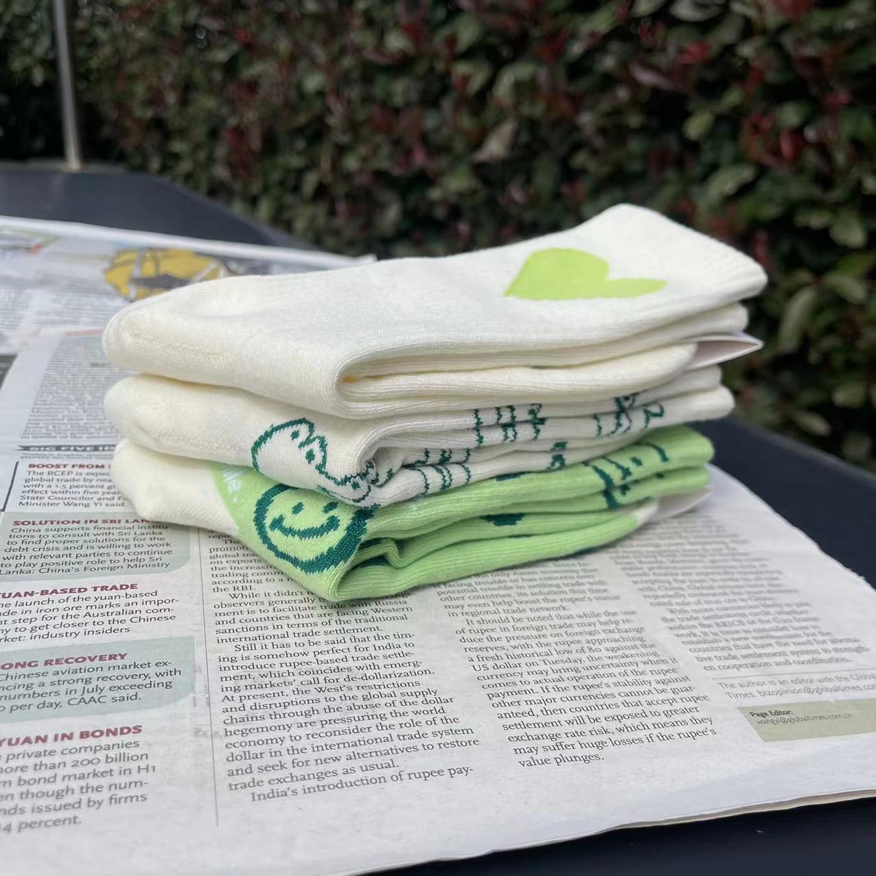 四季笑脸英文设计感荧光绿男女彩色百搭中筒袜ins潮长筒袜子潮袜
