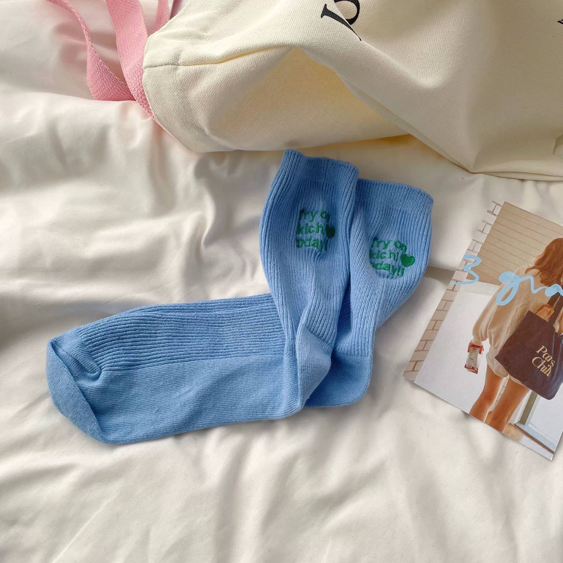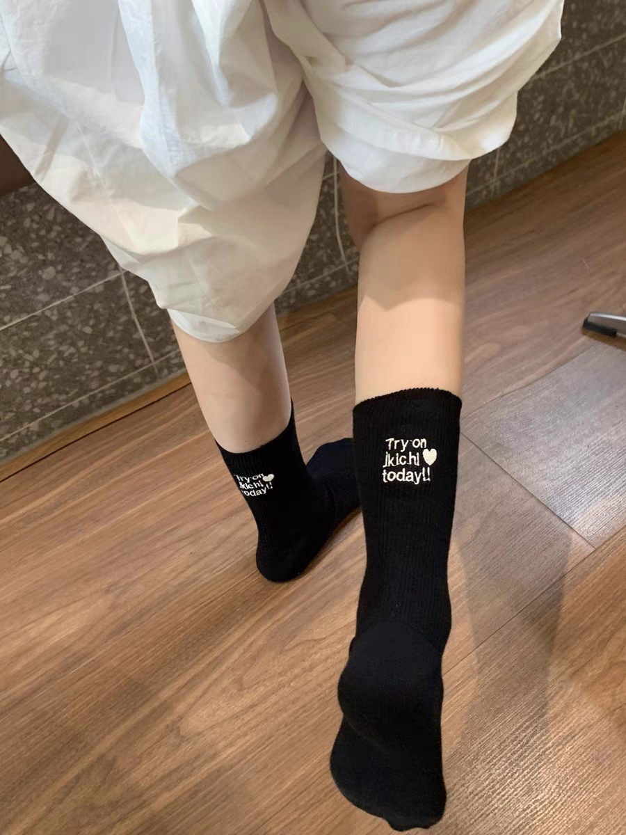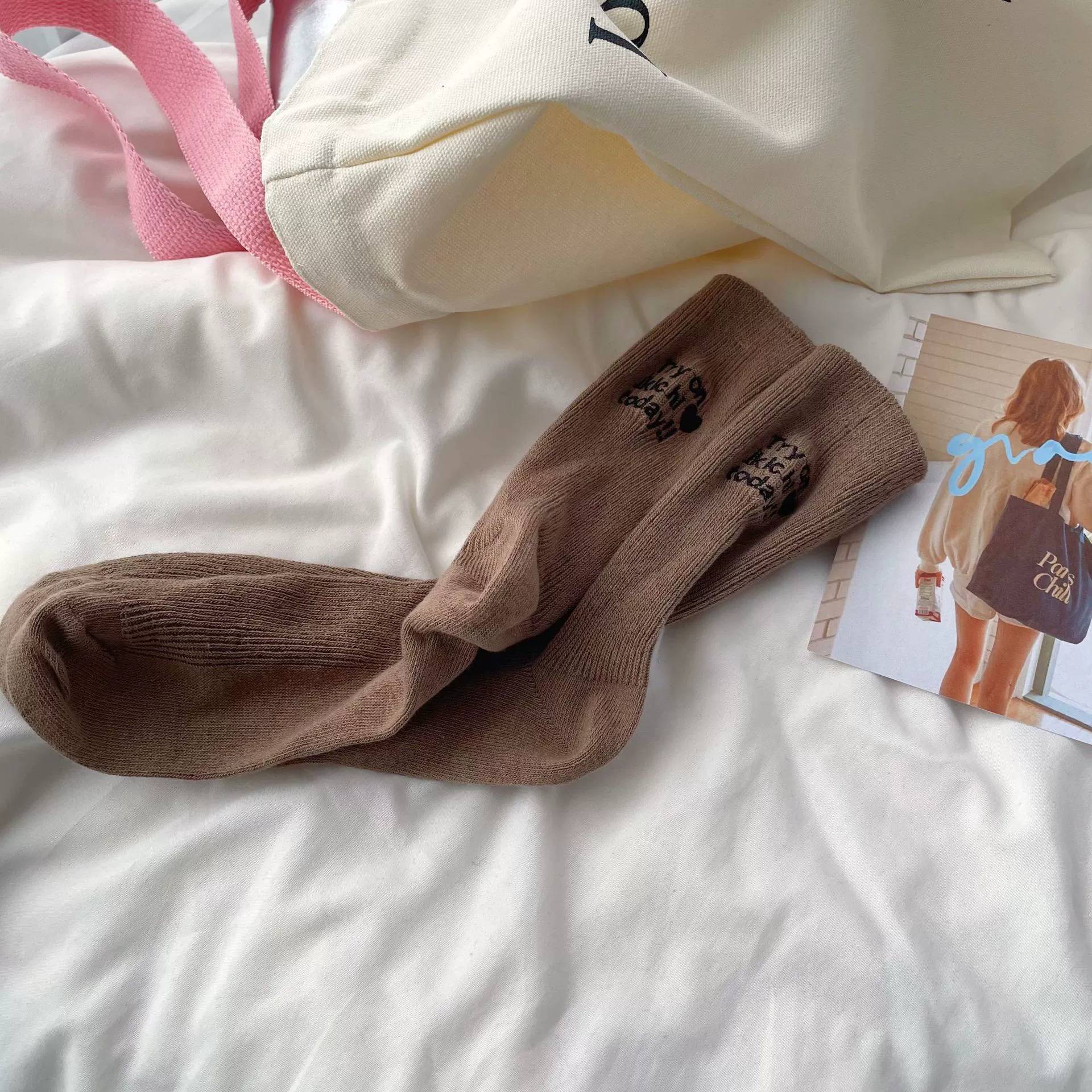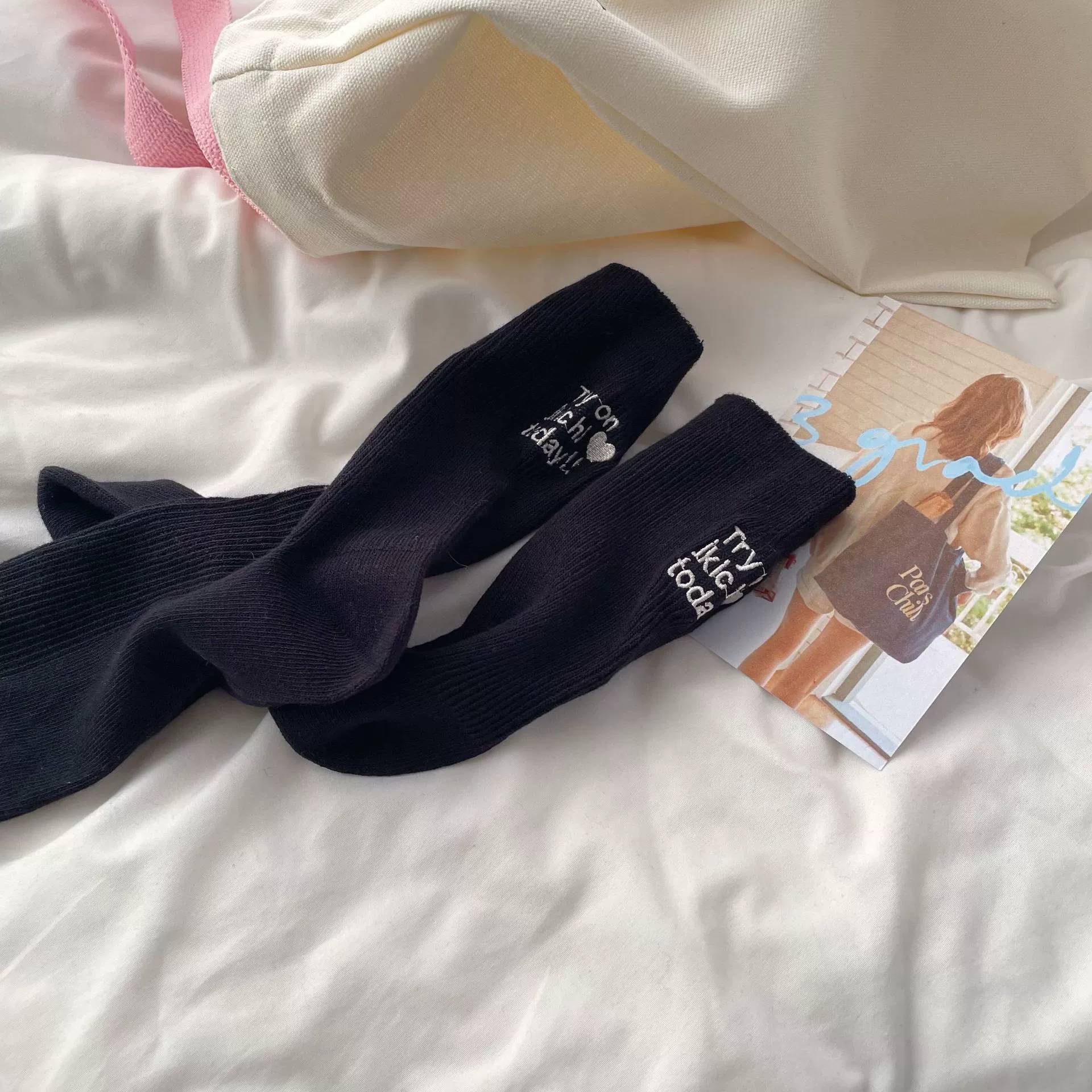 诸暨袜子日系双针英文刺绣ins男女中筒袜纯色小众堆堆袜复古百搭