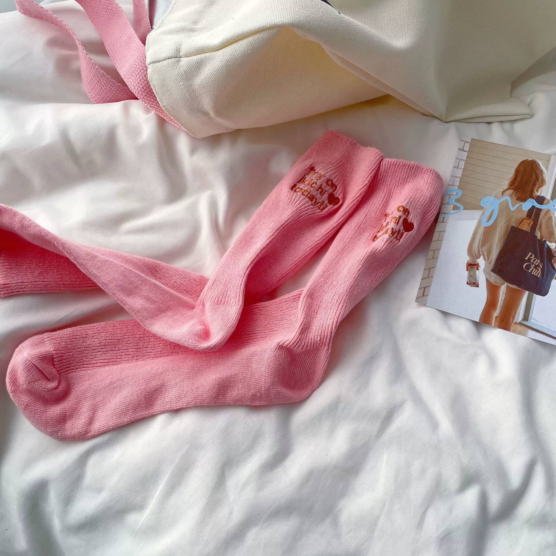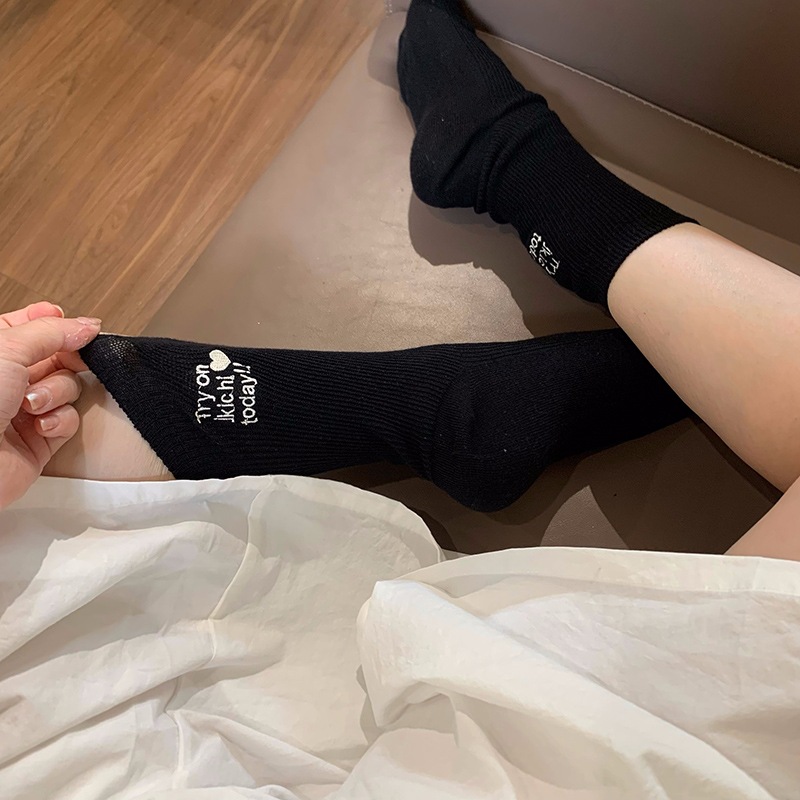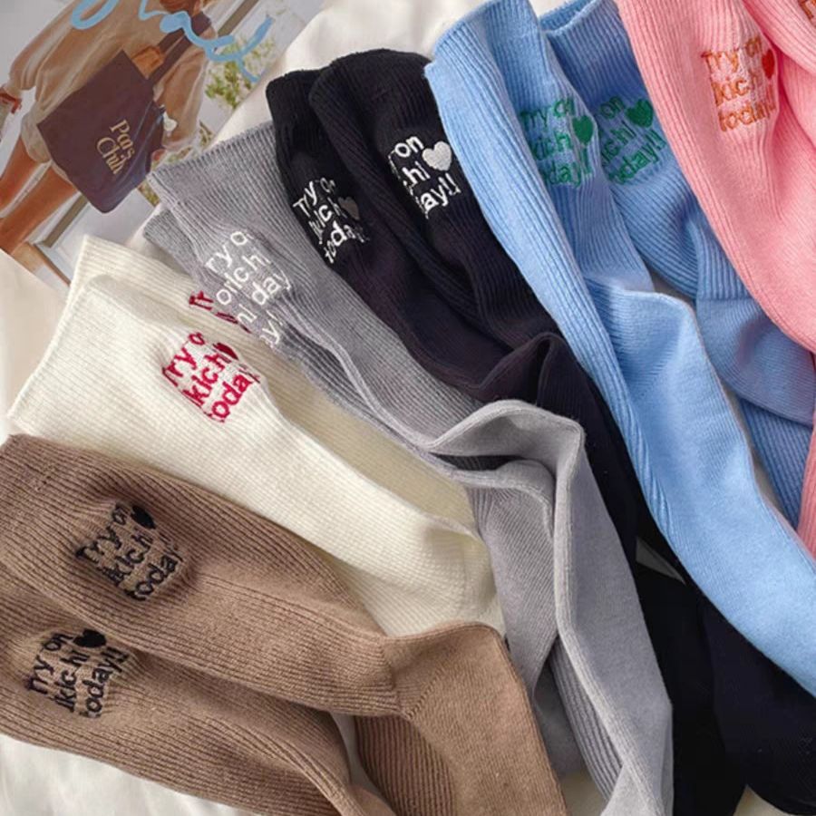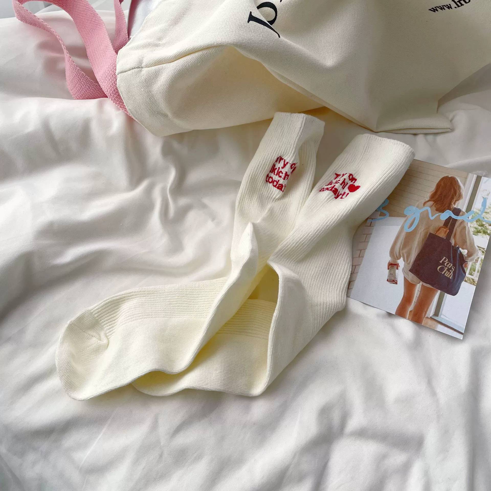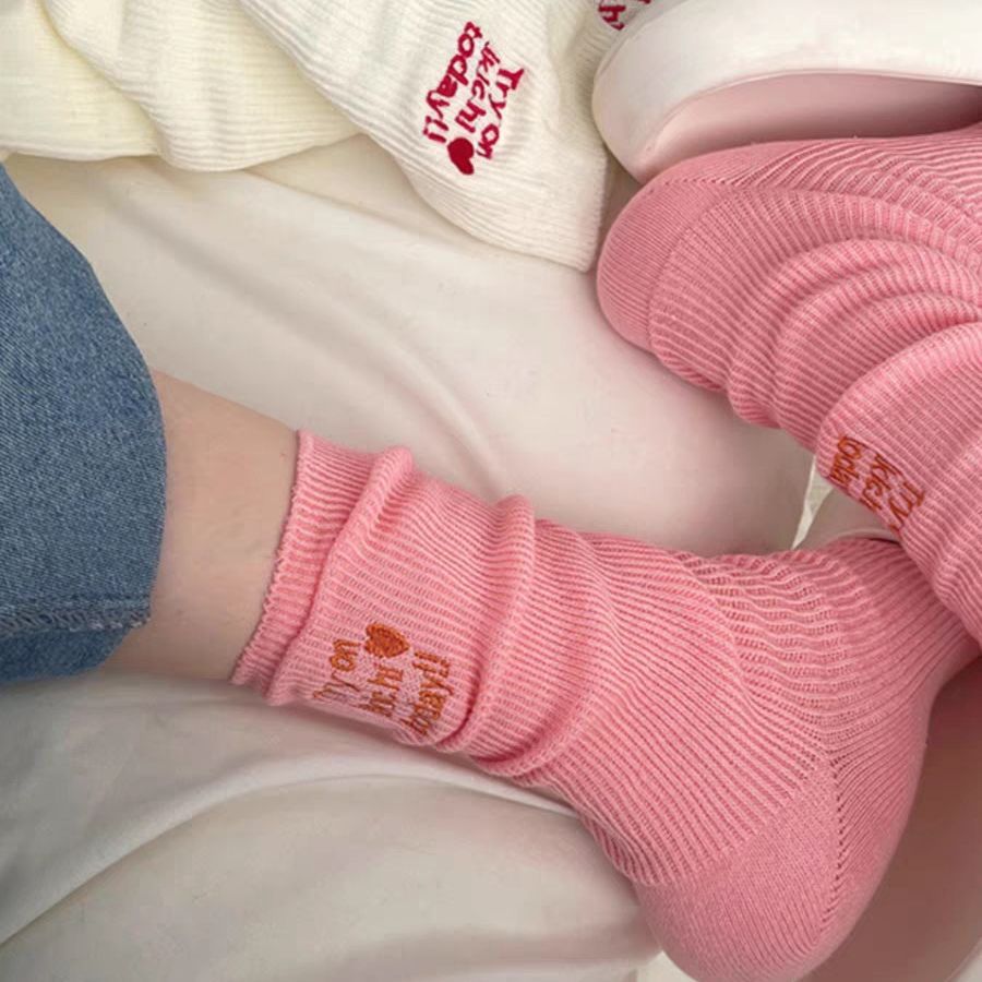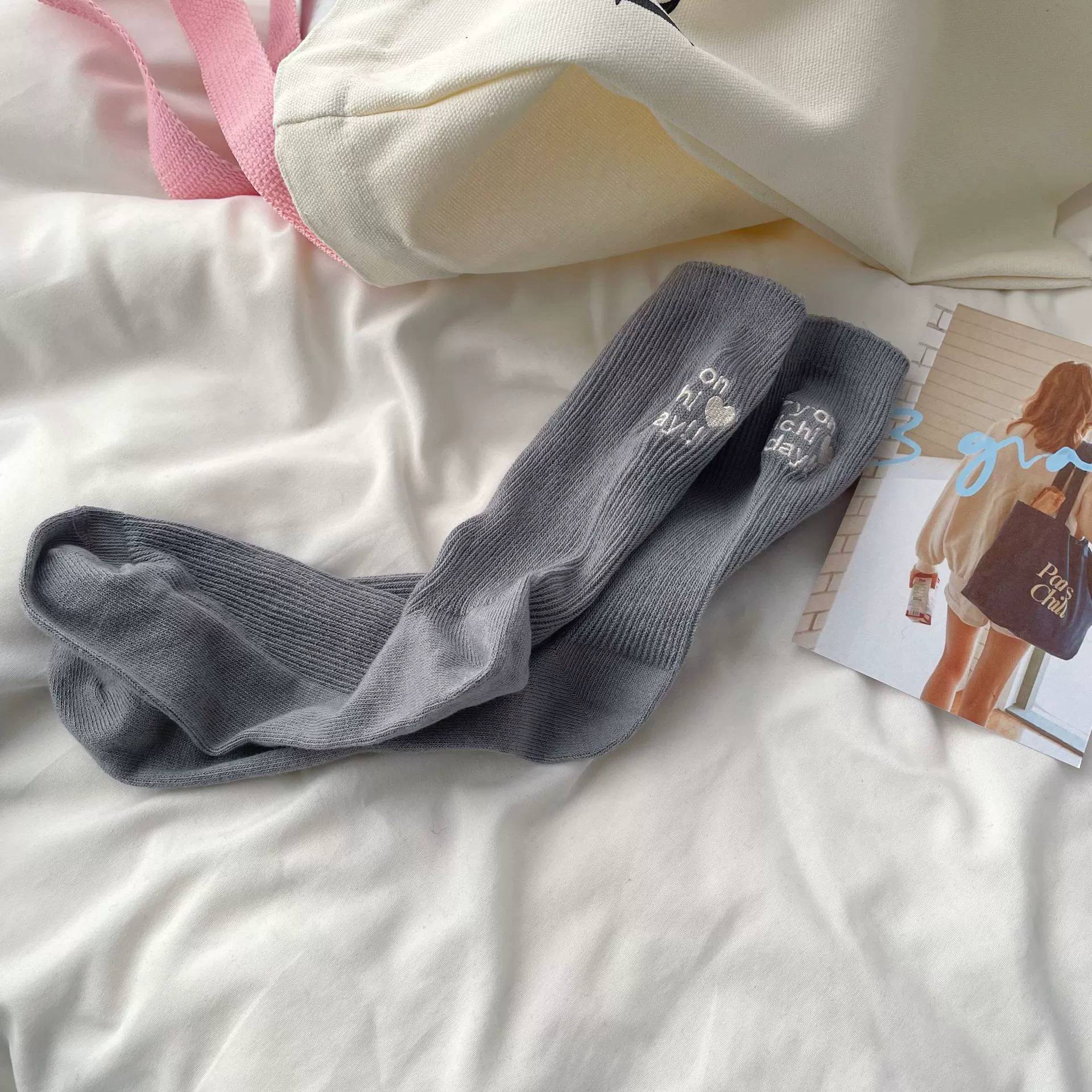 诸暨袜子日系双针英文刺绣ins男女中筒袜纯色小众堆堆袜复古百搭