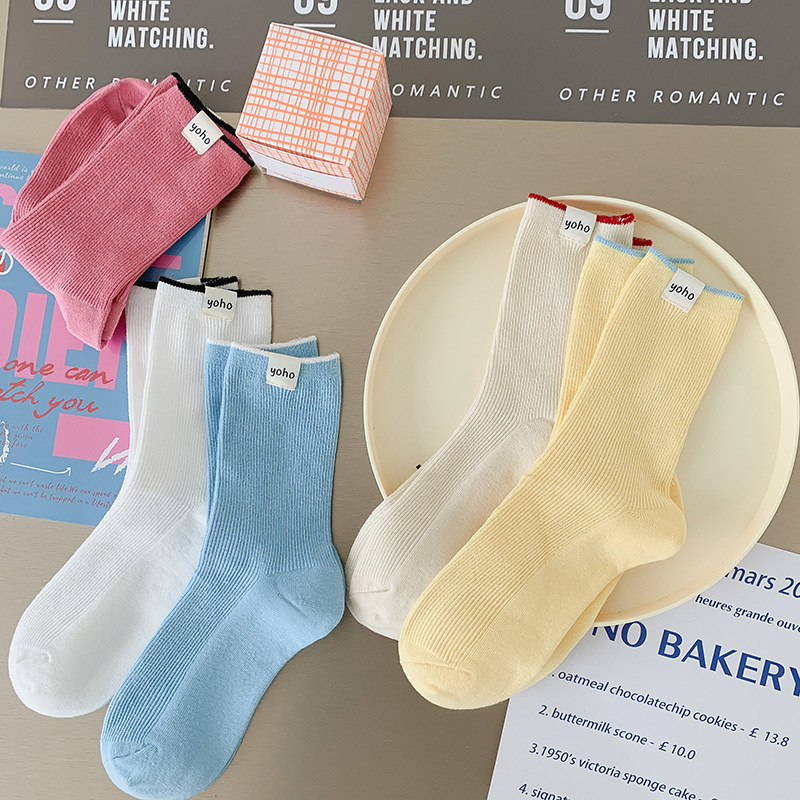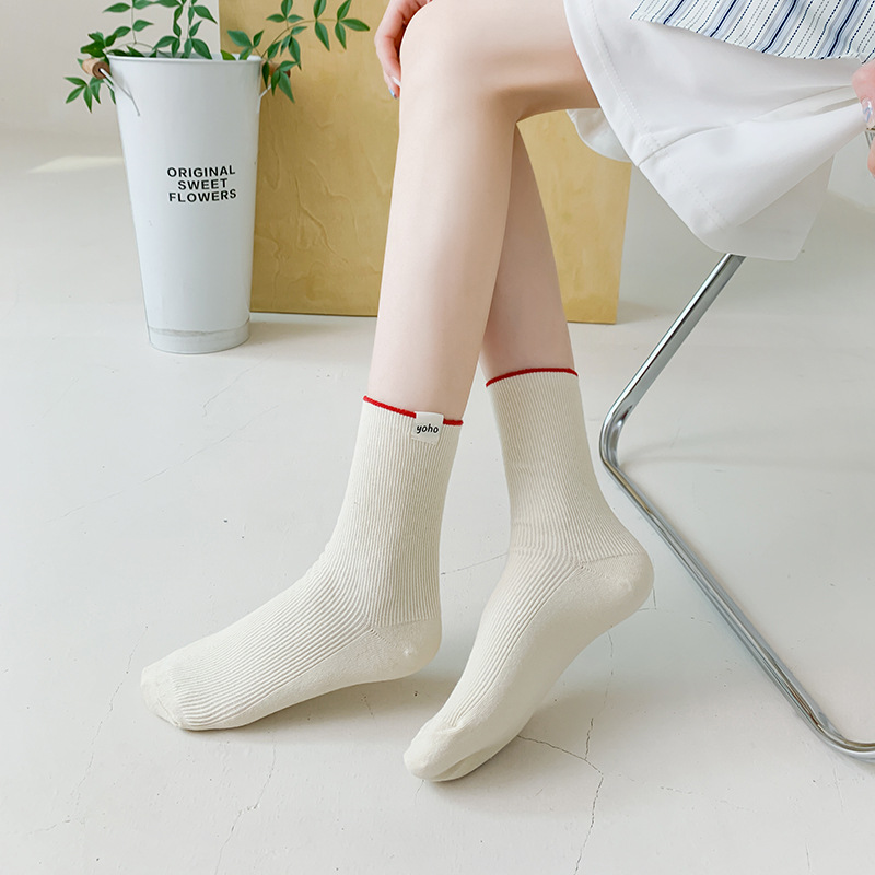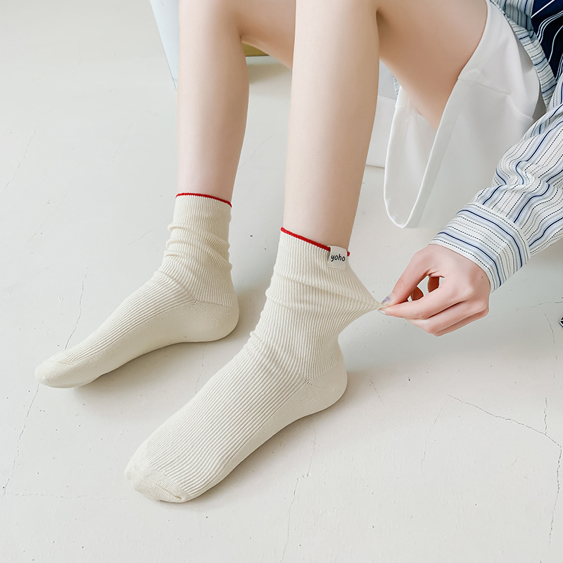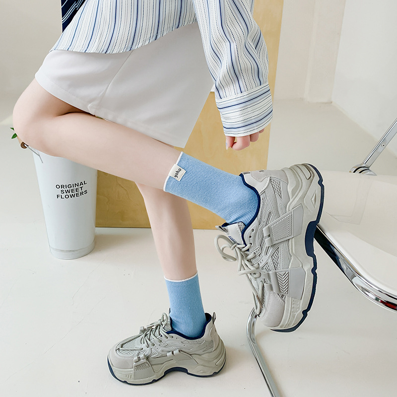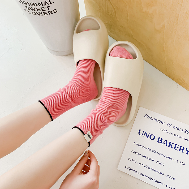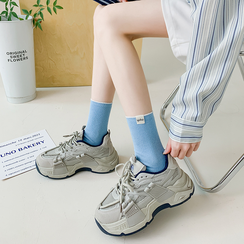 春夏新品袜子女纯色奶油英文布标运动中筒袜日系ins学院风堆堆袜