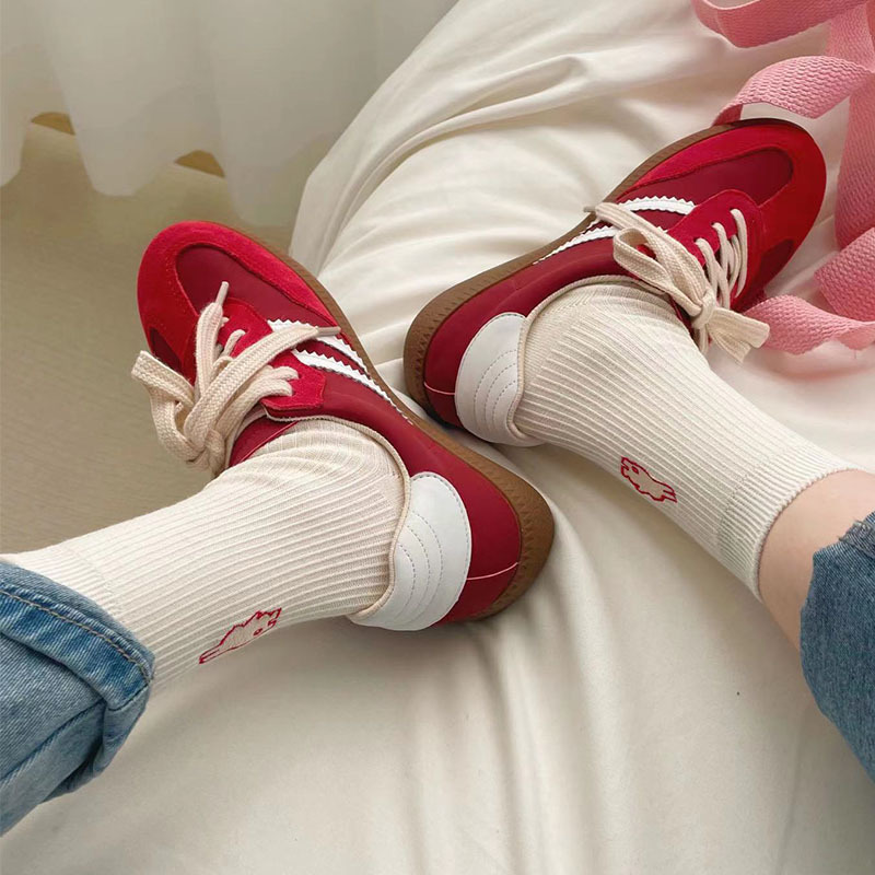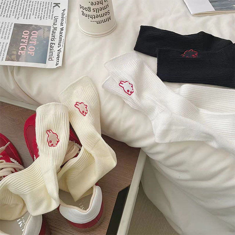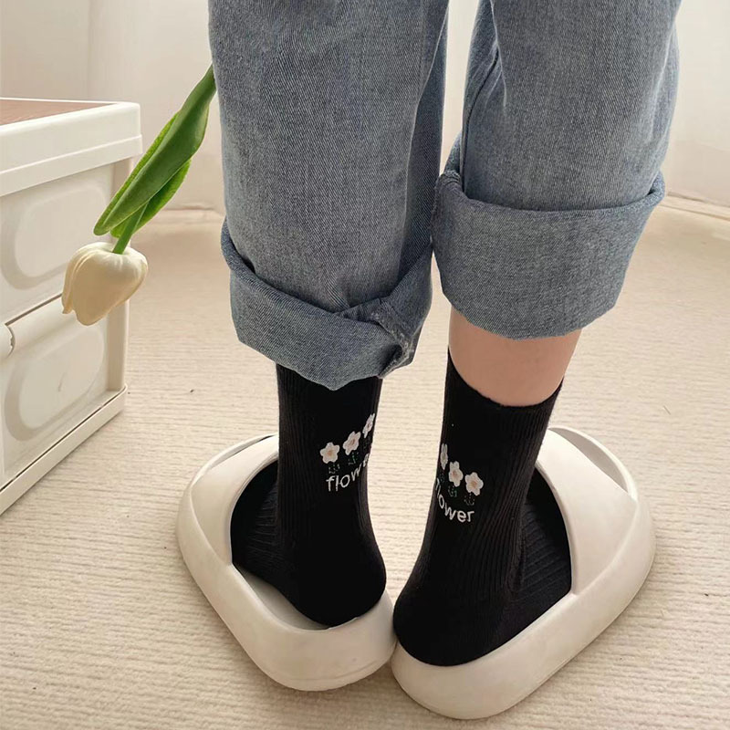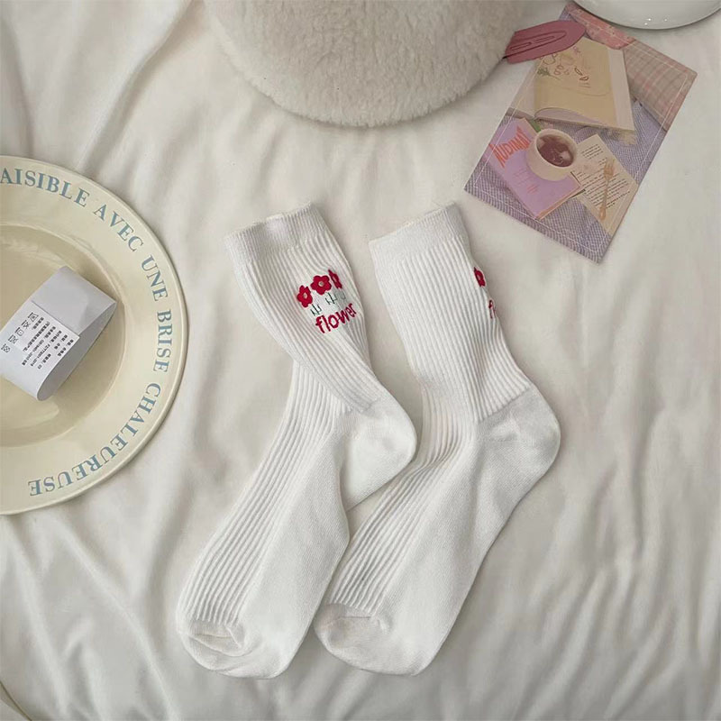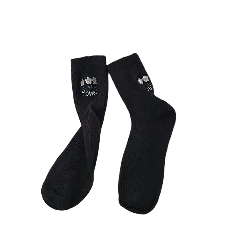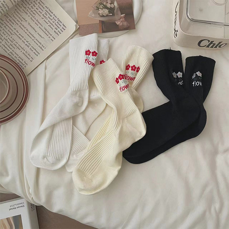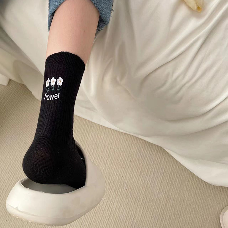 后跟花朵袜子女ins风刺绣英文竖纹中筒袜小众日系设计韩版堆堆袜