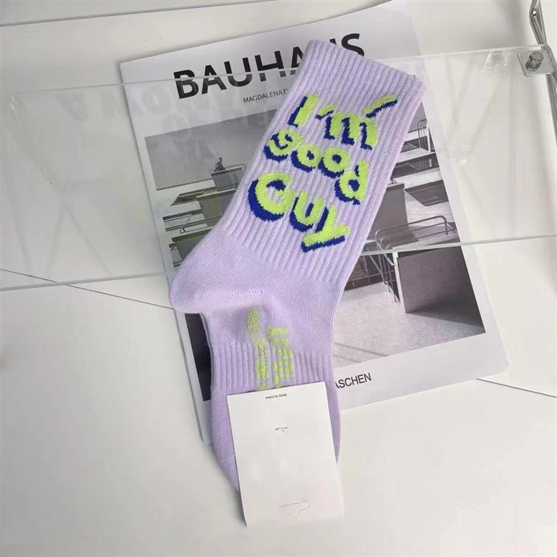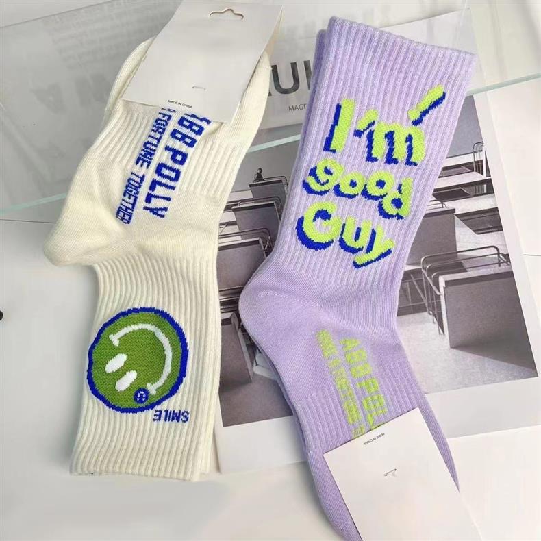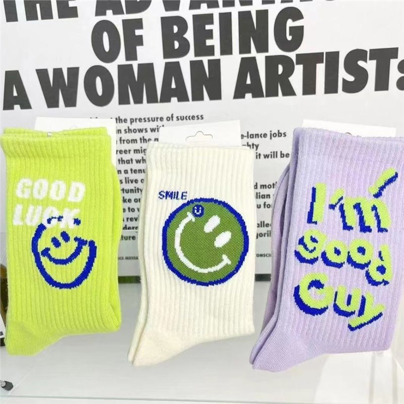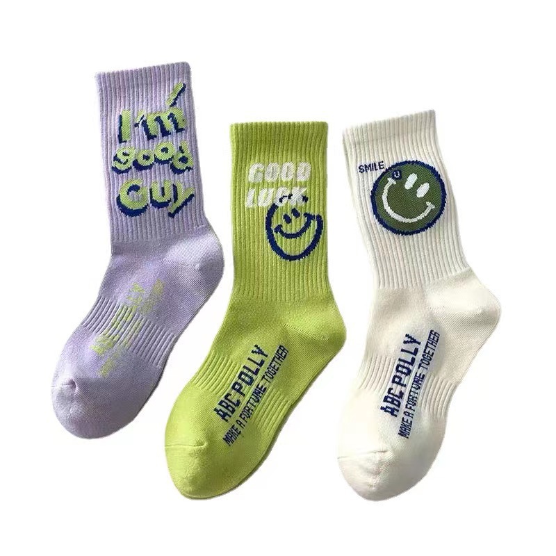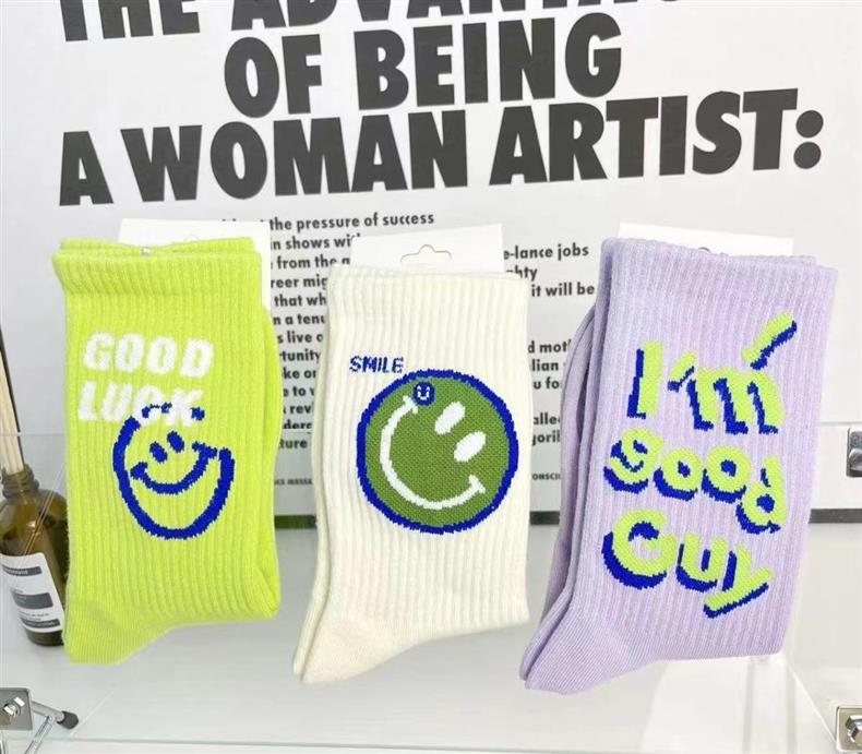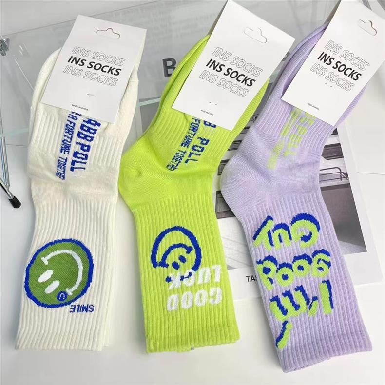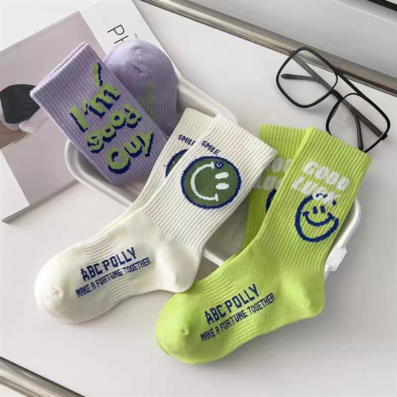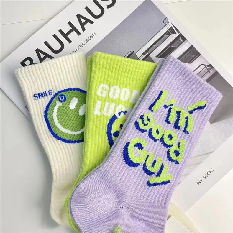 笑脸立体英文设计感荧光绿ins潮长筒袜子男女彩色百搭春秋中筒袜