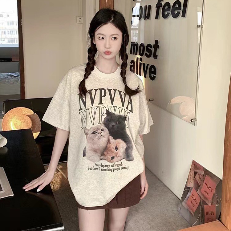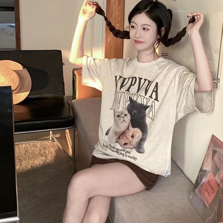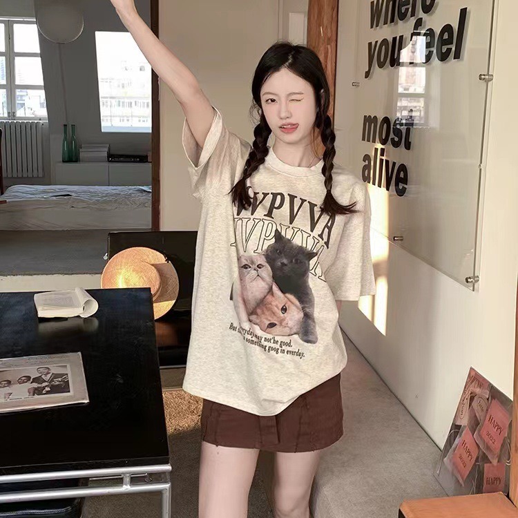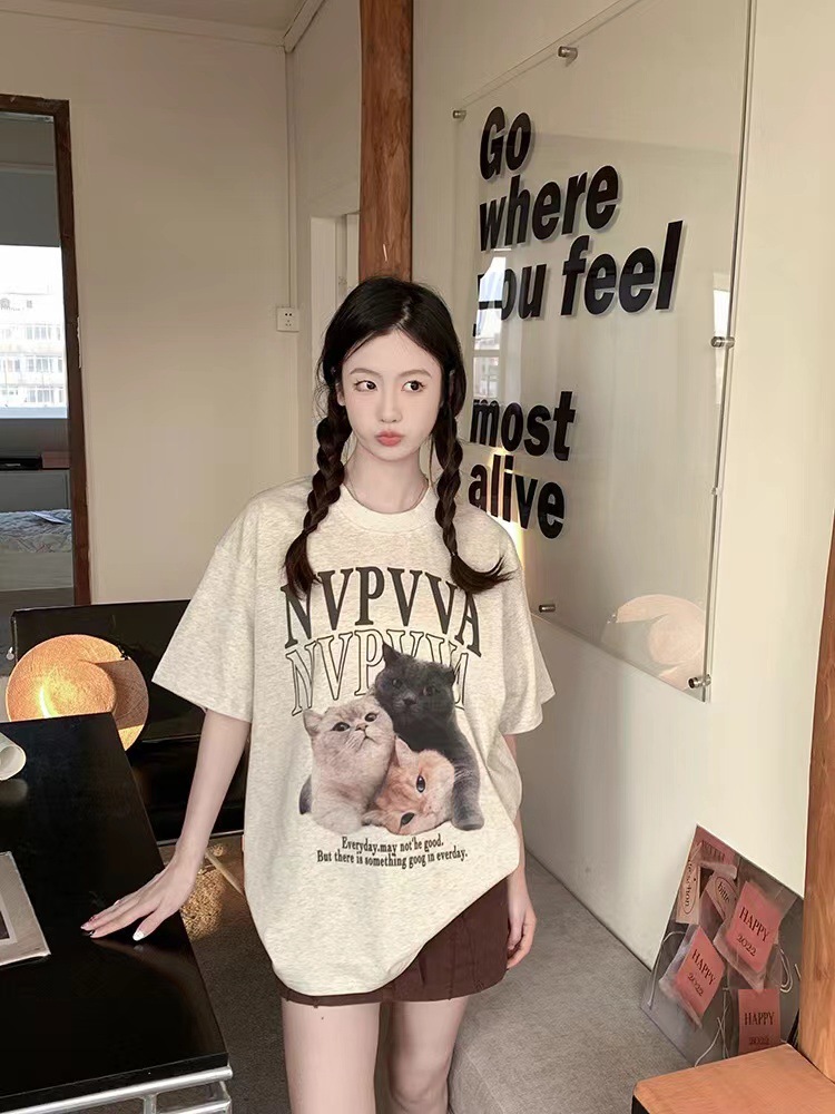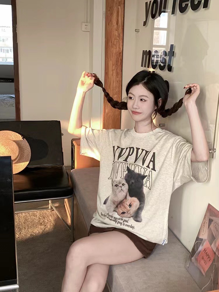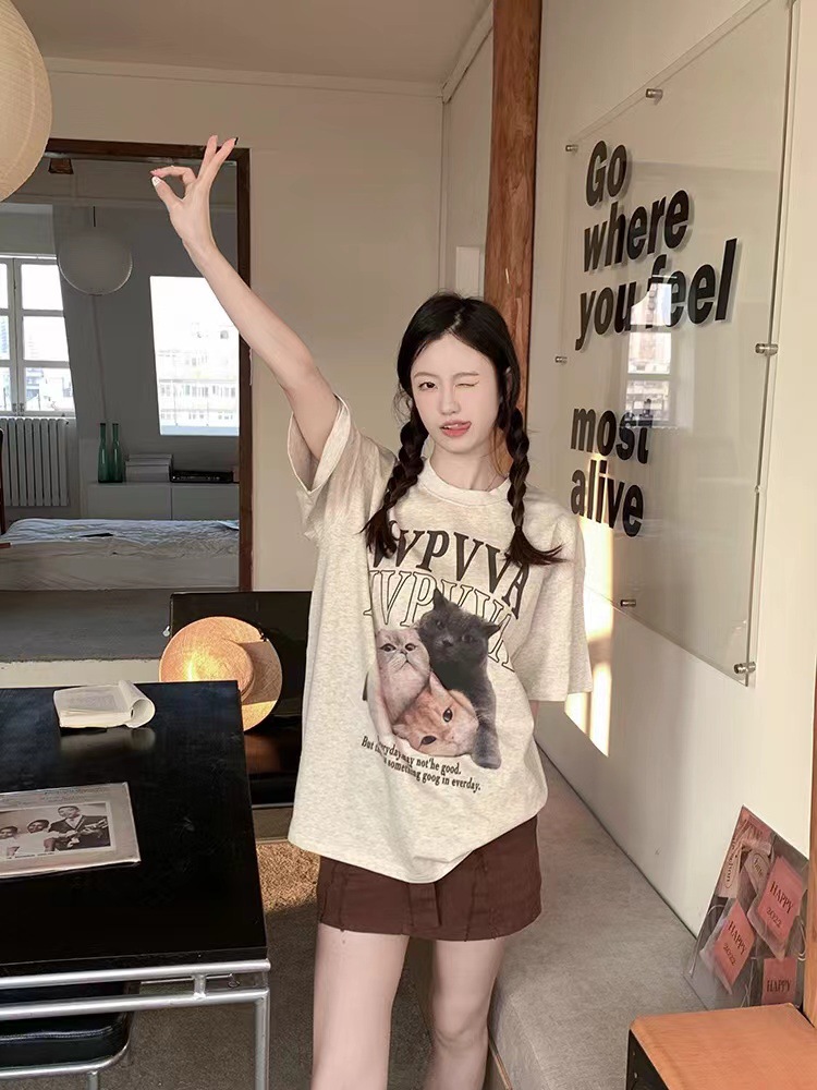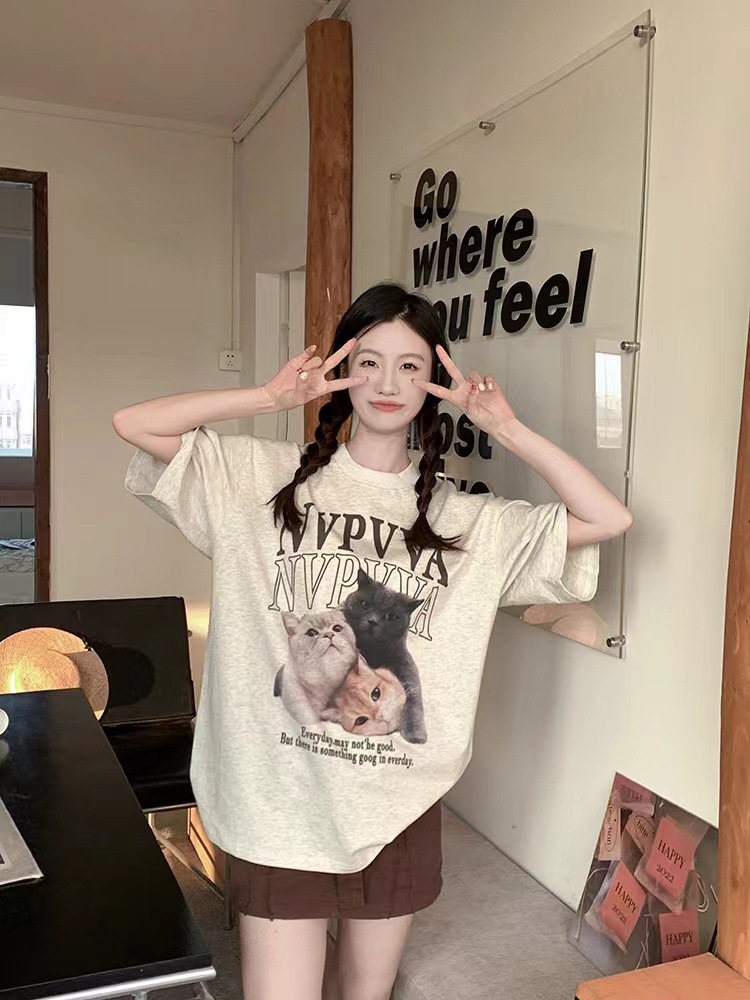 纯棉220克2024夏季新款美式复古可爱印花短袖T恤女宽松设计小众潮