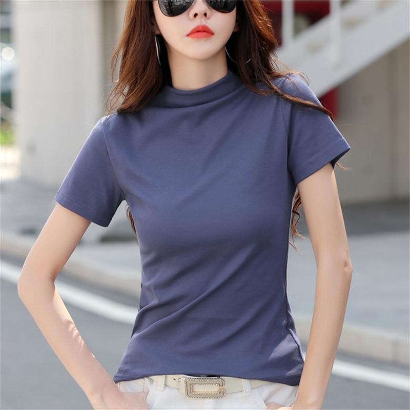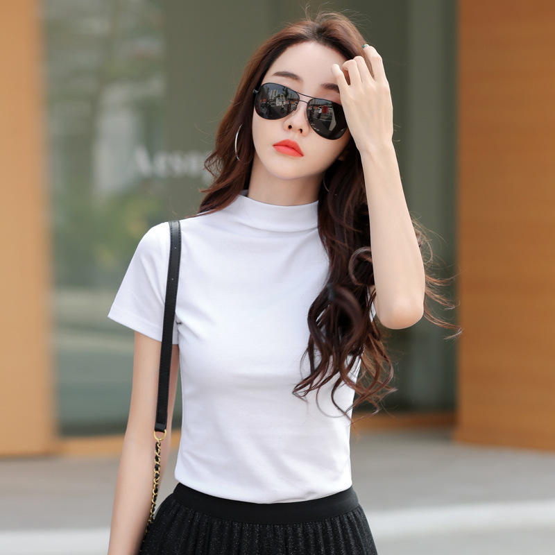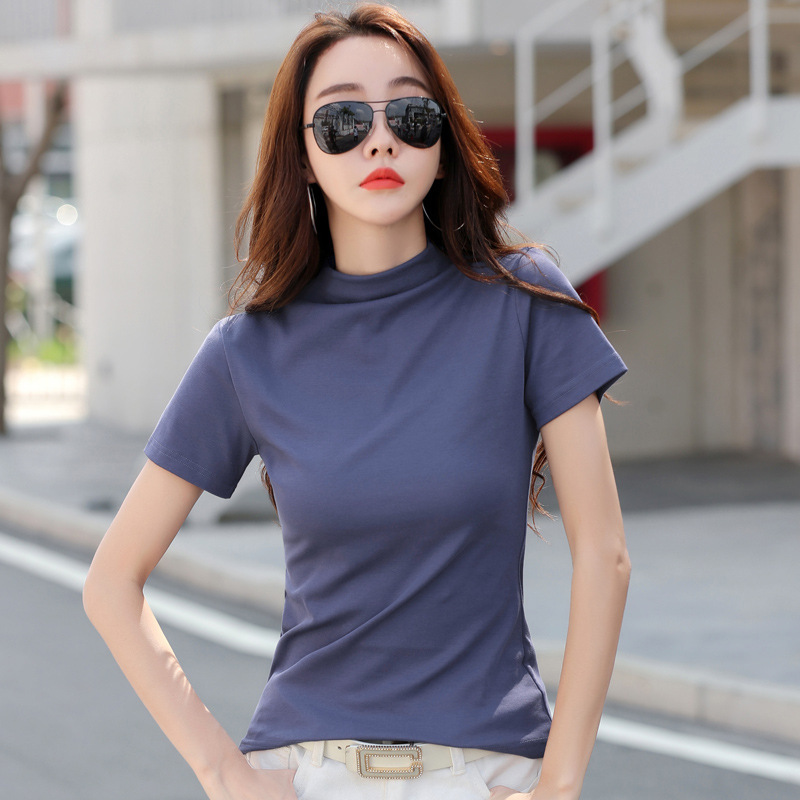 2024春夏新款半高领短袖t恤女修身棉中领上衣打底衫内搭体恤衫