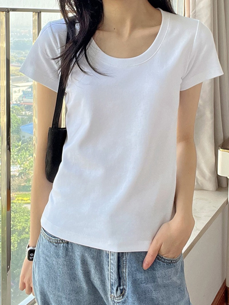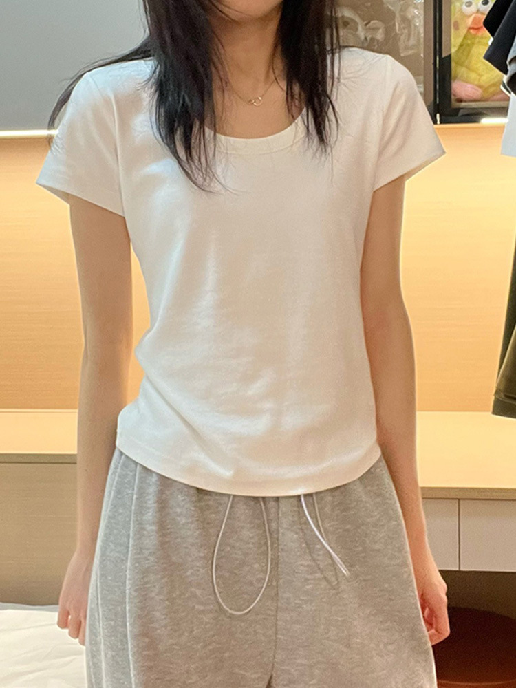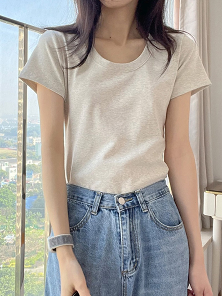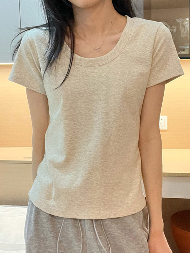 U领灰色百搭短袖T恤女夏季新款美式修身显瘦半袖上衣低领正肩桖