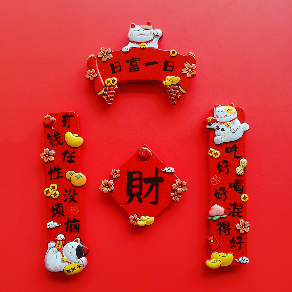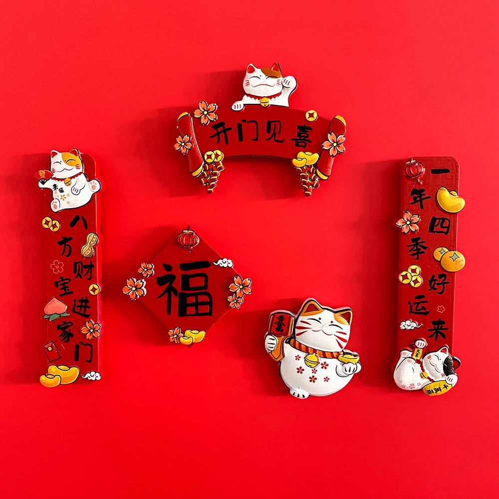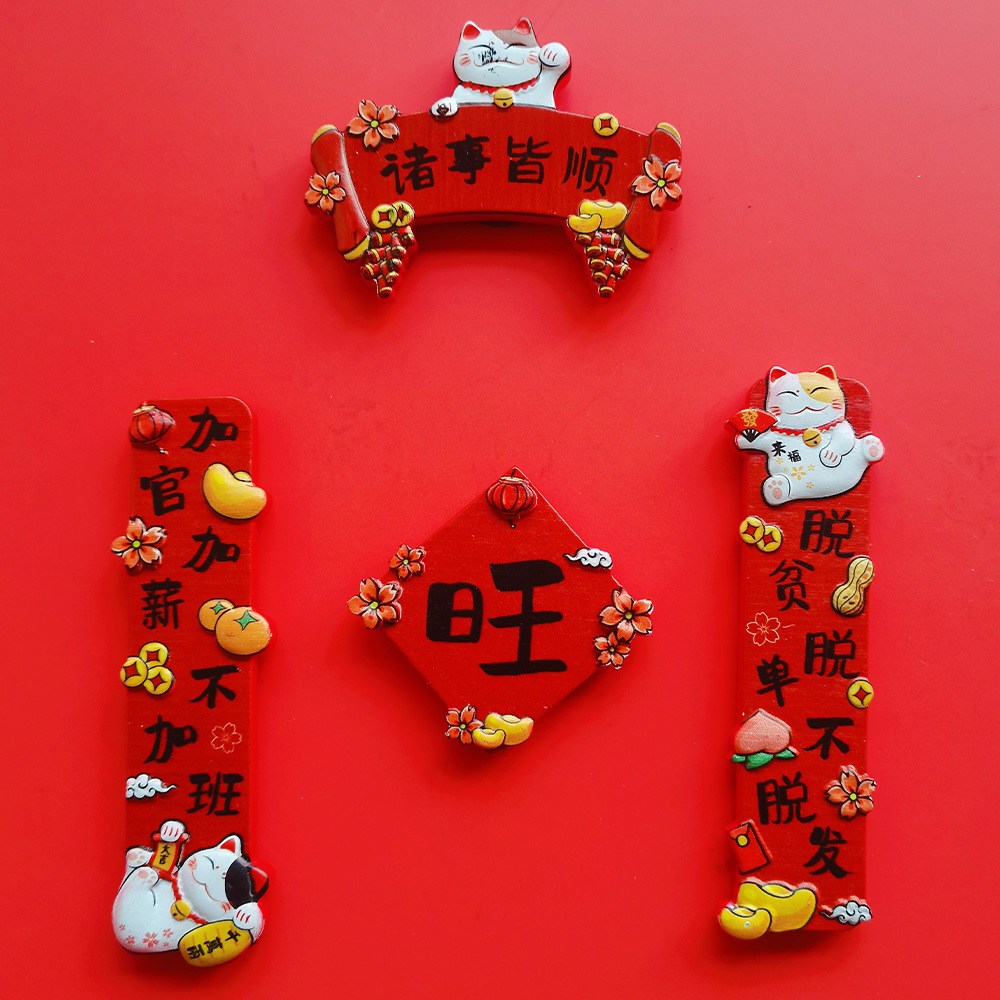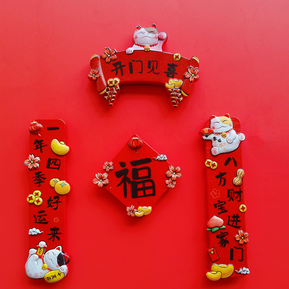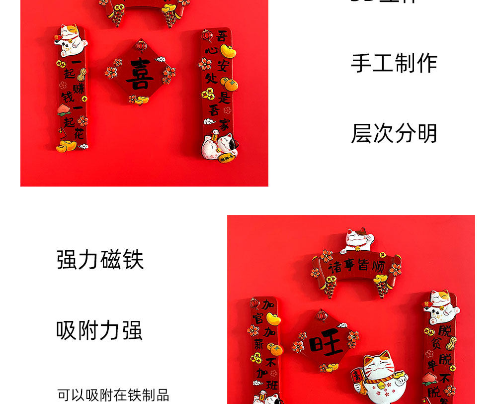 新年春节对联冰箱贴树脂猫喜庆财神中国风立体装饰磁力磁性贴