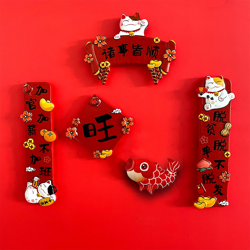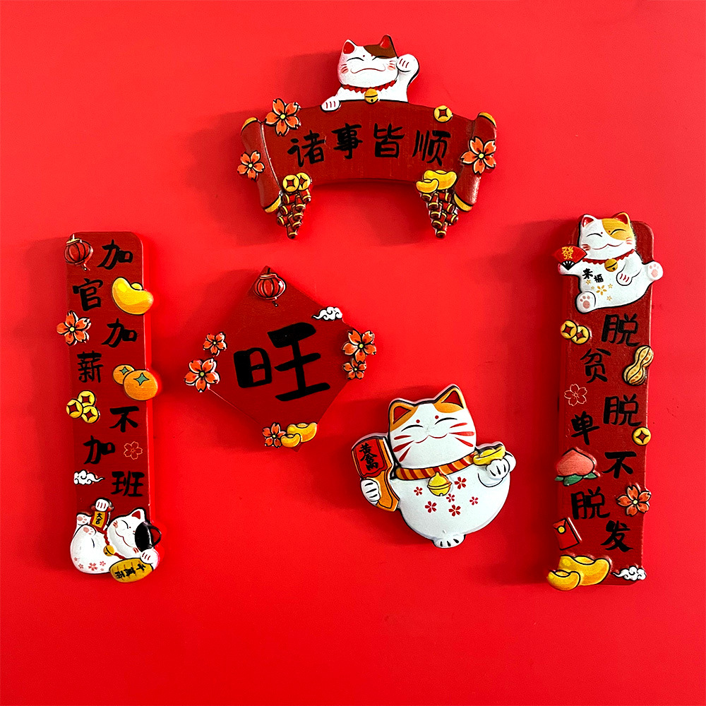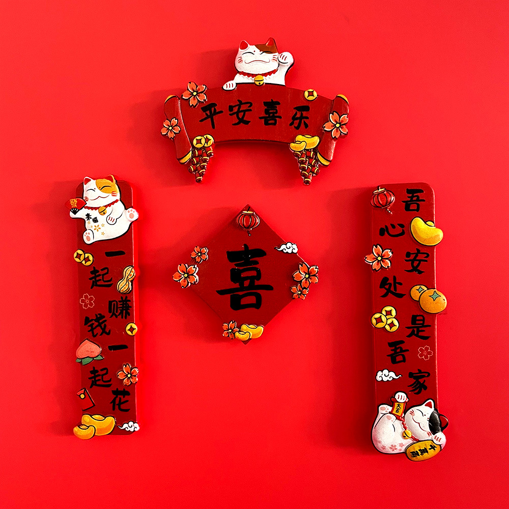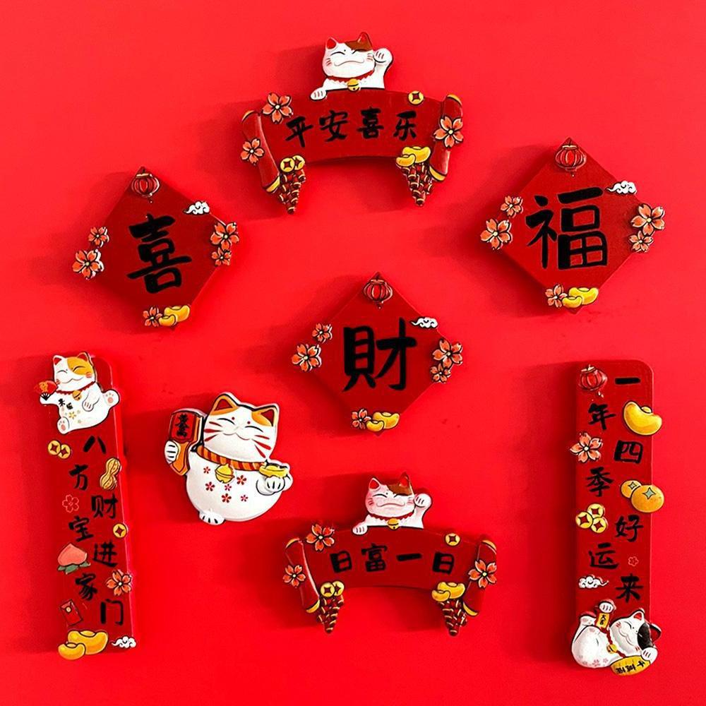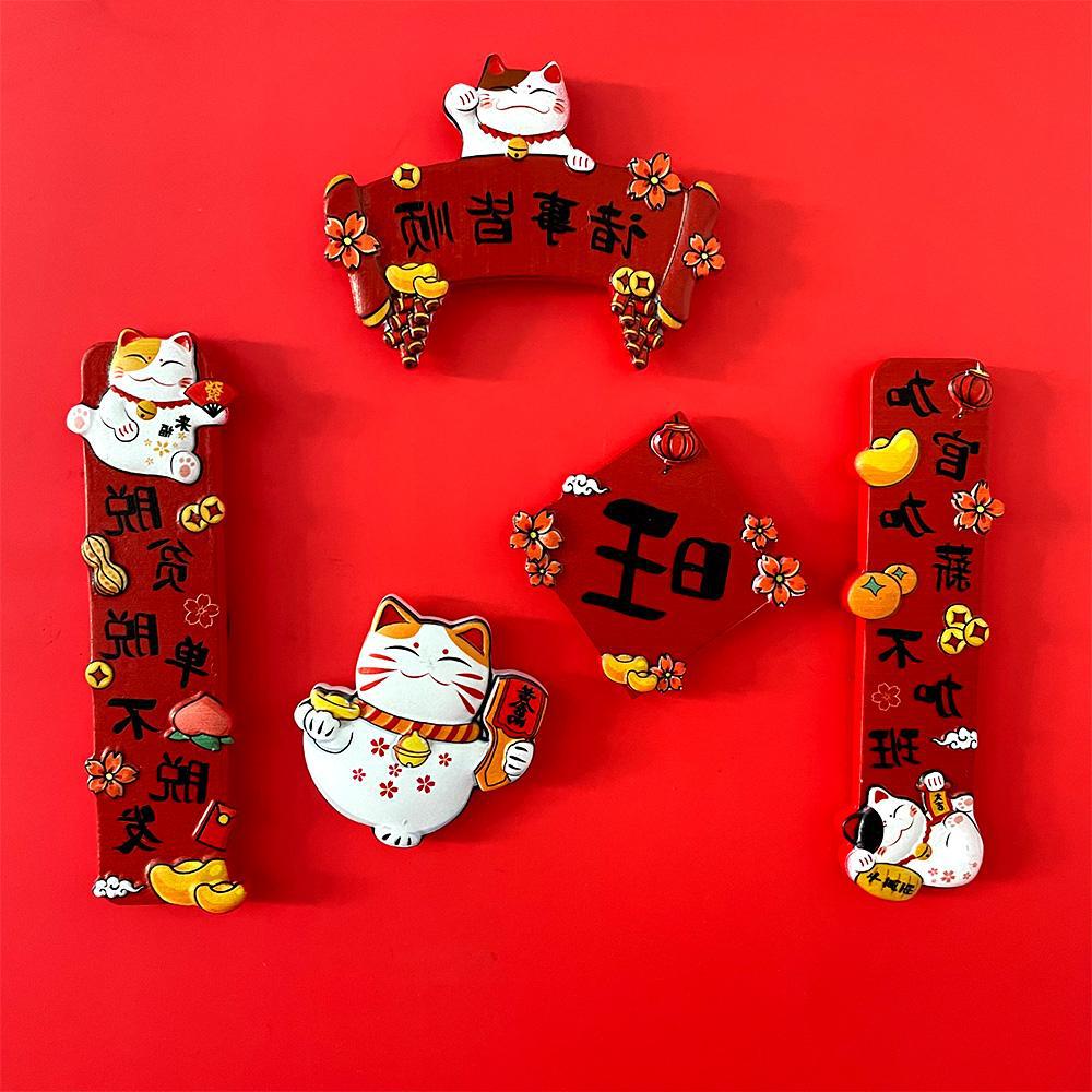 新年春节对联冰箱贴树脂猫喜庆财神中国风立体装饰磁力磁性贴