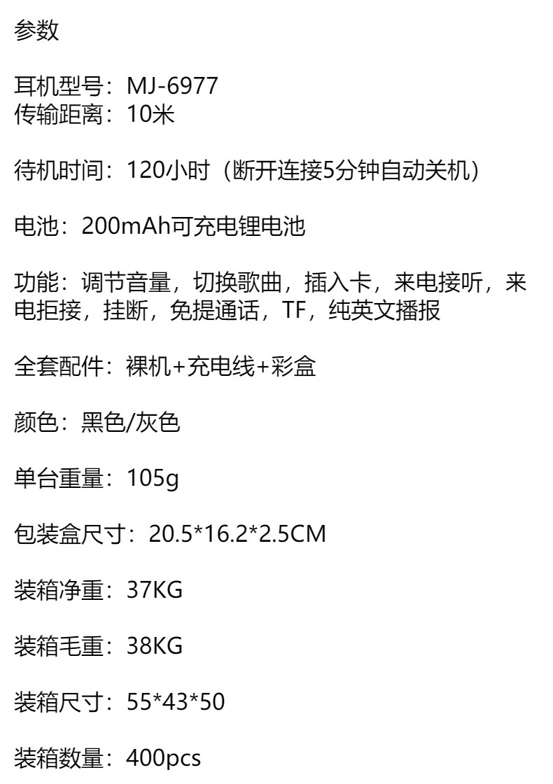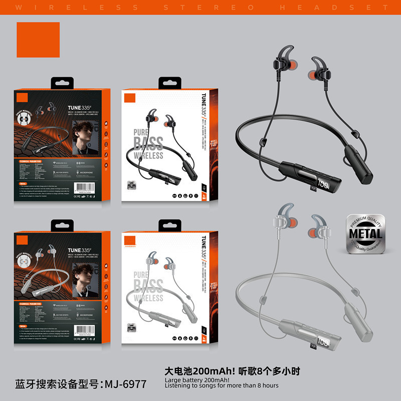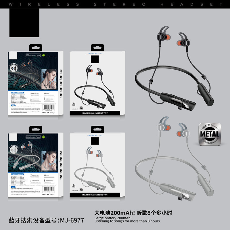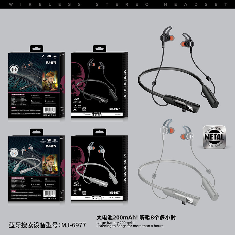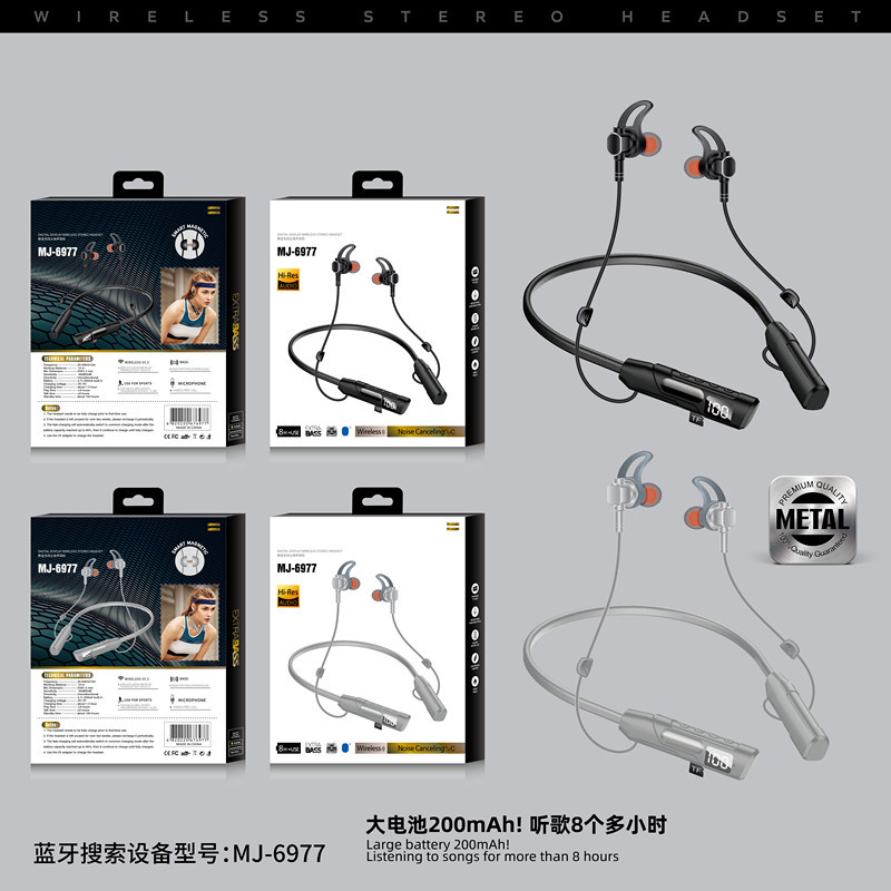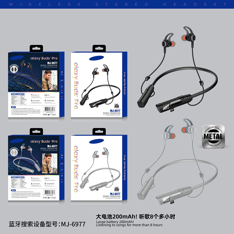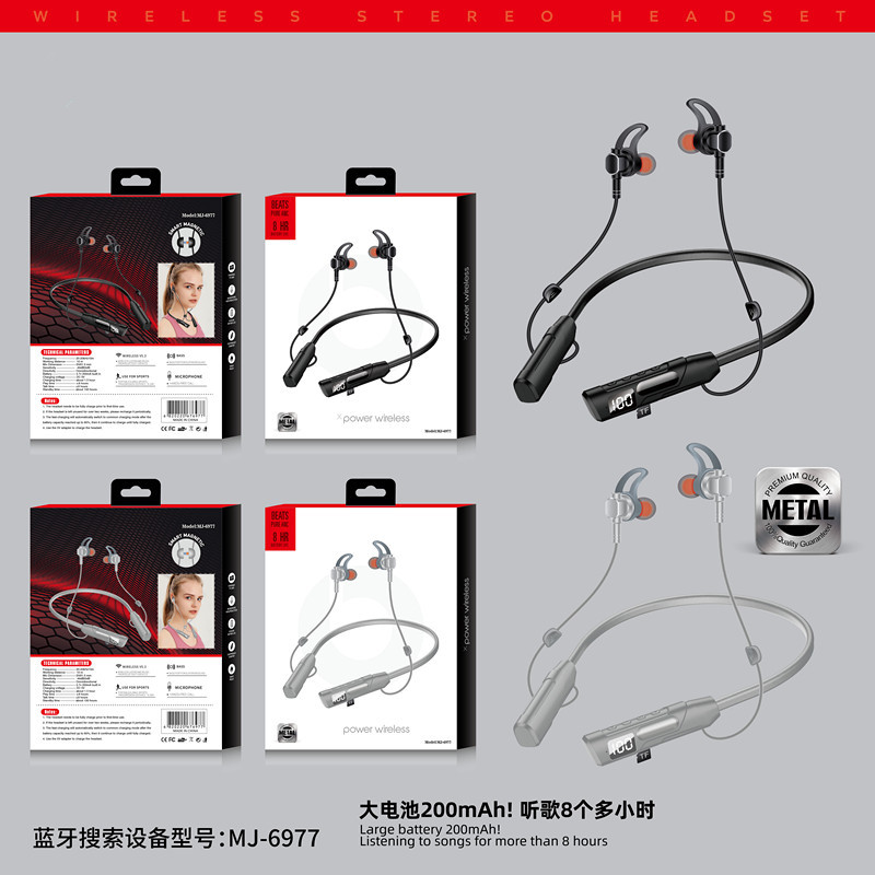 跨境外贸MJ6977挂脖式蓝牙耳机入耳式重低音超长待机金属工厂直销