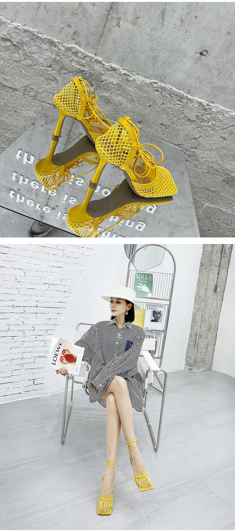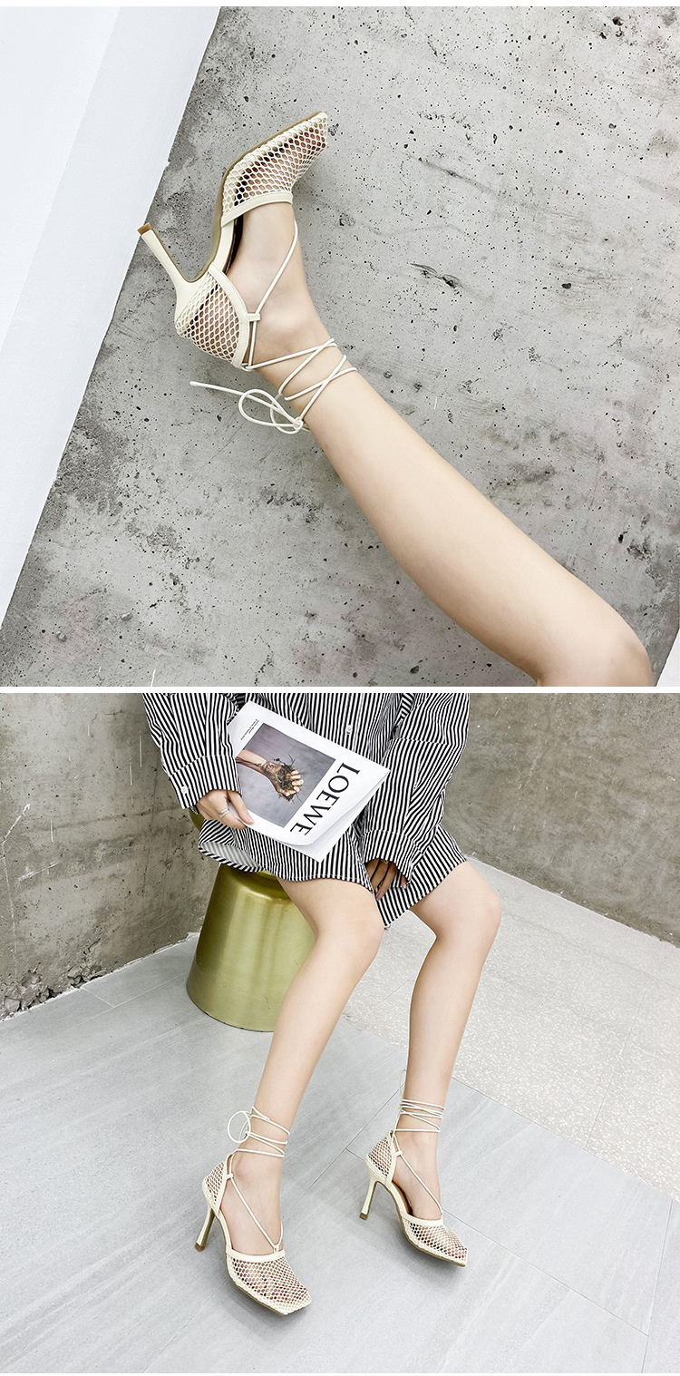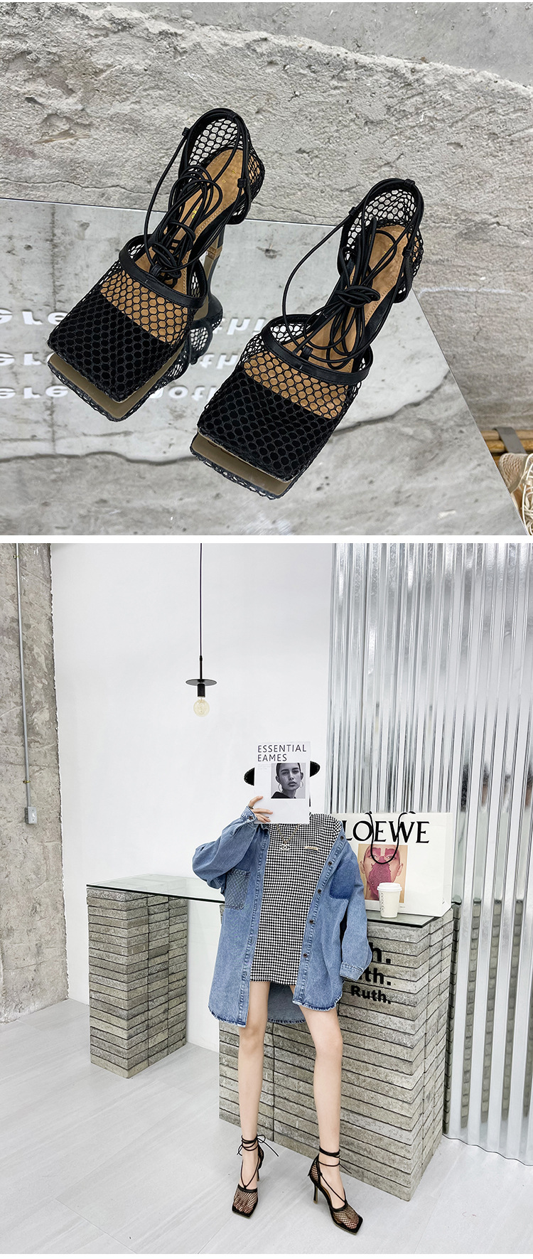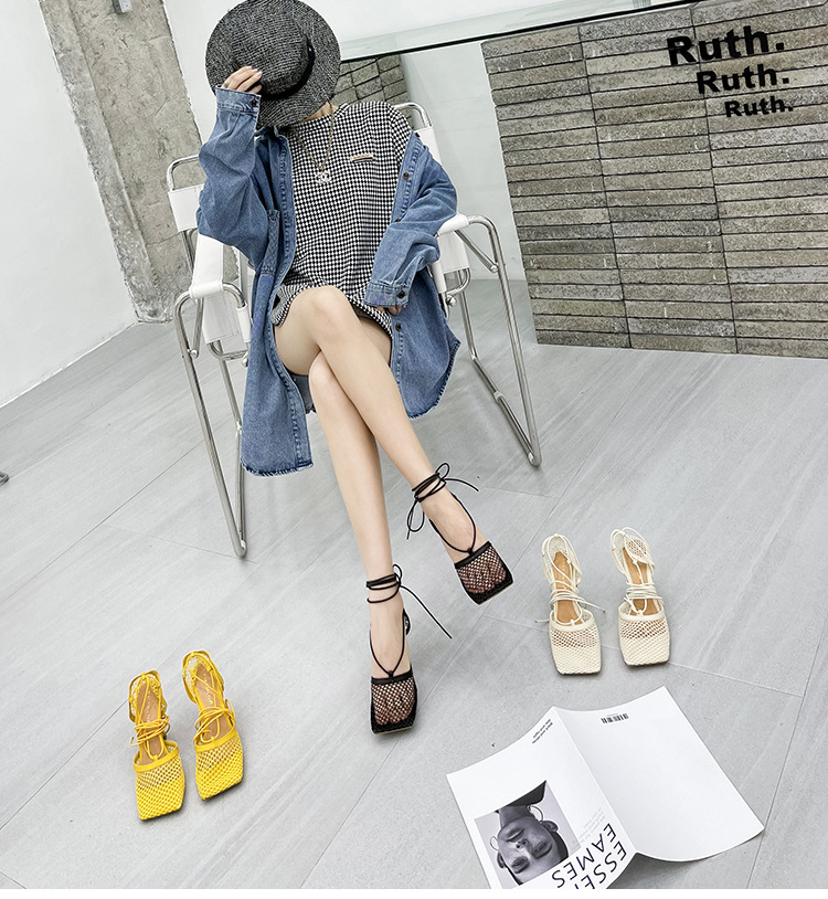 2023欧美时尚凉鞋网纱透气方头绑带女士高跟鞋979-8长期现货
