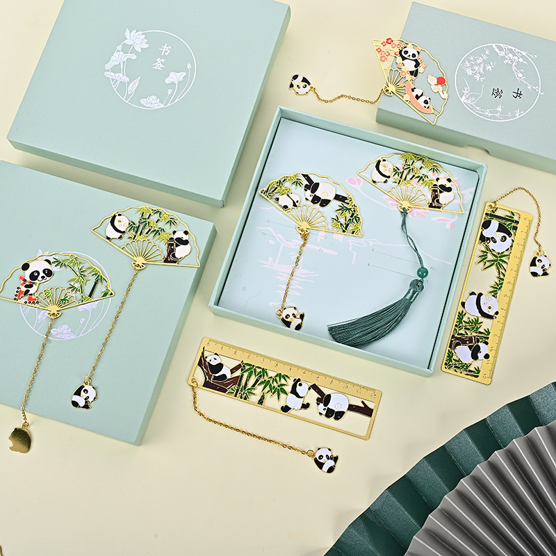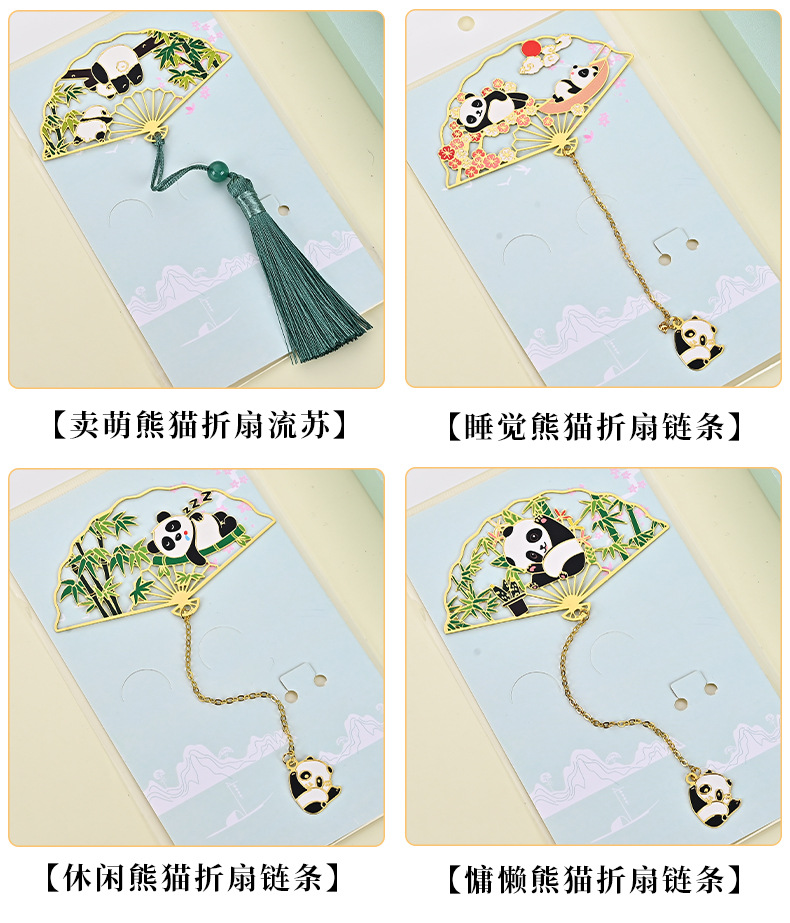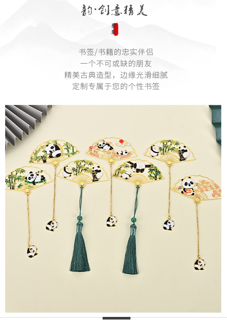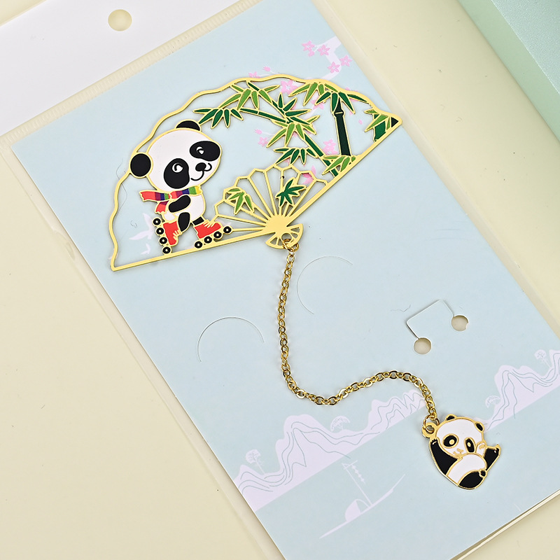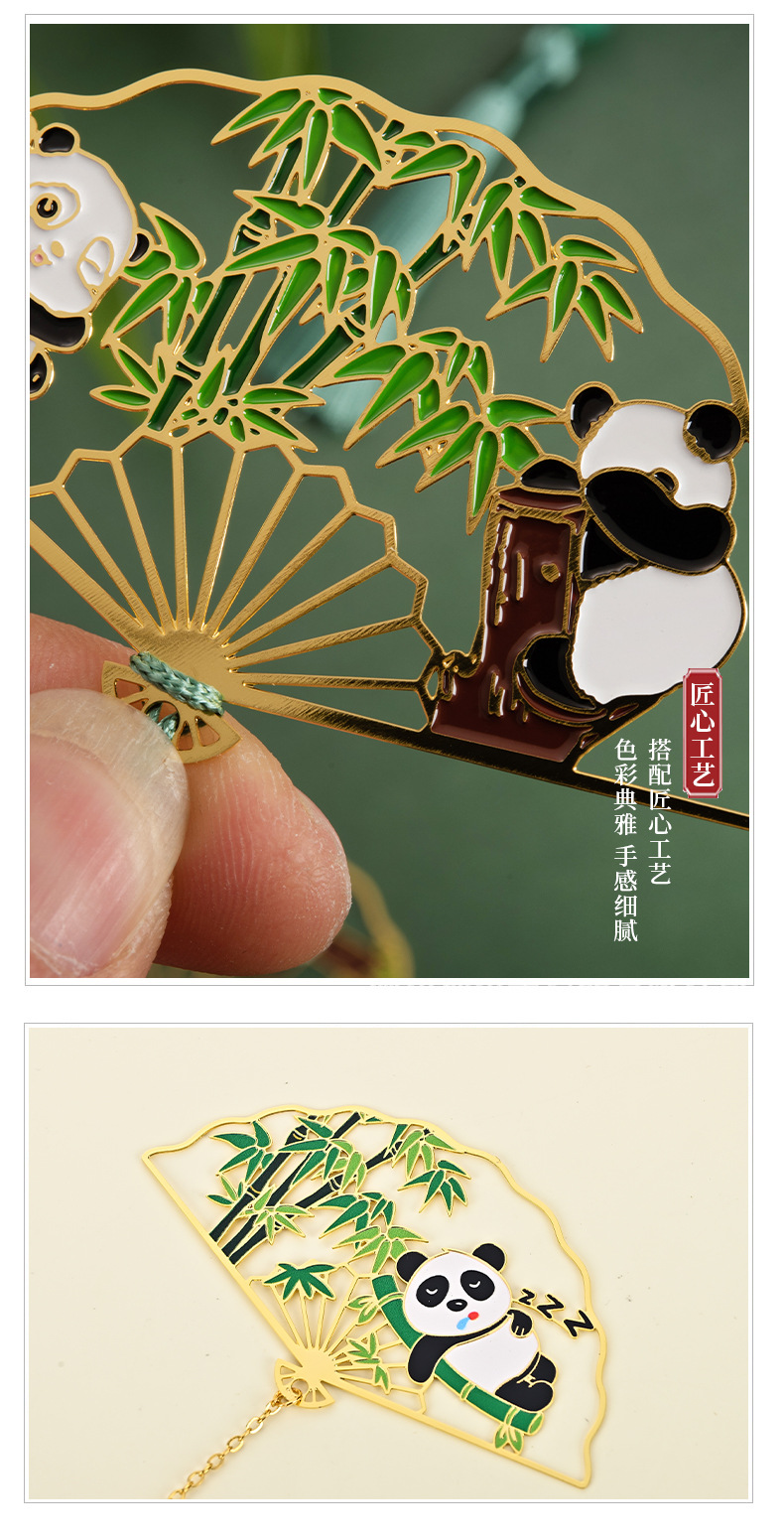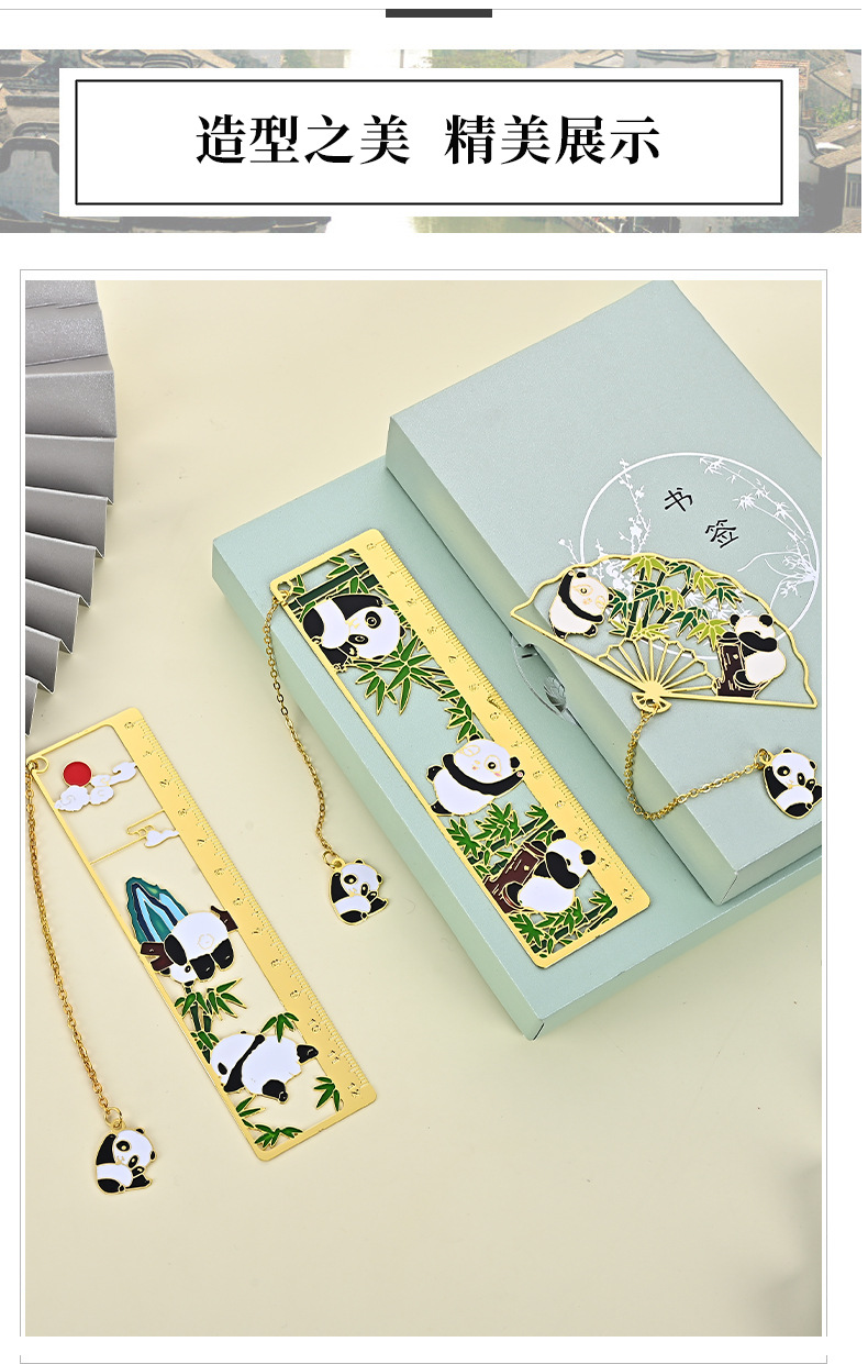 折扇文创书签批发创意可爱卡通镂空熊猫书夹黄铜尺子书签可定制