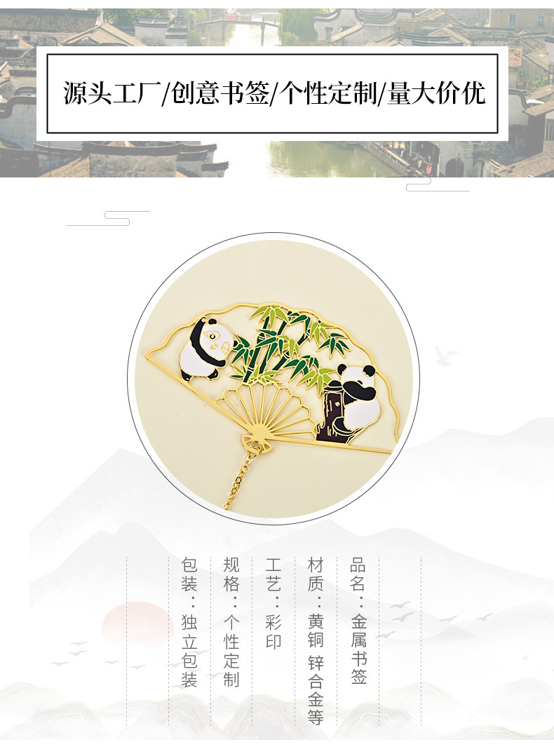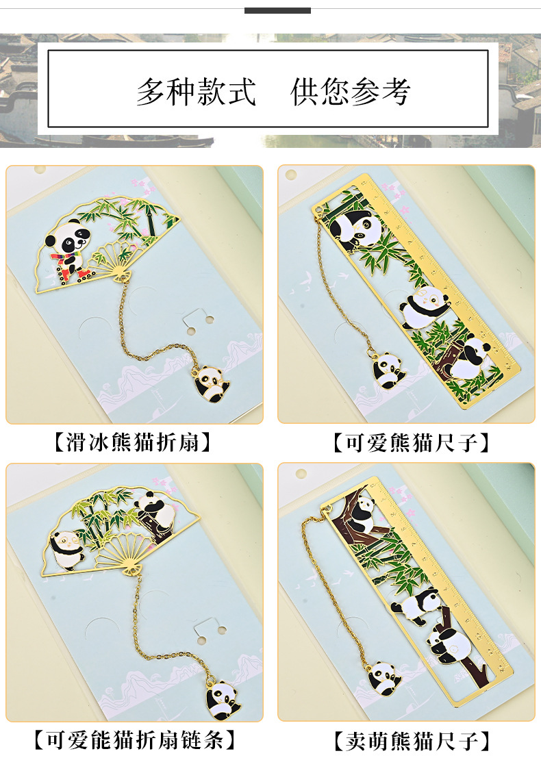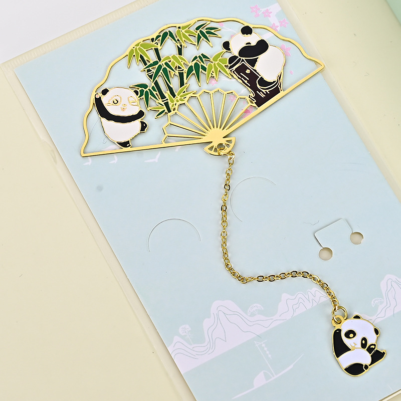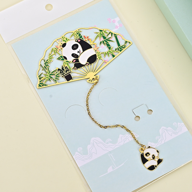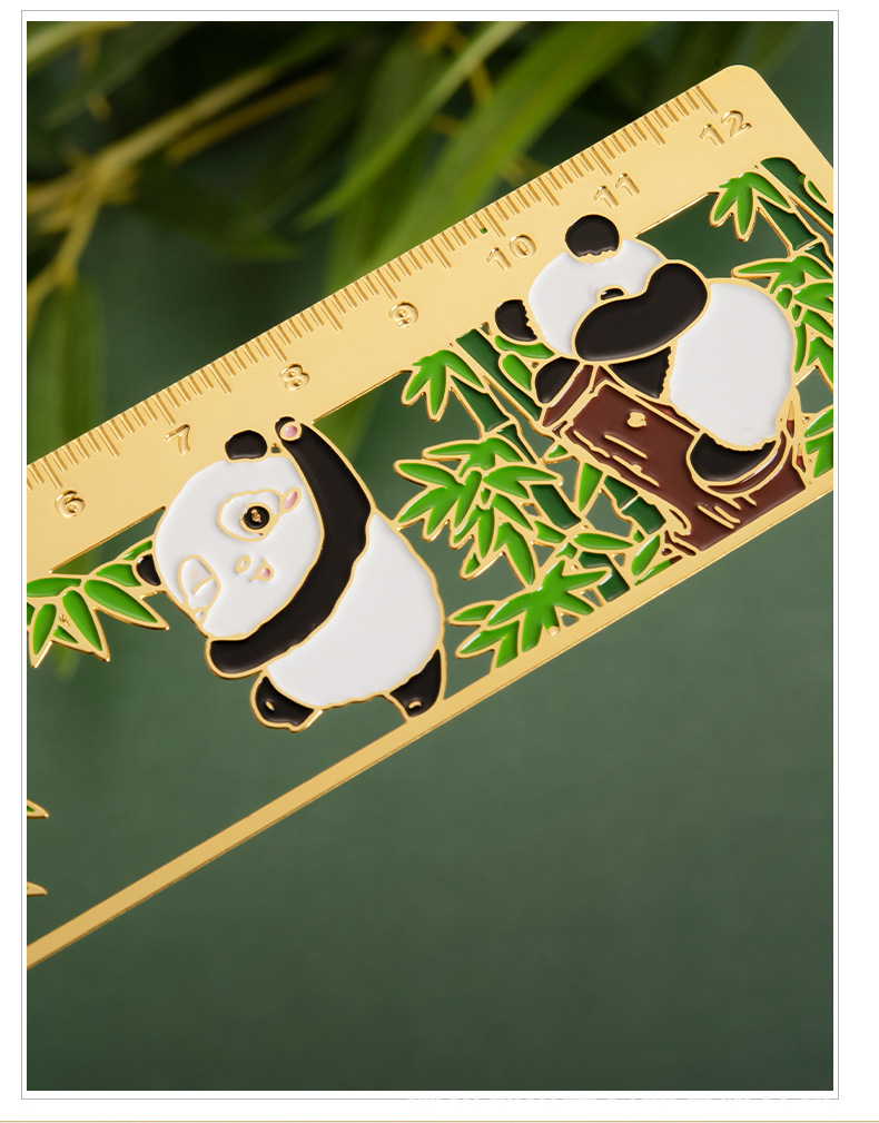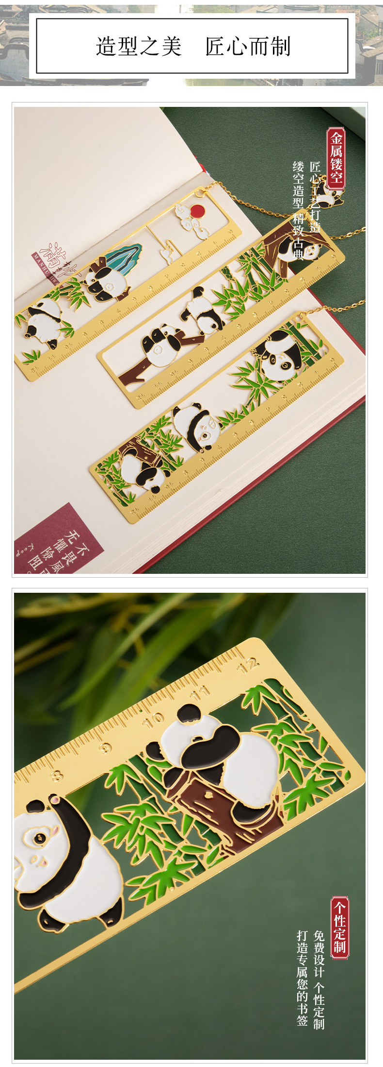 折扇文创书签批发创意可爱卡通镂空熊猫书夹黄铜尺子书签可定制