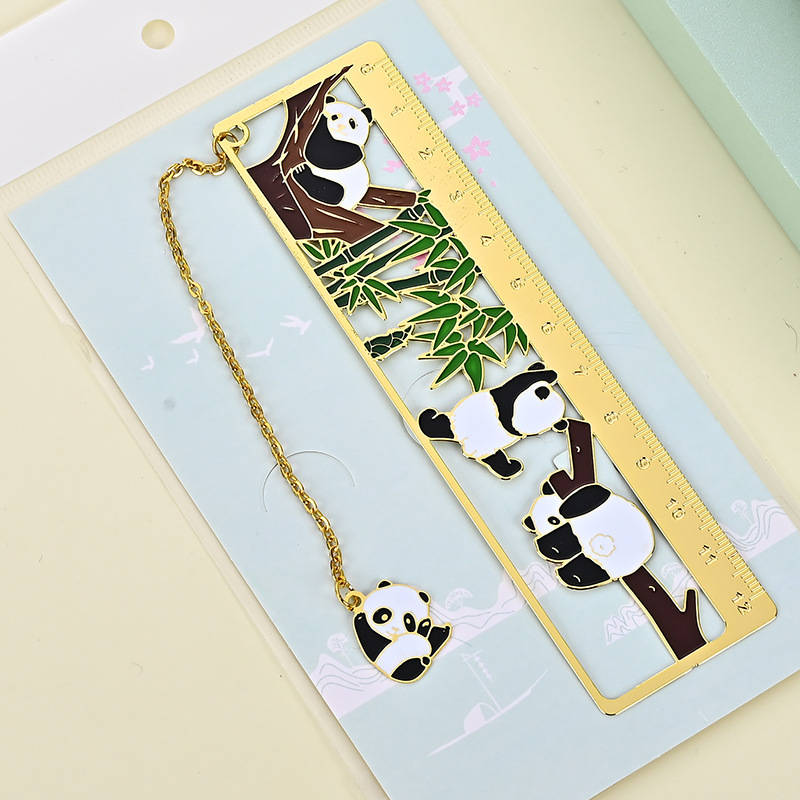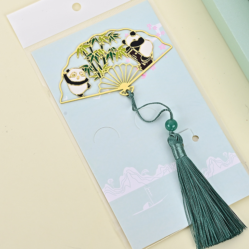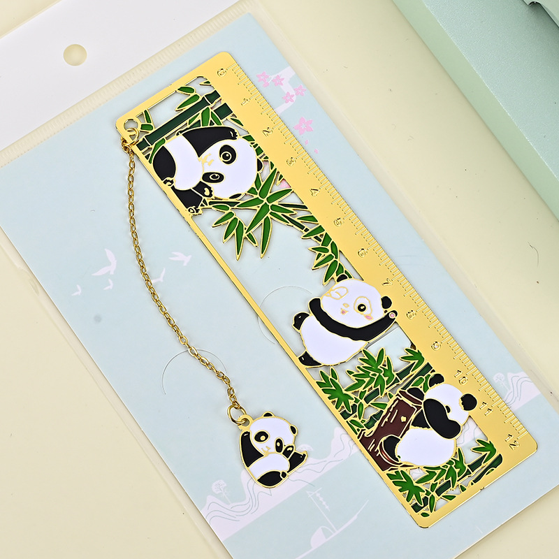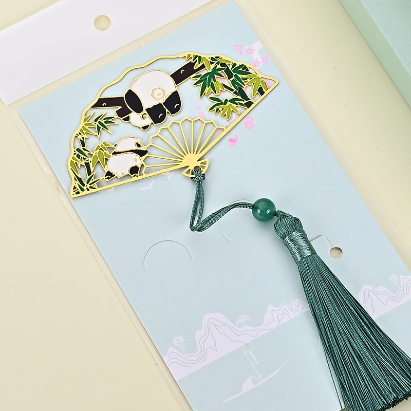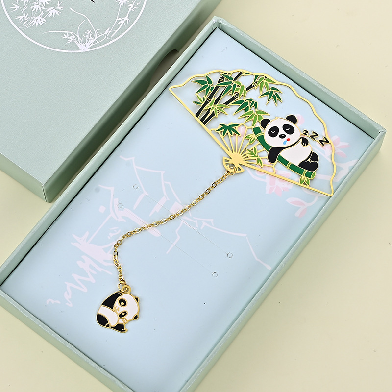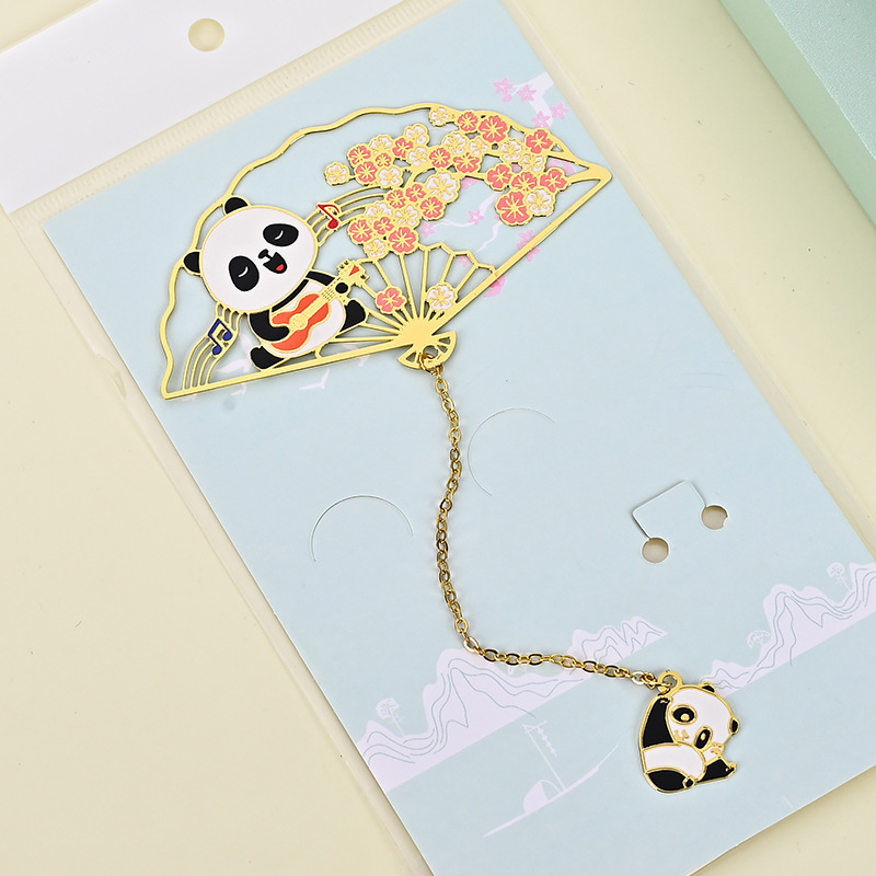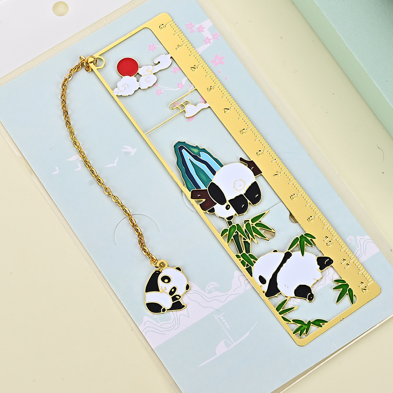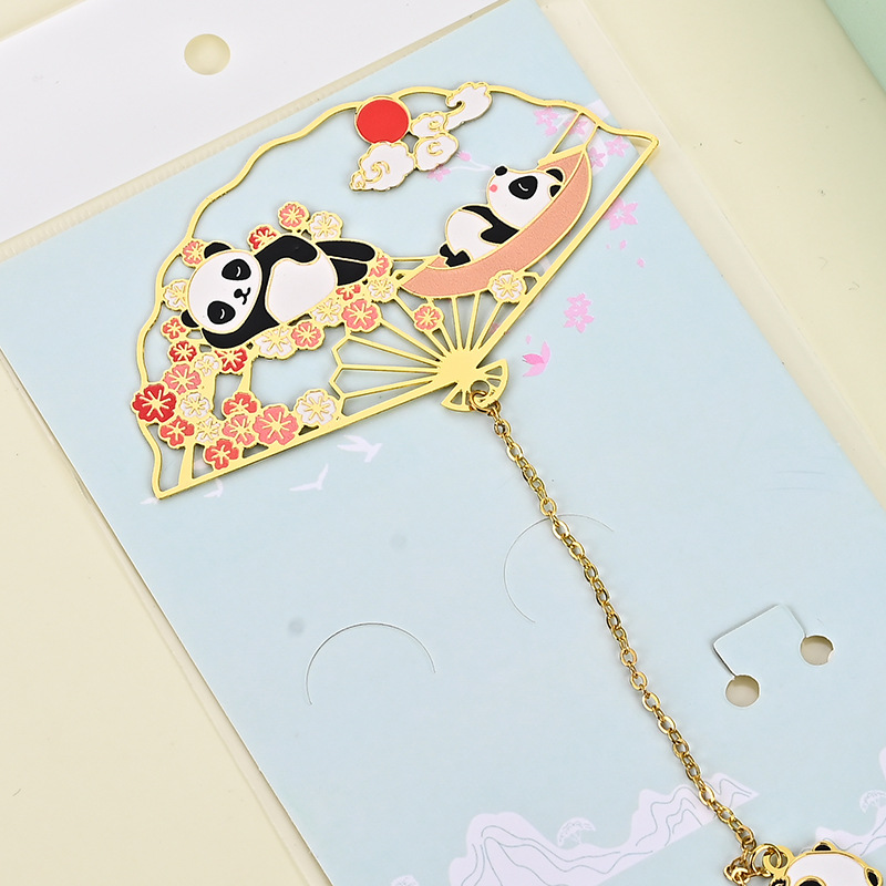 折扇文创书签批发创意可爱卡通镂空熊猫书夹黄铜尺子书签可定制