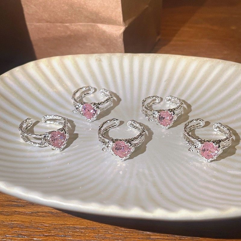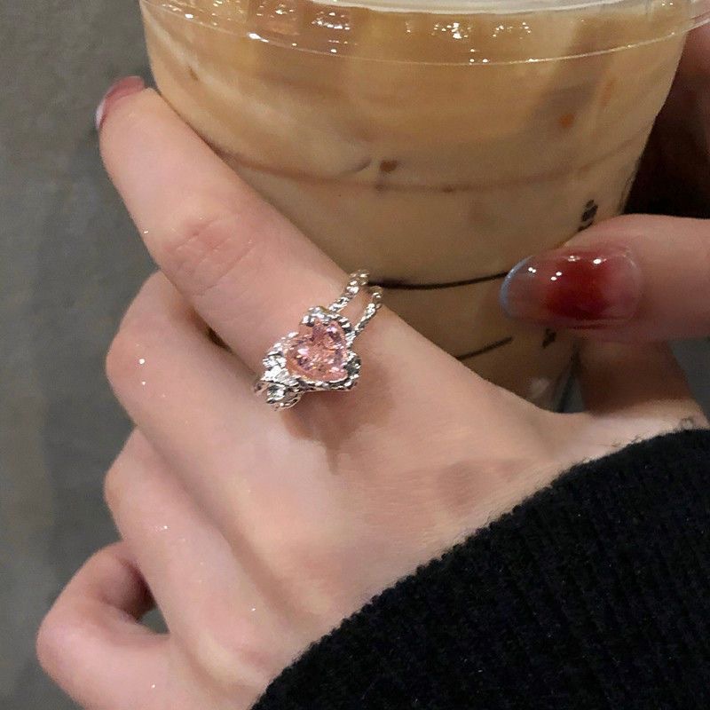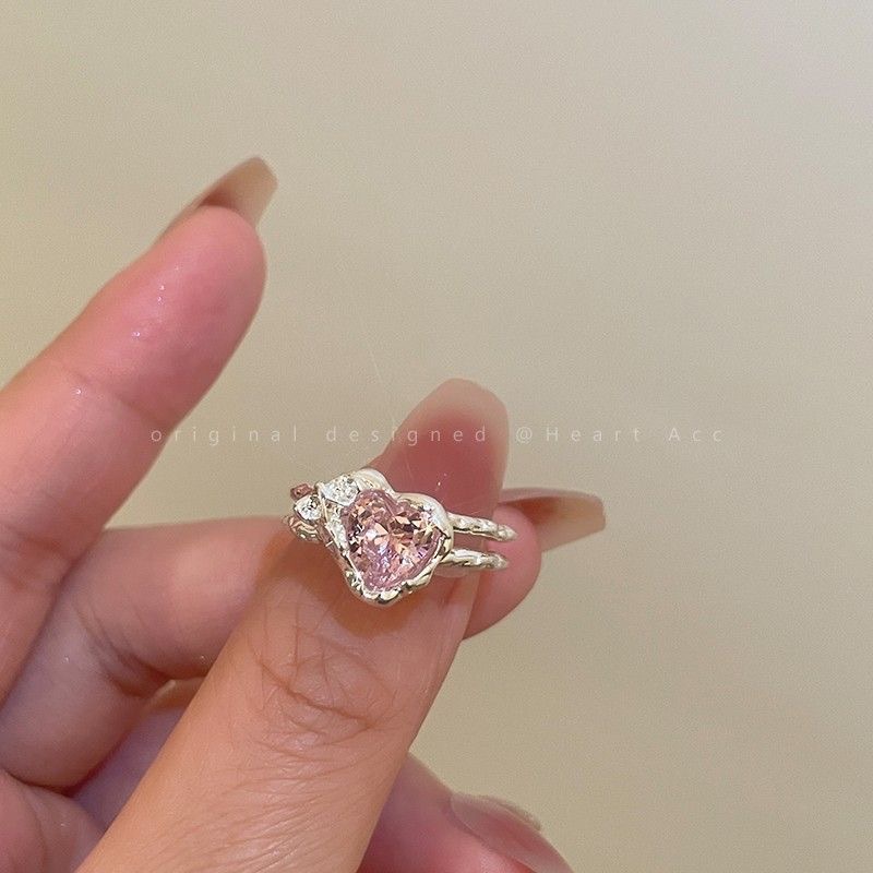 s925银爱心粉钻戒指女ins小众设计高级感开口尾戒指环素圈食指戒