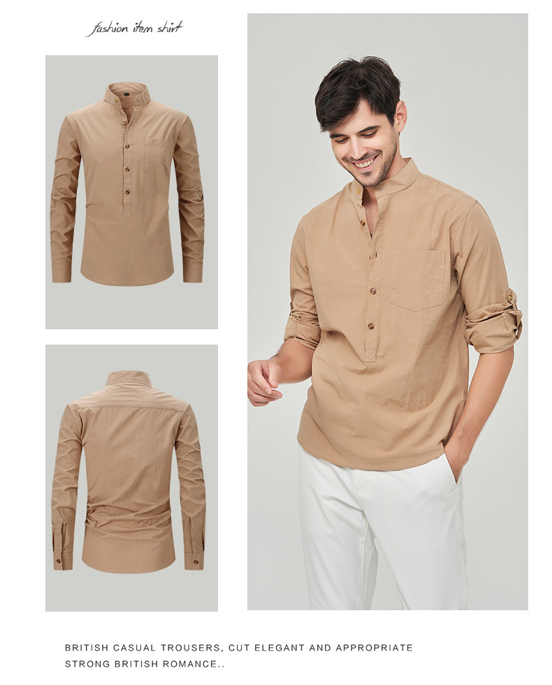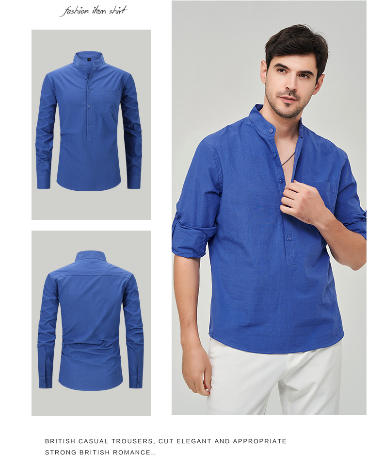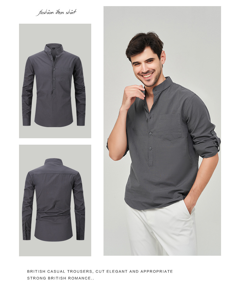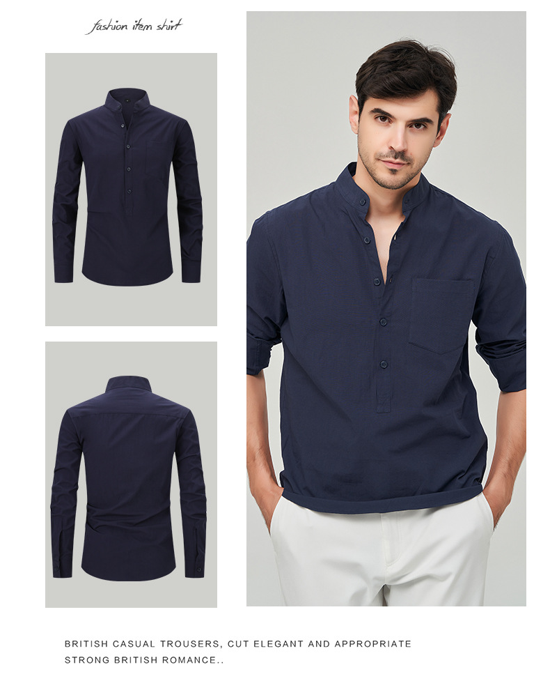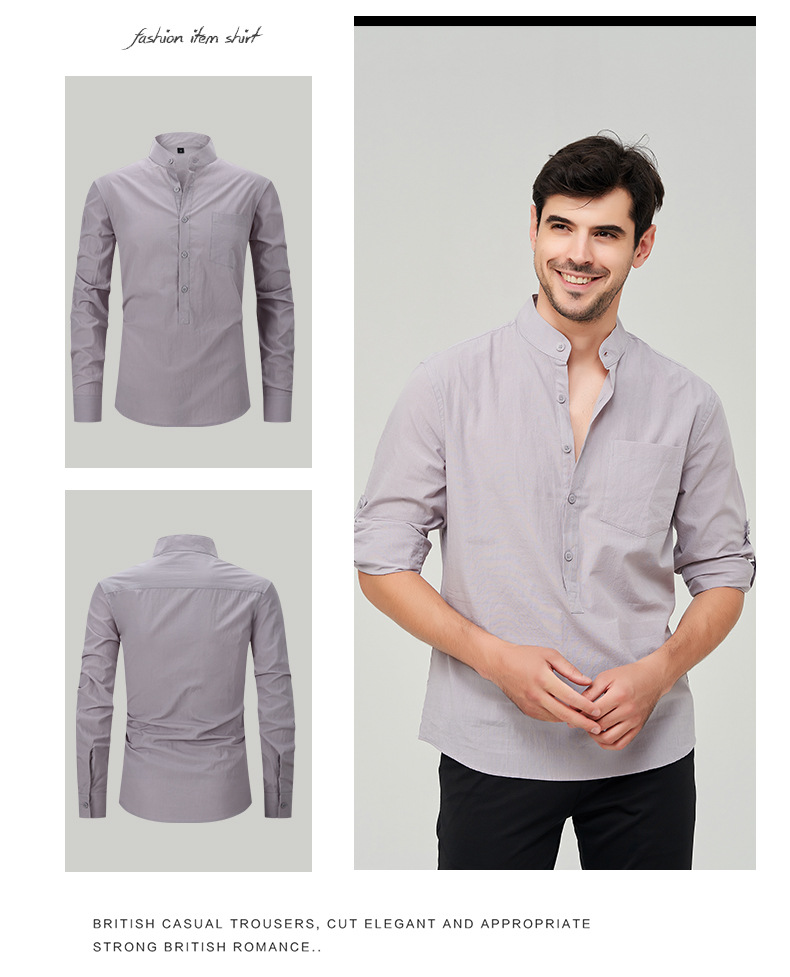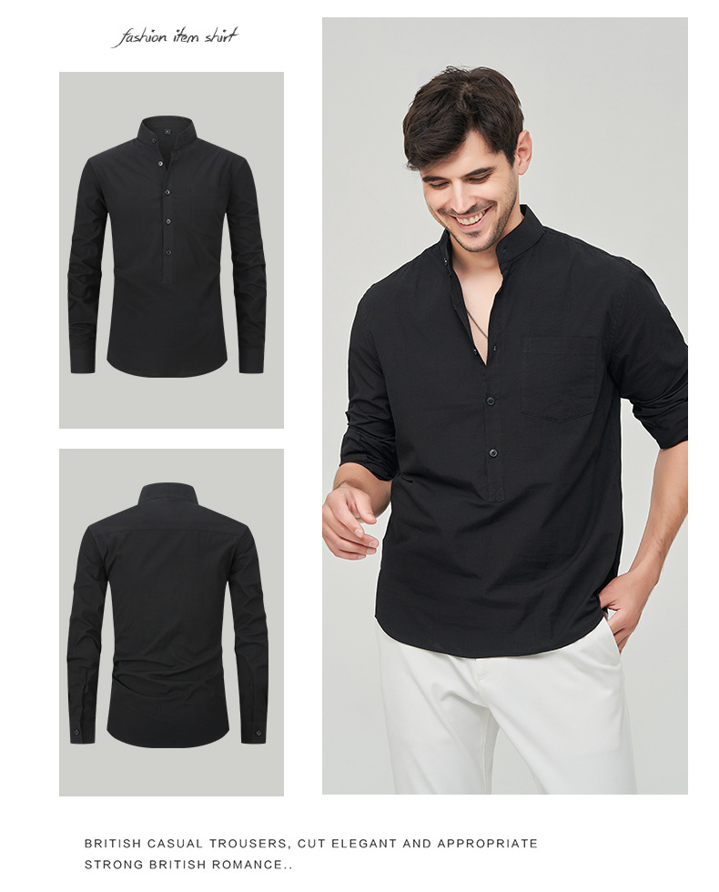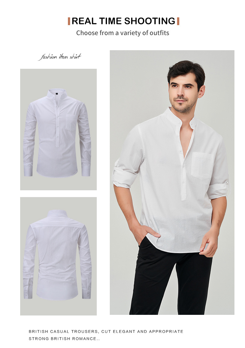 跨境外贸春季男装纯棉亨利衫白衬衣长袖男全棉免烫衬衫痞帅男批发