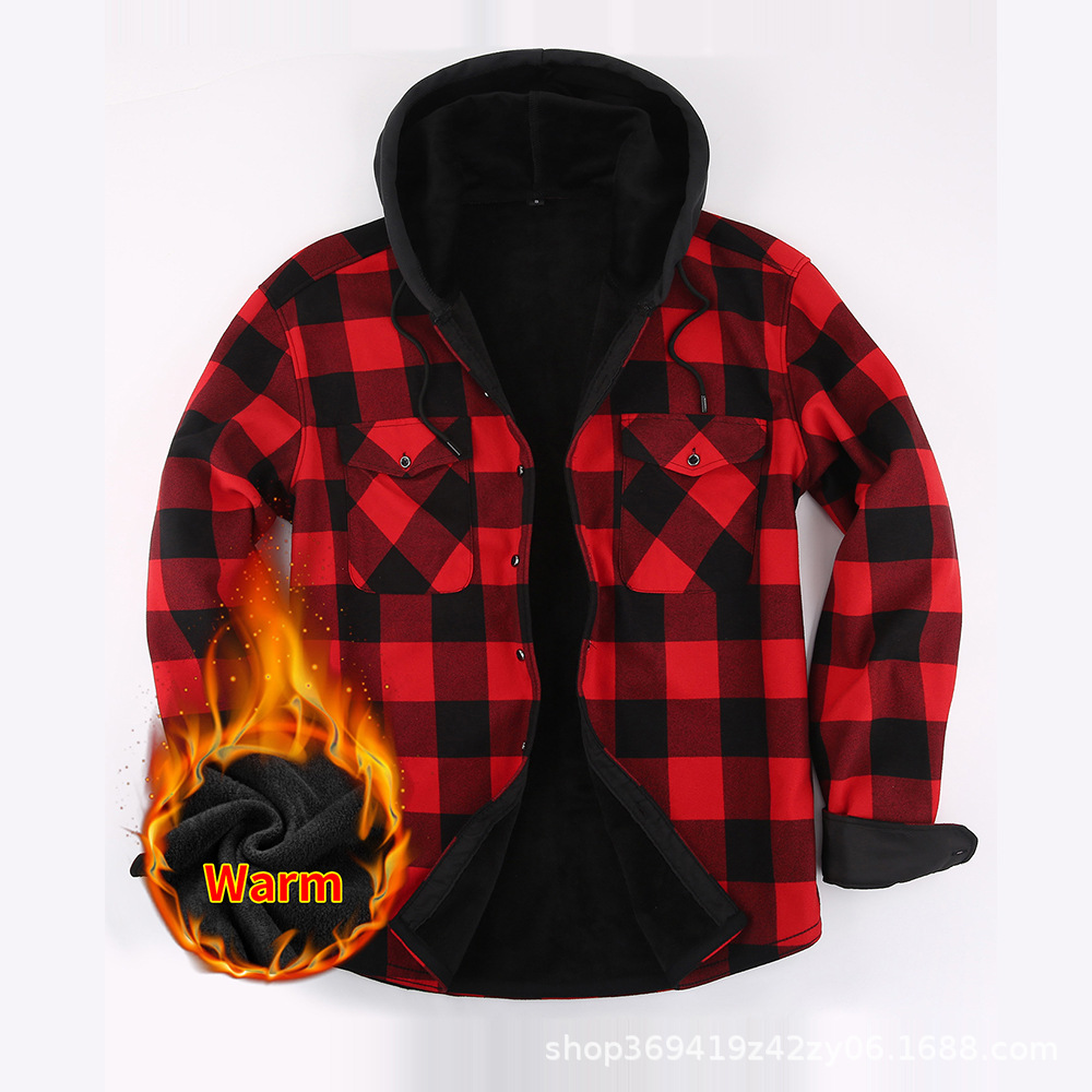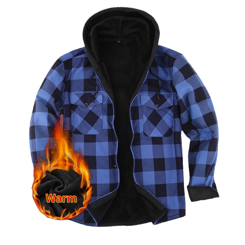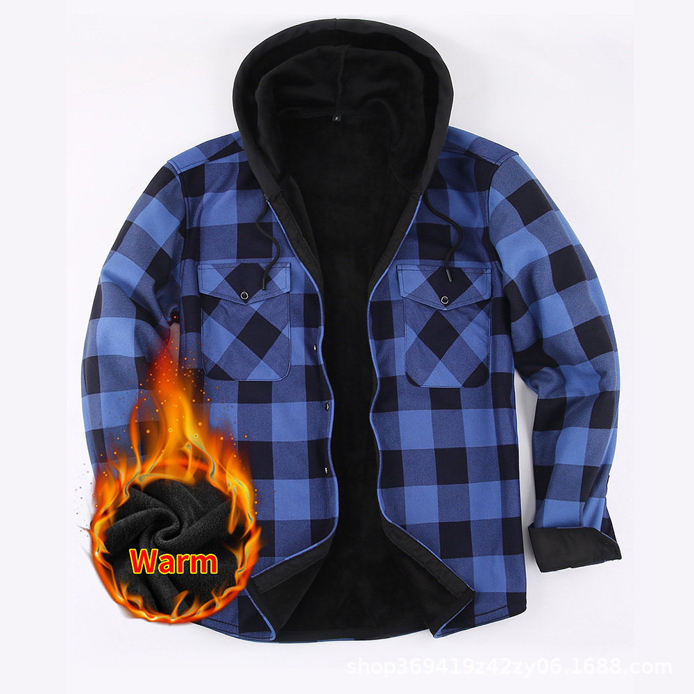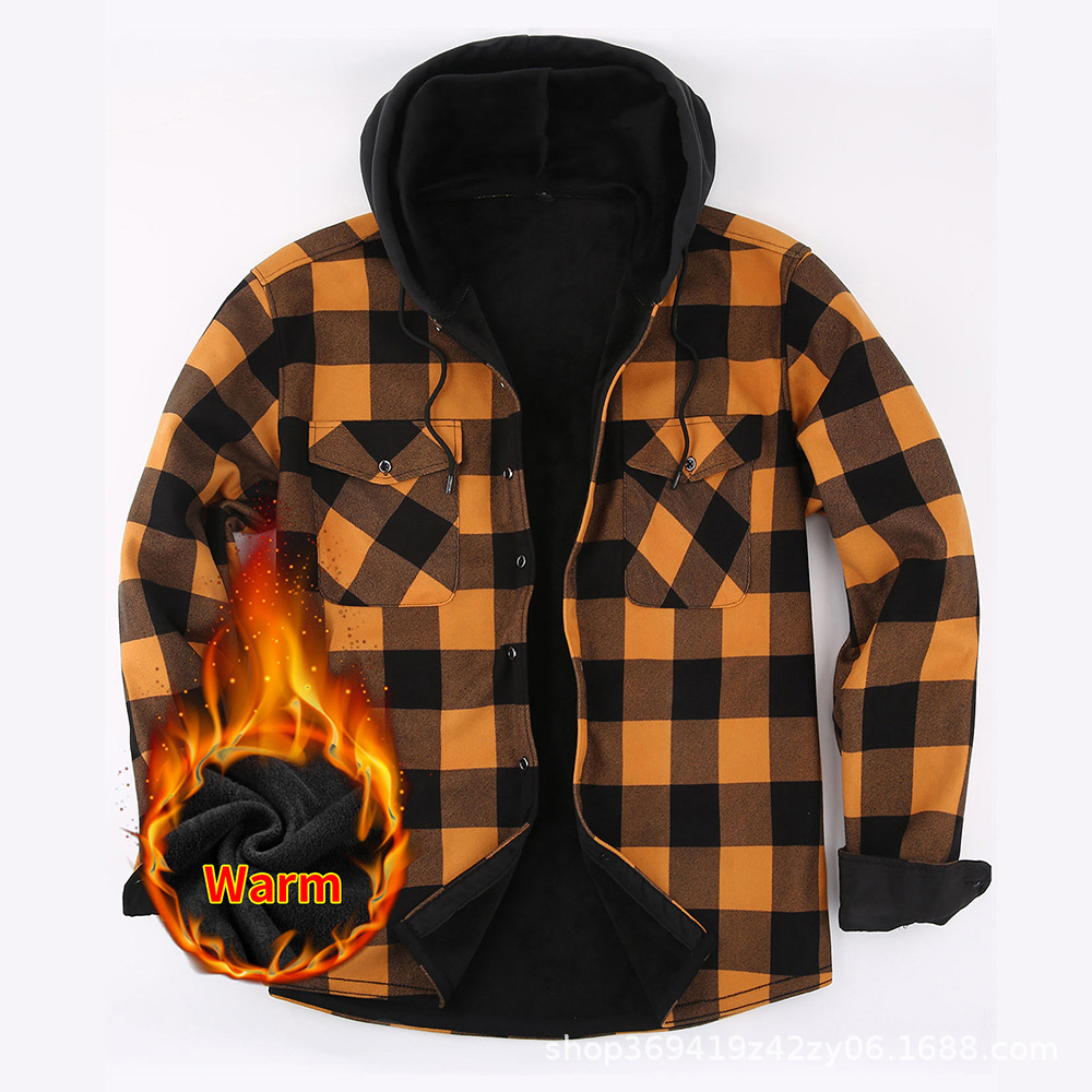亚马逊爆款保暖衬衣男加绒加厚法兰绒格子美式衬衫男装寸衣一体绒
