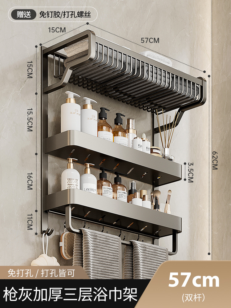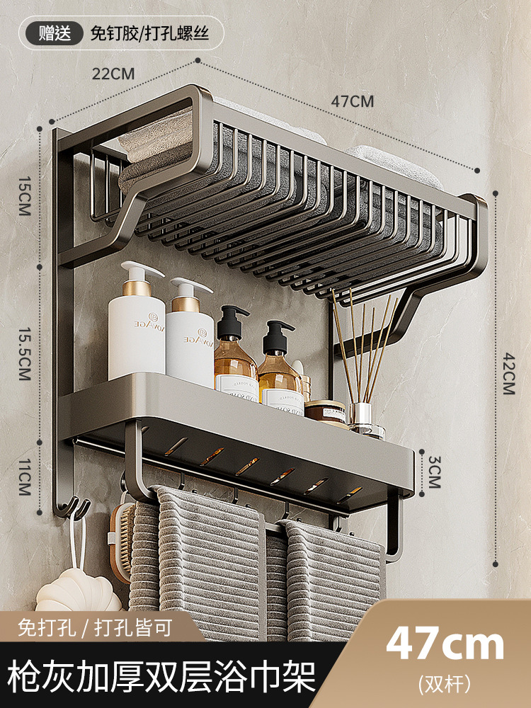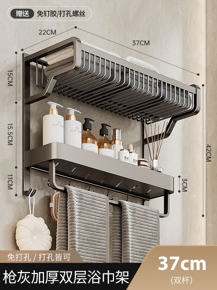 毛巾架卫生间置物架一体免打孔壁挂浴室厕所卫浴套装太空铝浴巾架