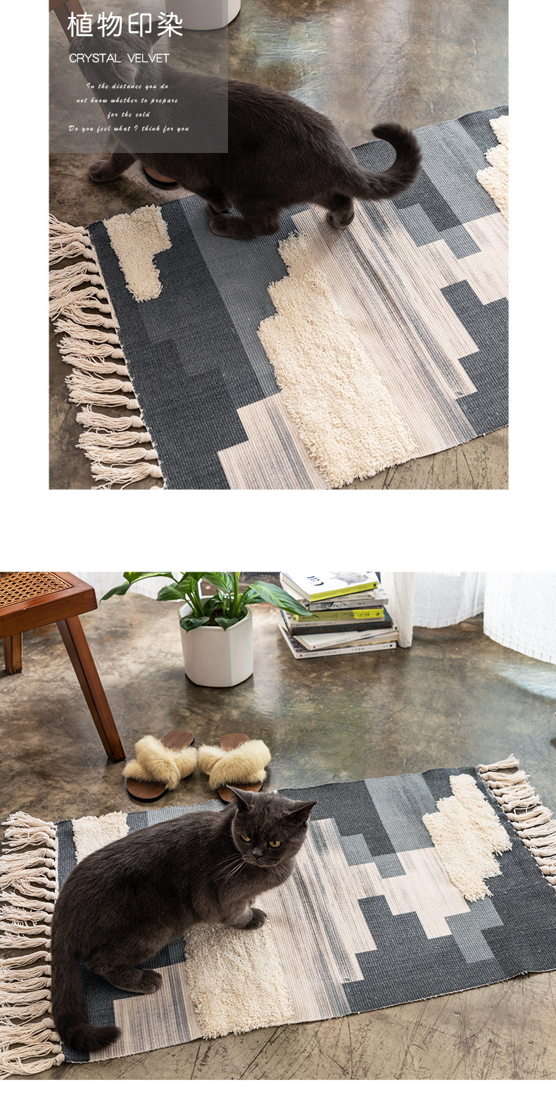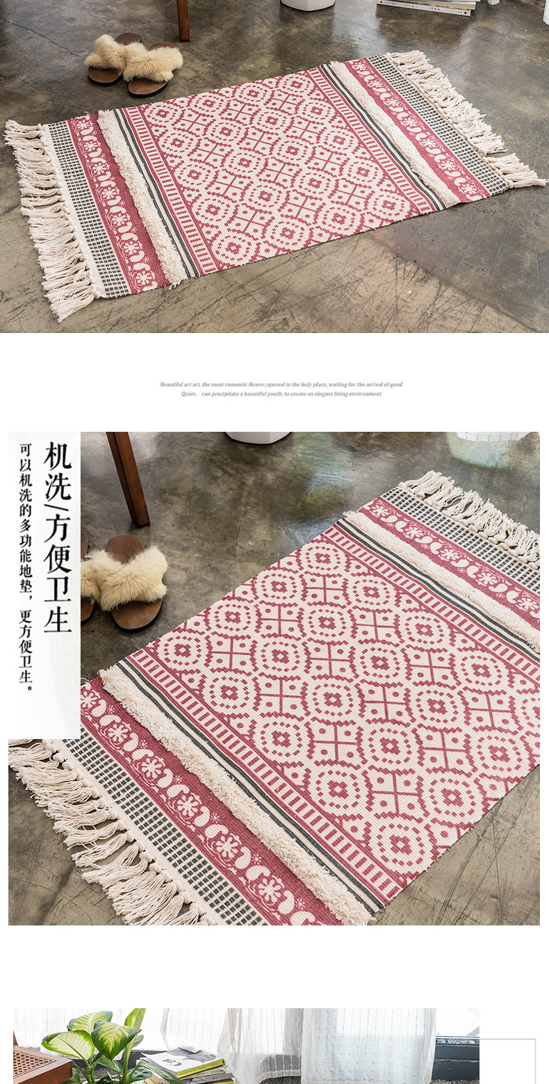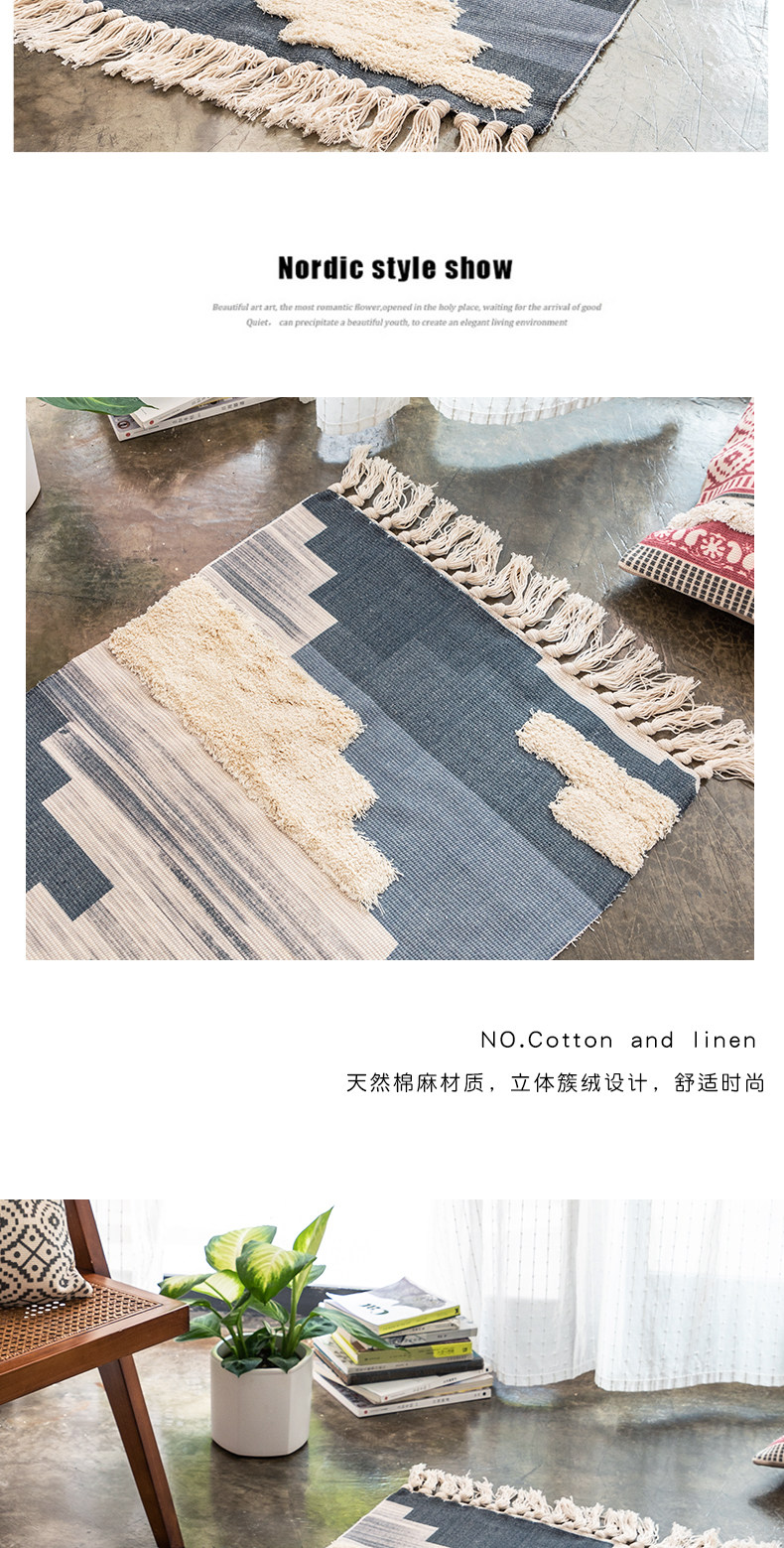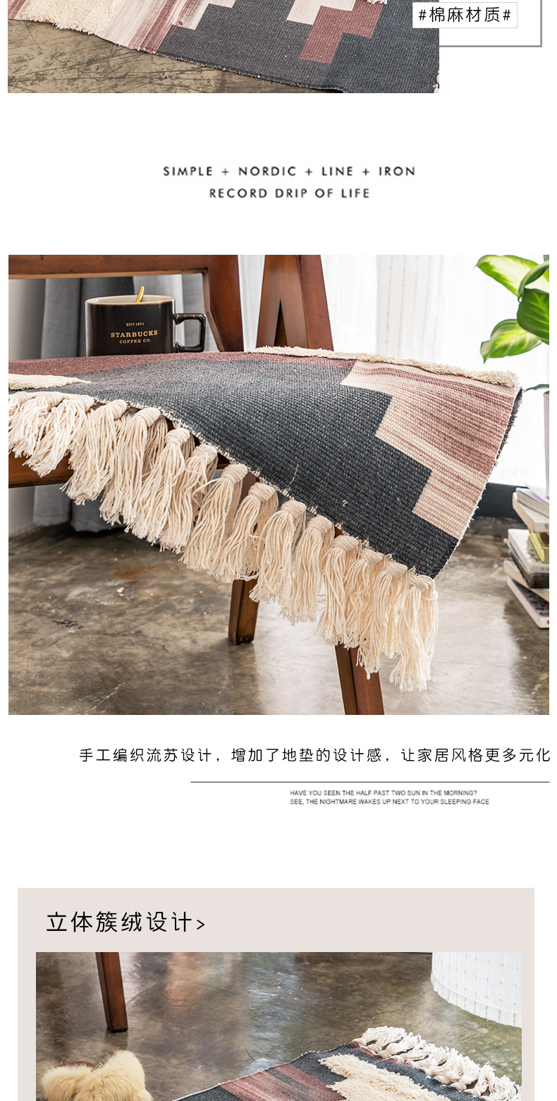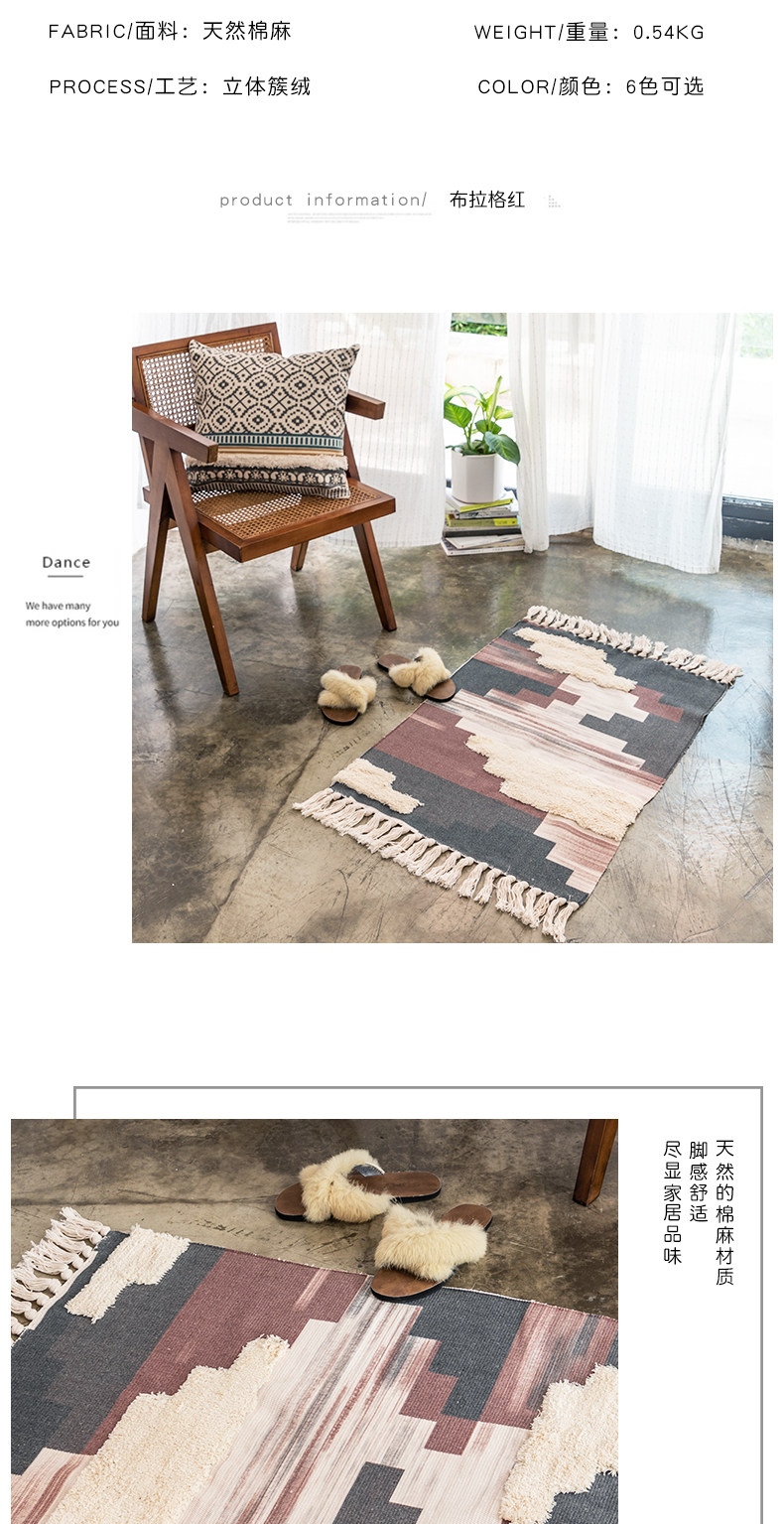 北欧复古棉麻簇绒地垫卧室床边脚垫客厅沙发茶几印度手工流苏地毯