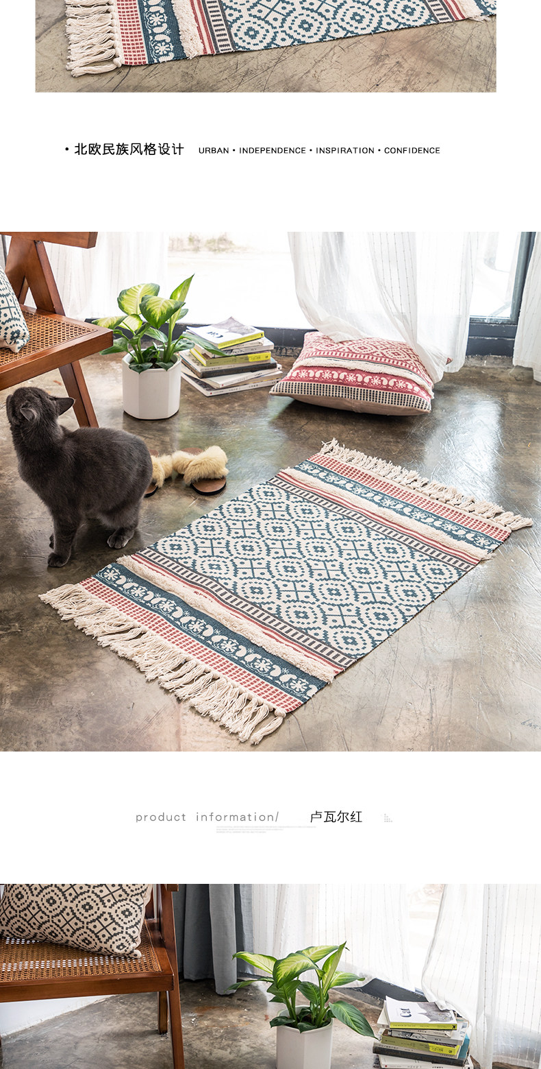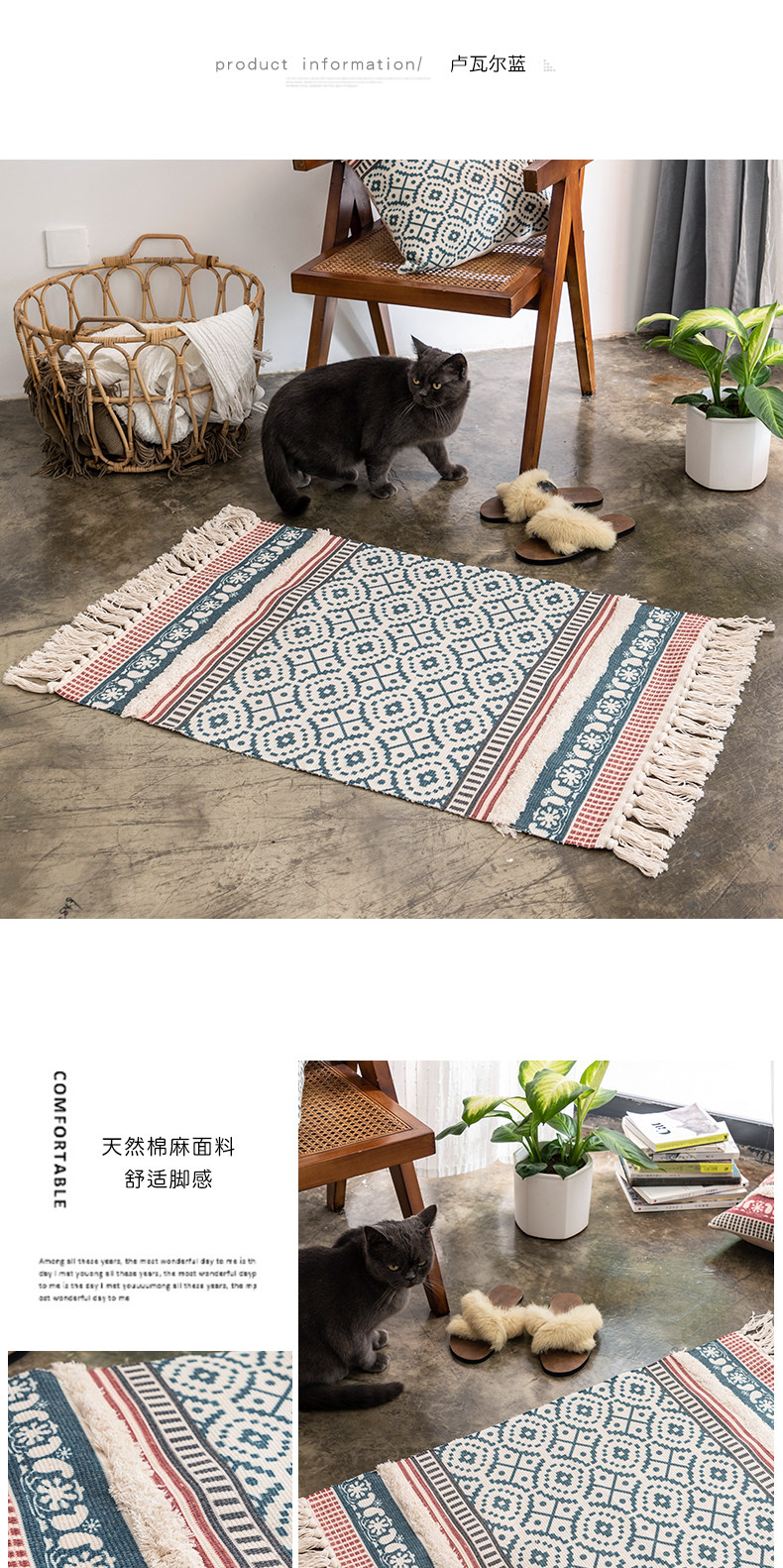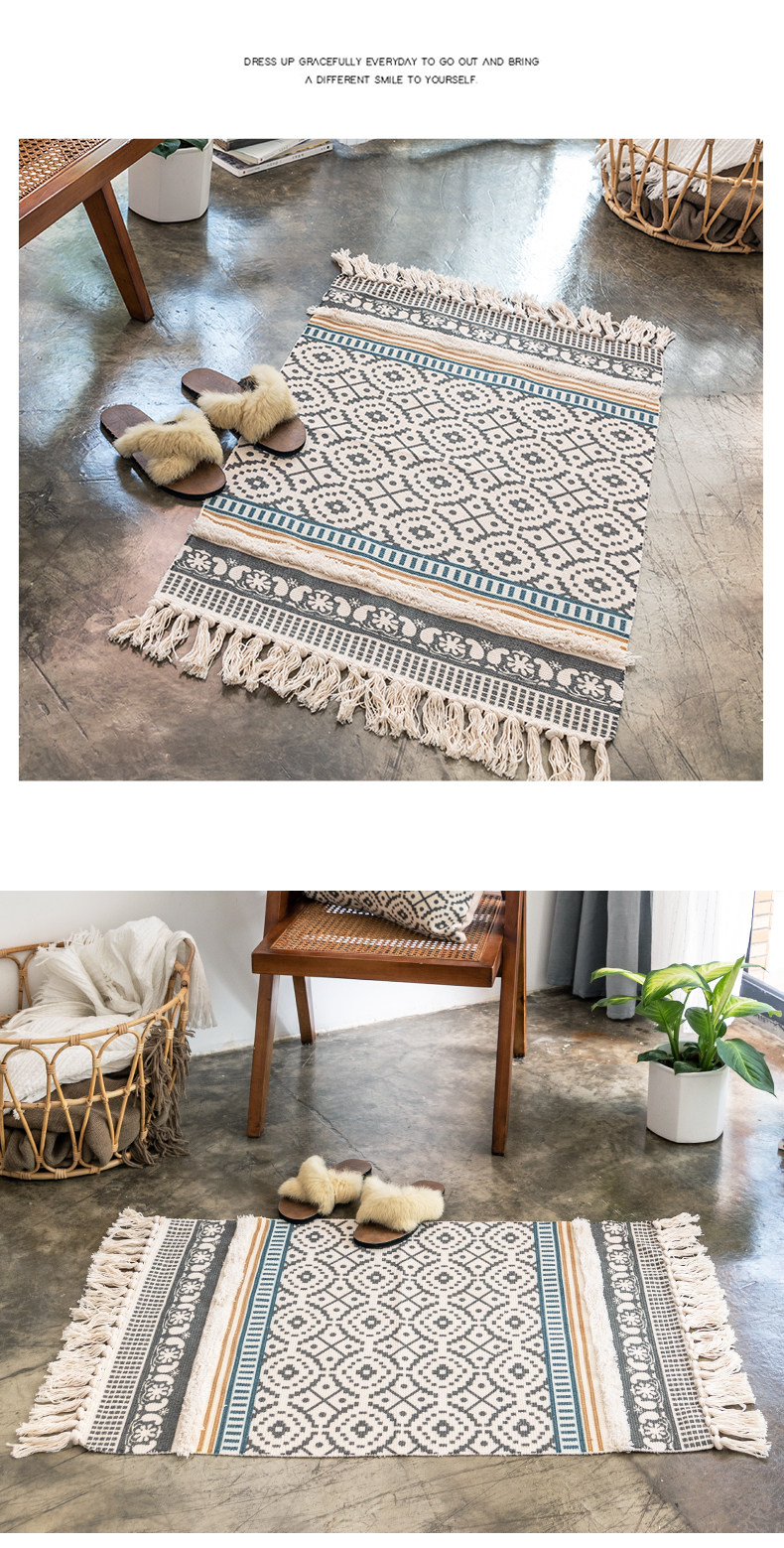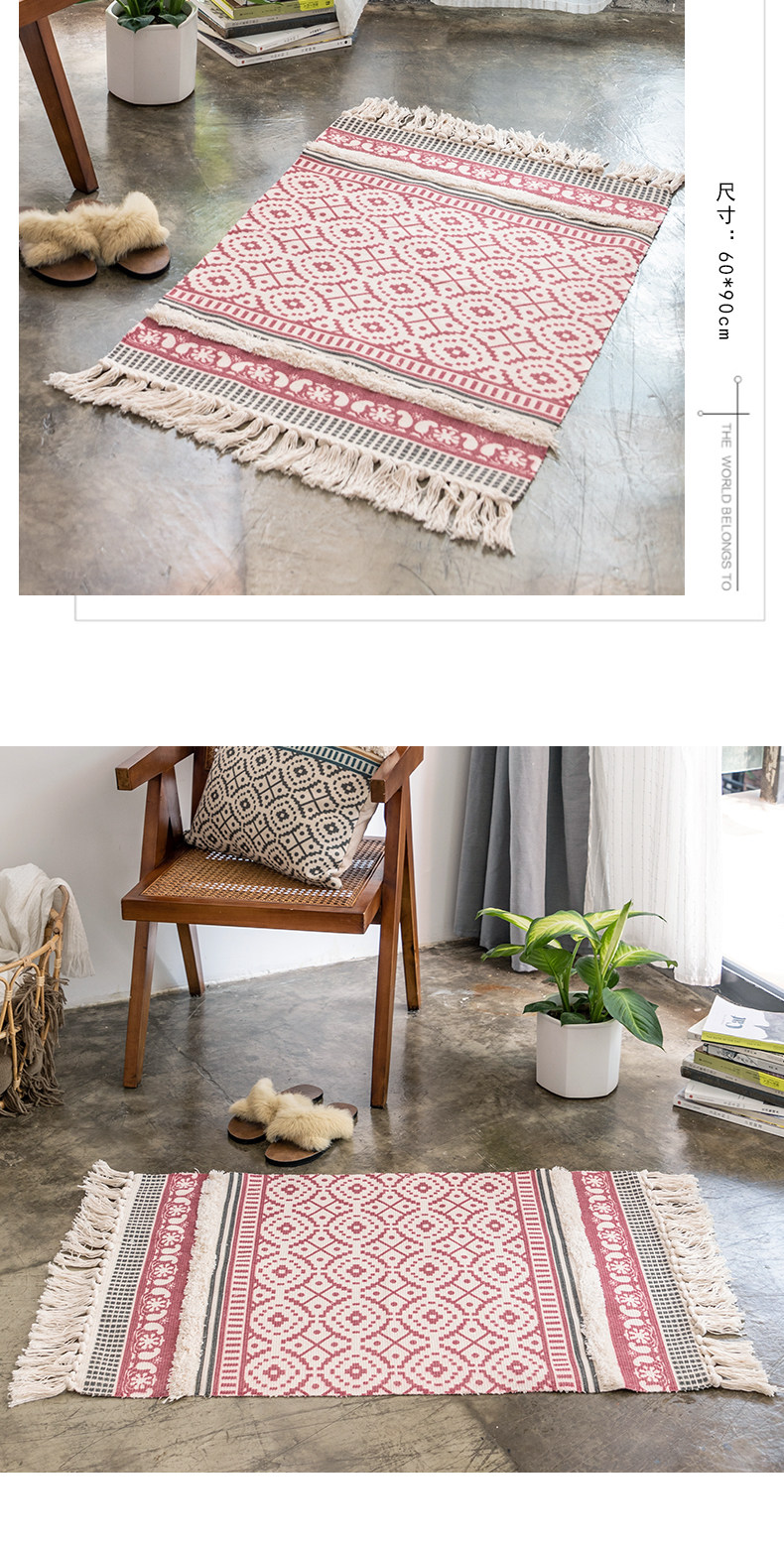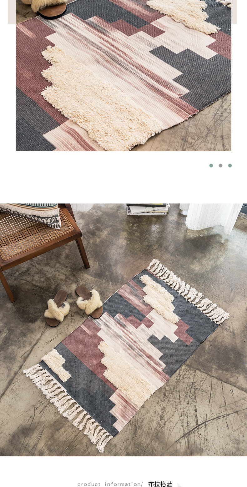 北欧复古棉麻簇绒地垫卧室床边脚垫客厅沙发茶几印度手工流苏地毯