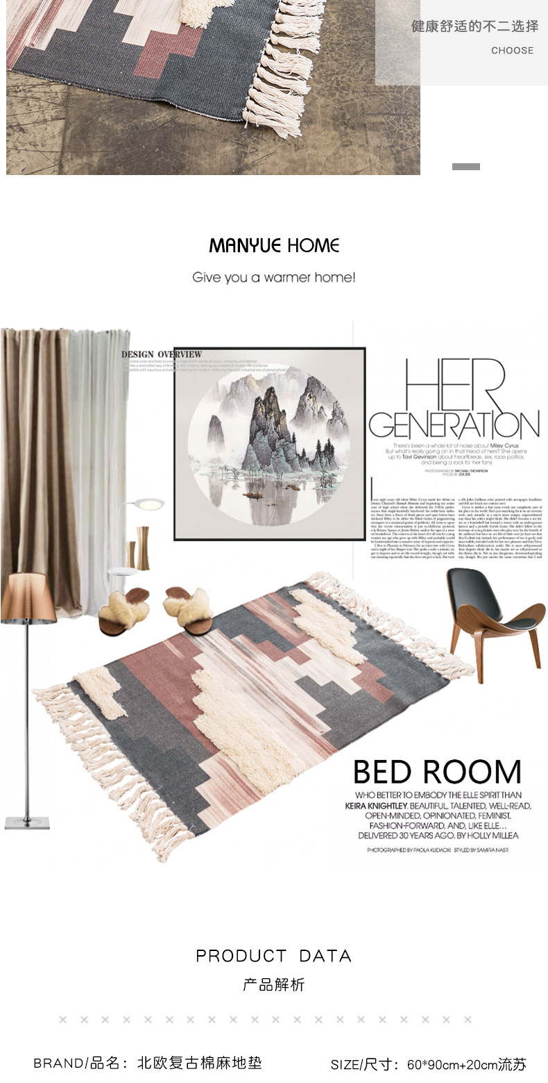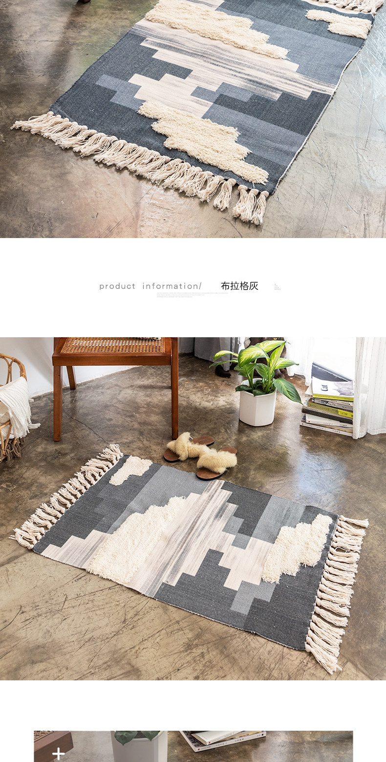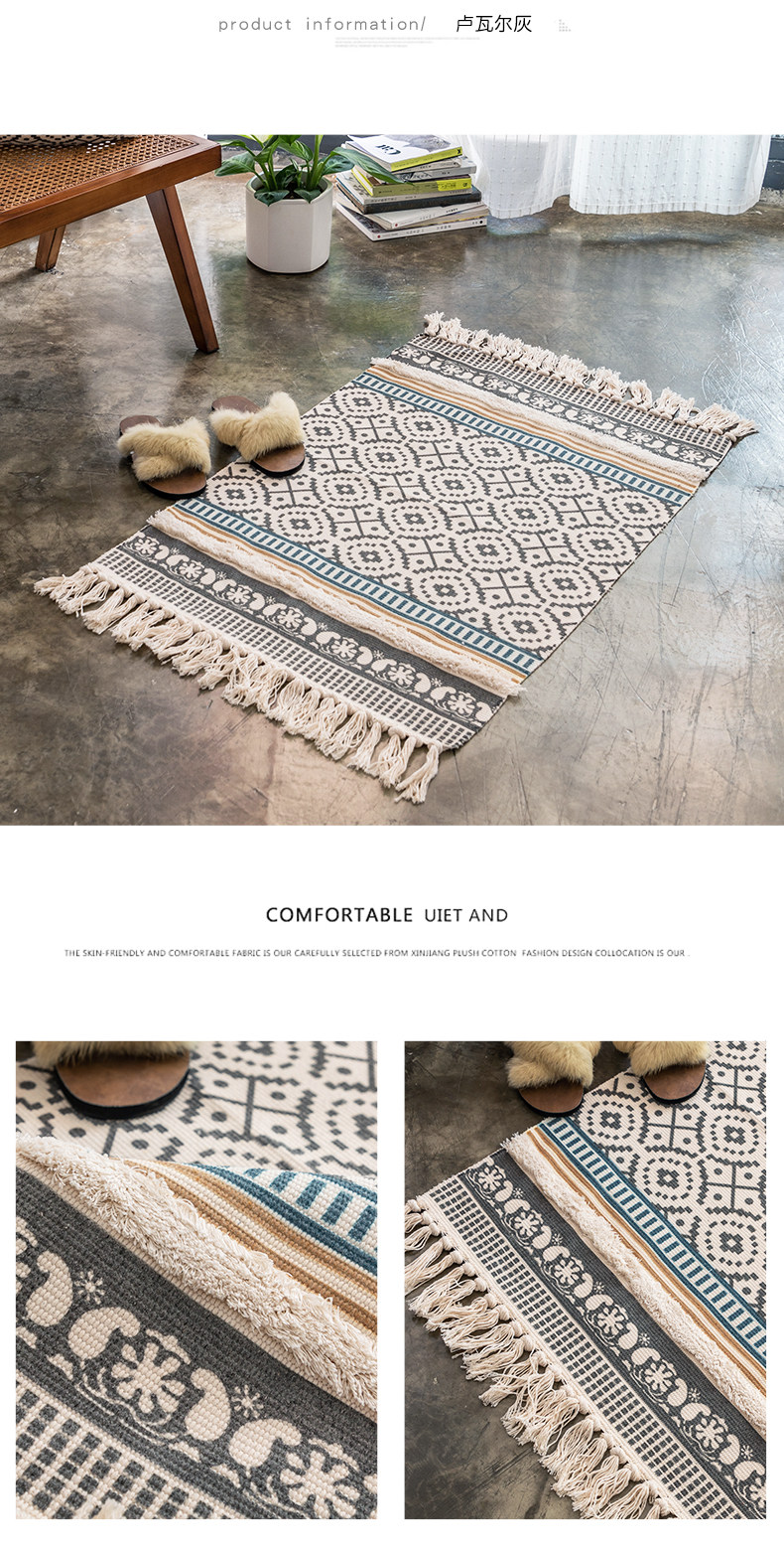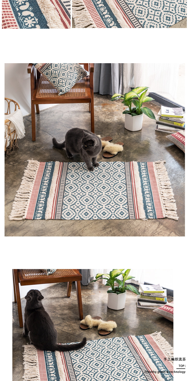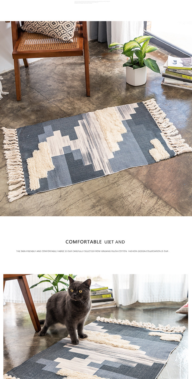 北欧复古棉麻簇绒地垫卧室床边脚垫客厅沙发茶几印度手工流苏地毯