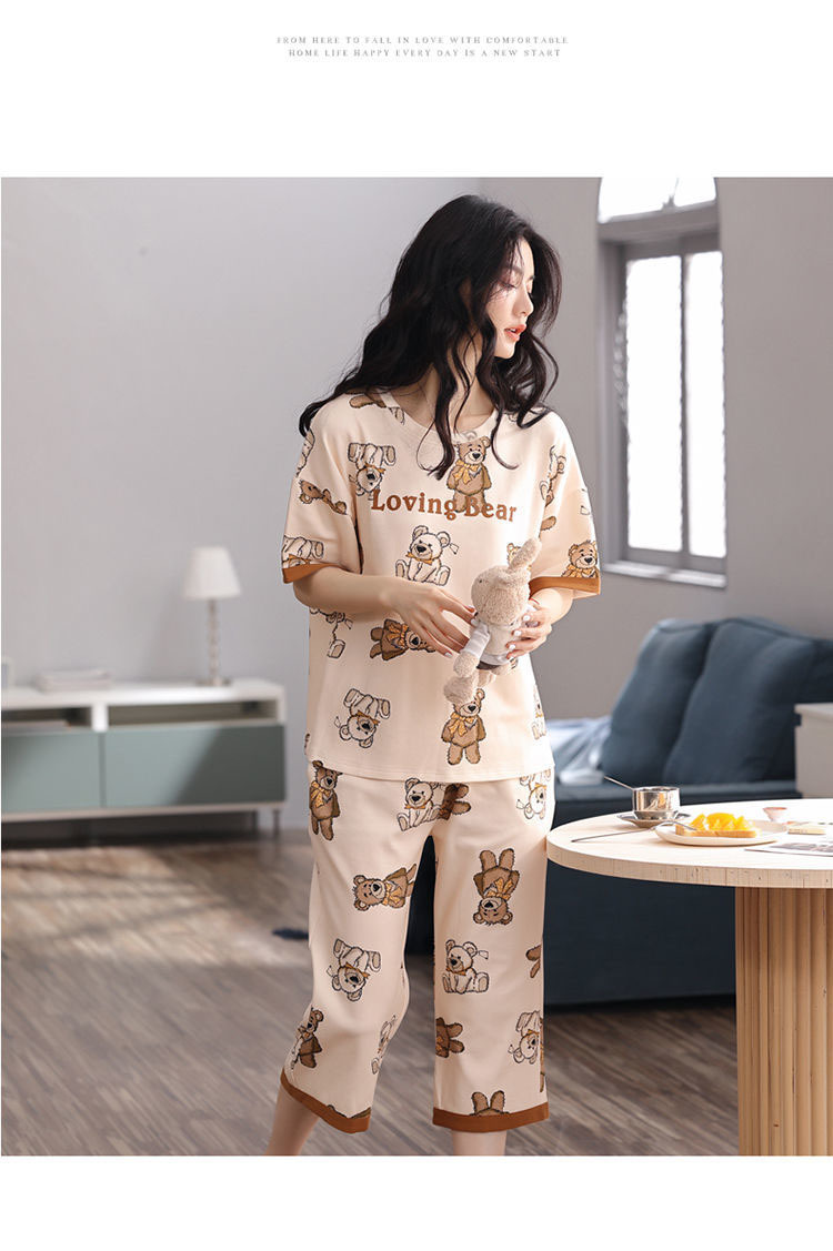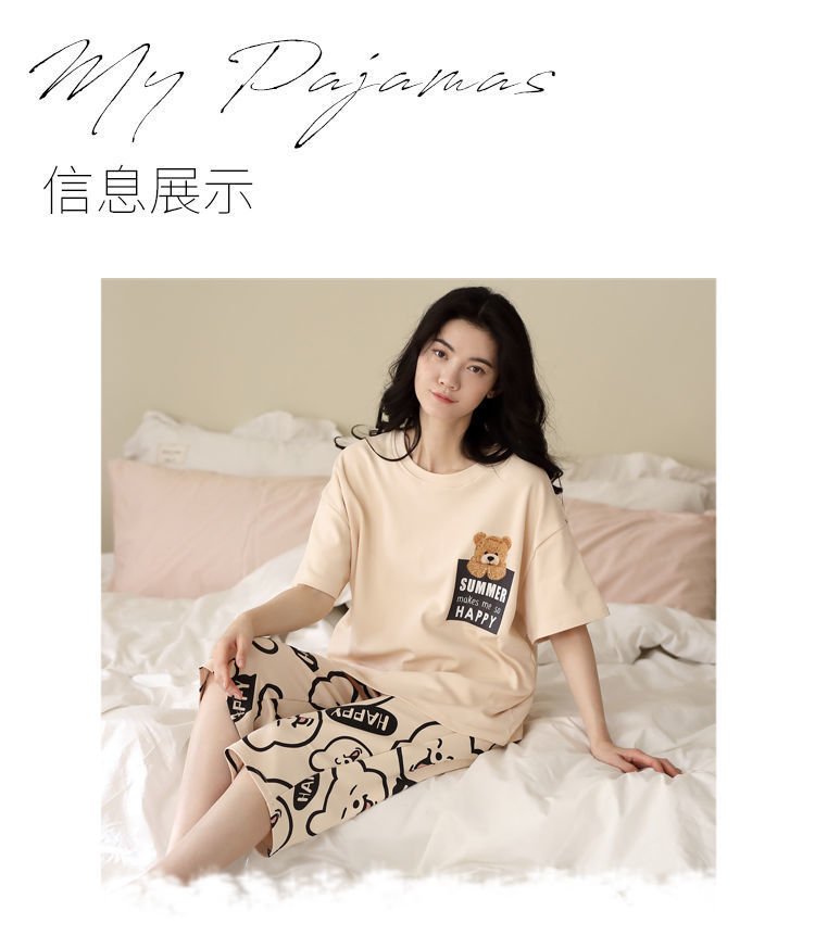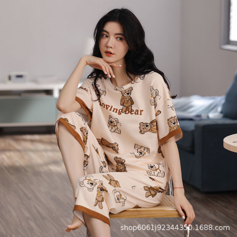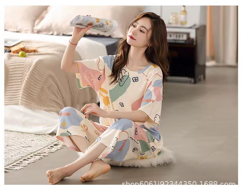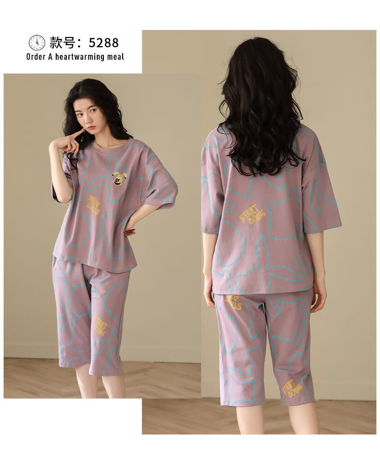 新款睡衣女夏季七分裤可爱短袖宽松薄款大码女士家居服可外穿套装