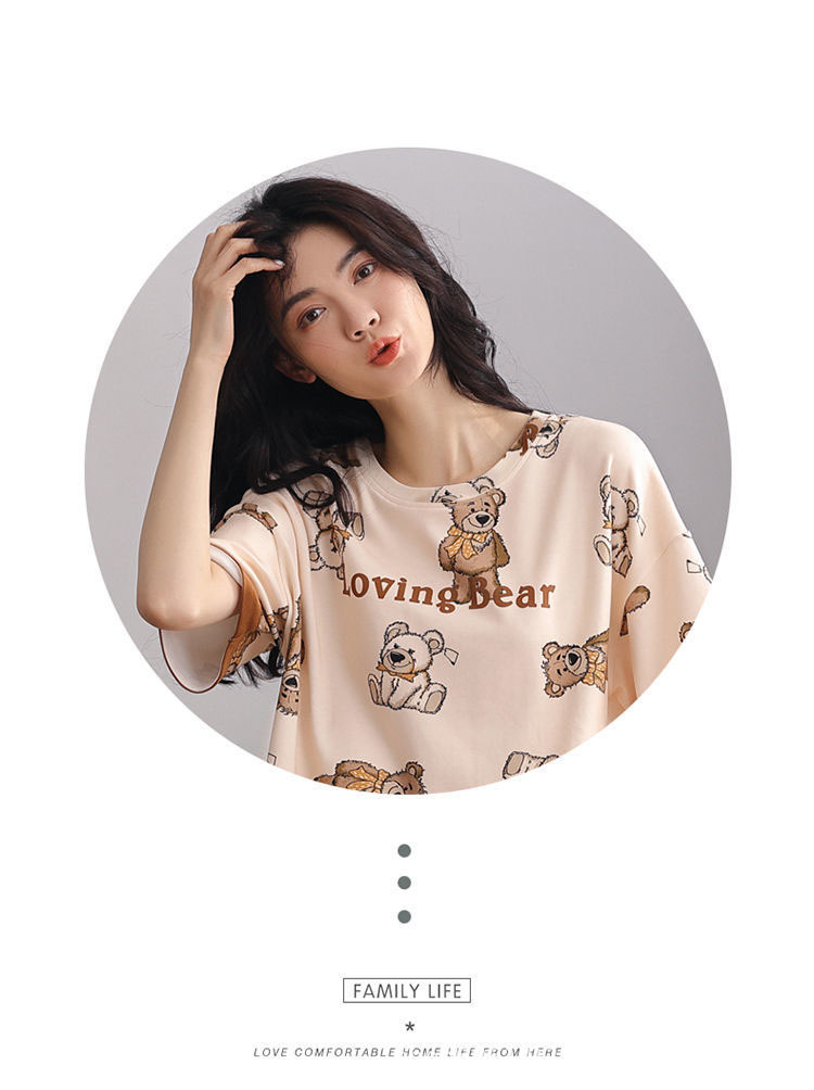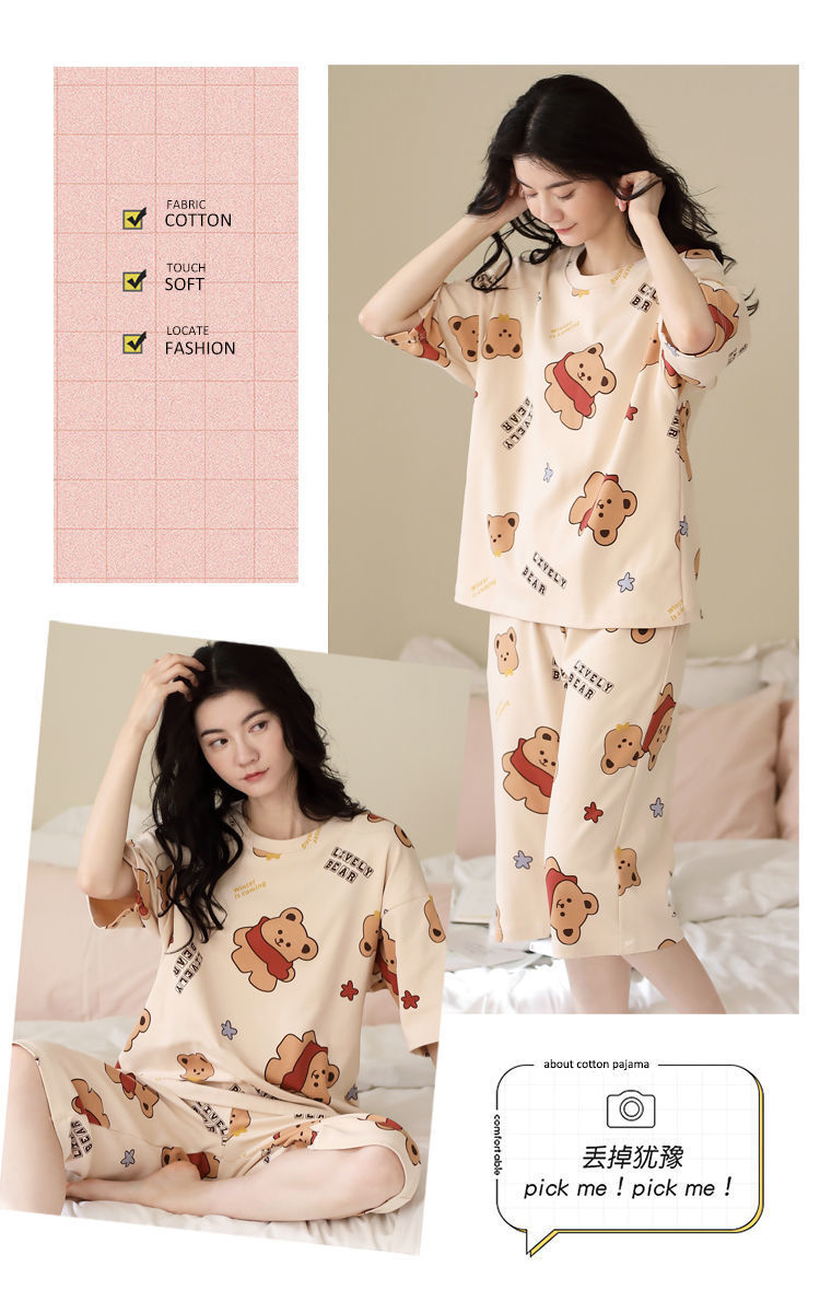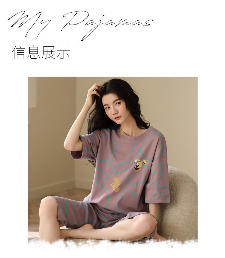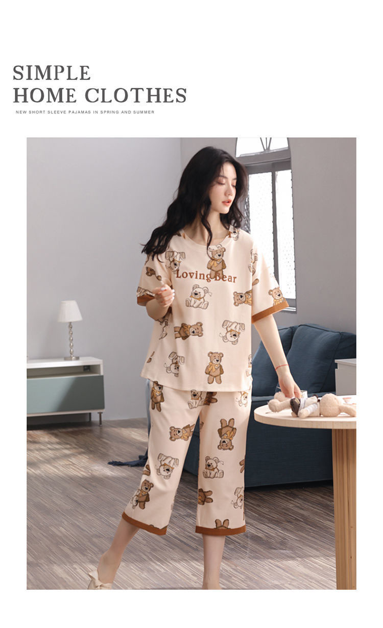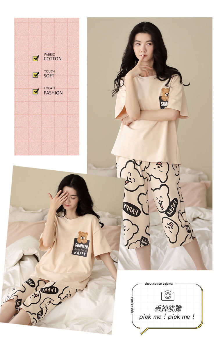 新款睡衣女夏季七分裤可爱短袖宽松薄款大码女士家居服可外穿套装