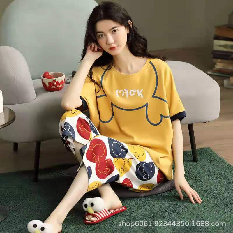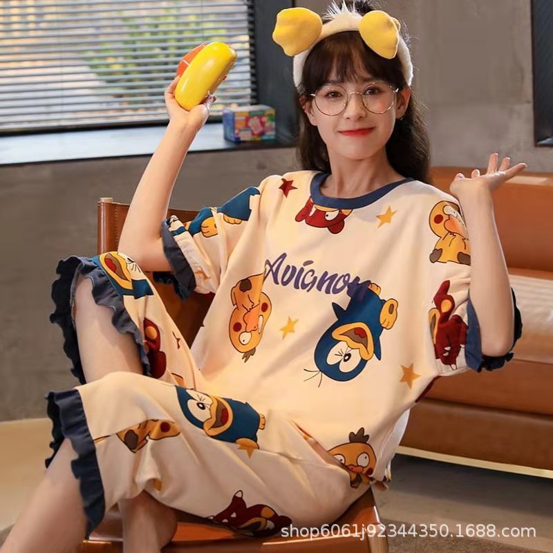 睡衣女夏季七分裤可爱短袖宽松薄款大码女士家居服可外穿套装