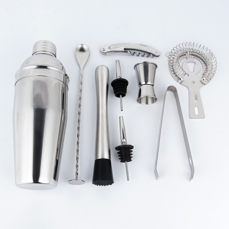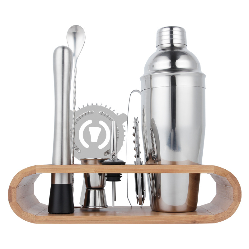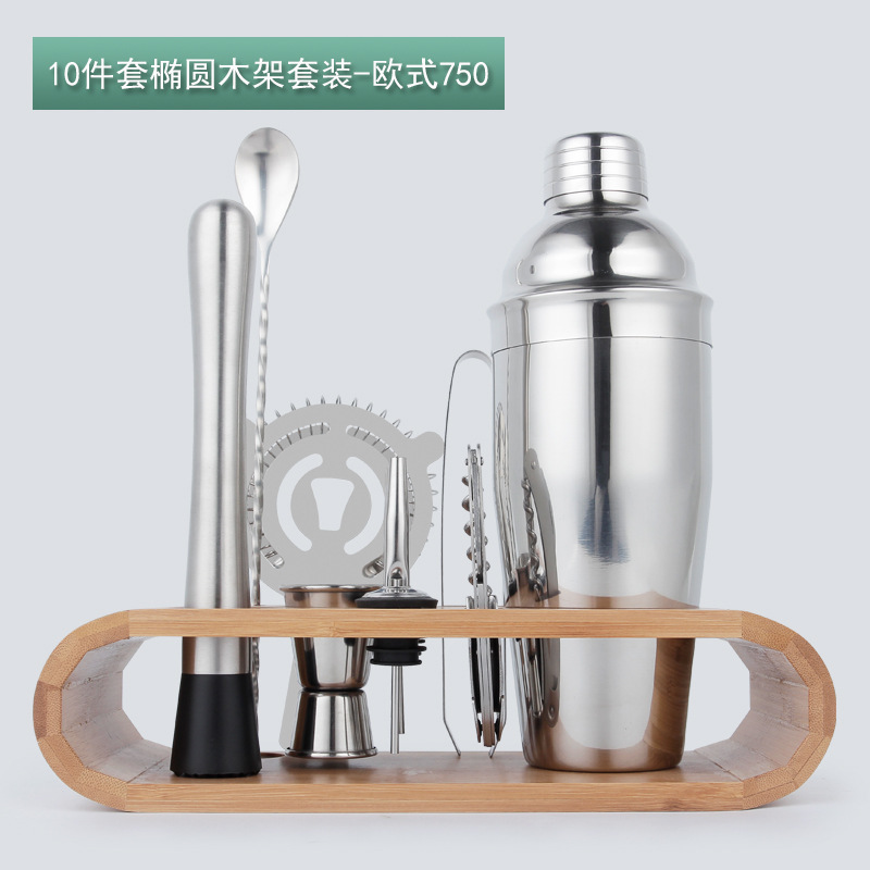 跨境不锈钢调酒工具套装10件套带木架底座酒吧鸡尾酒调酒器全套