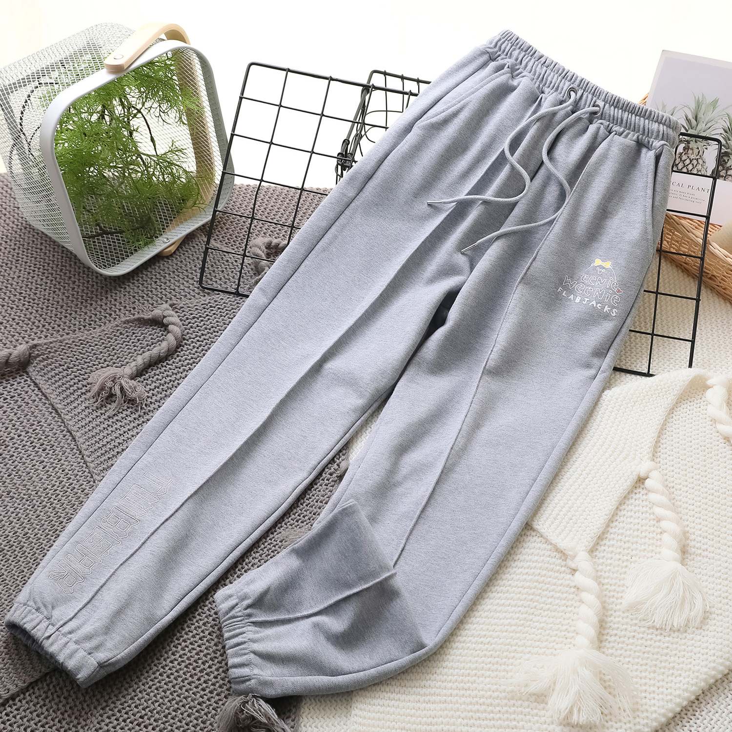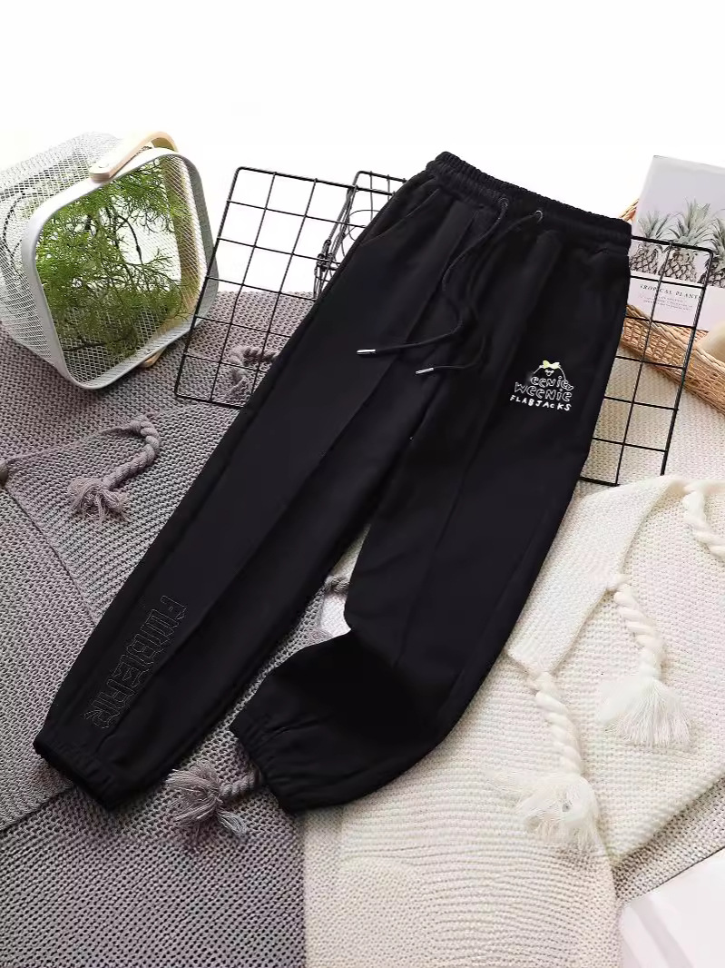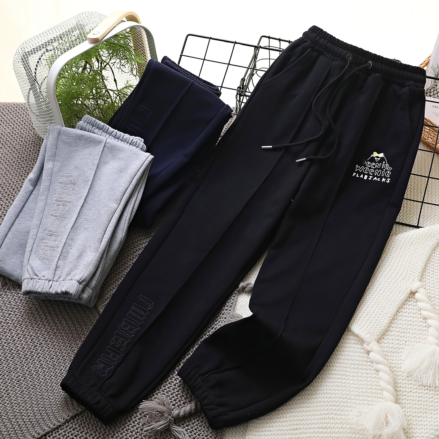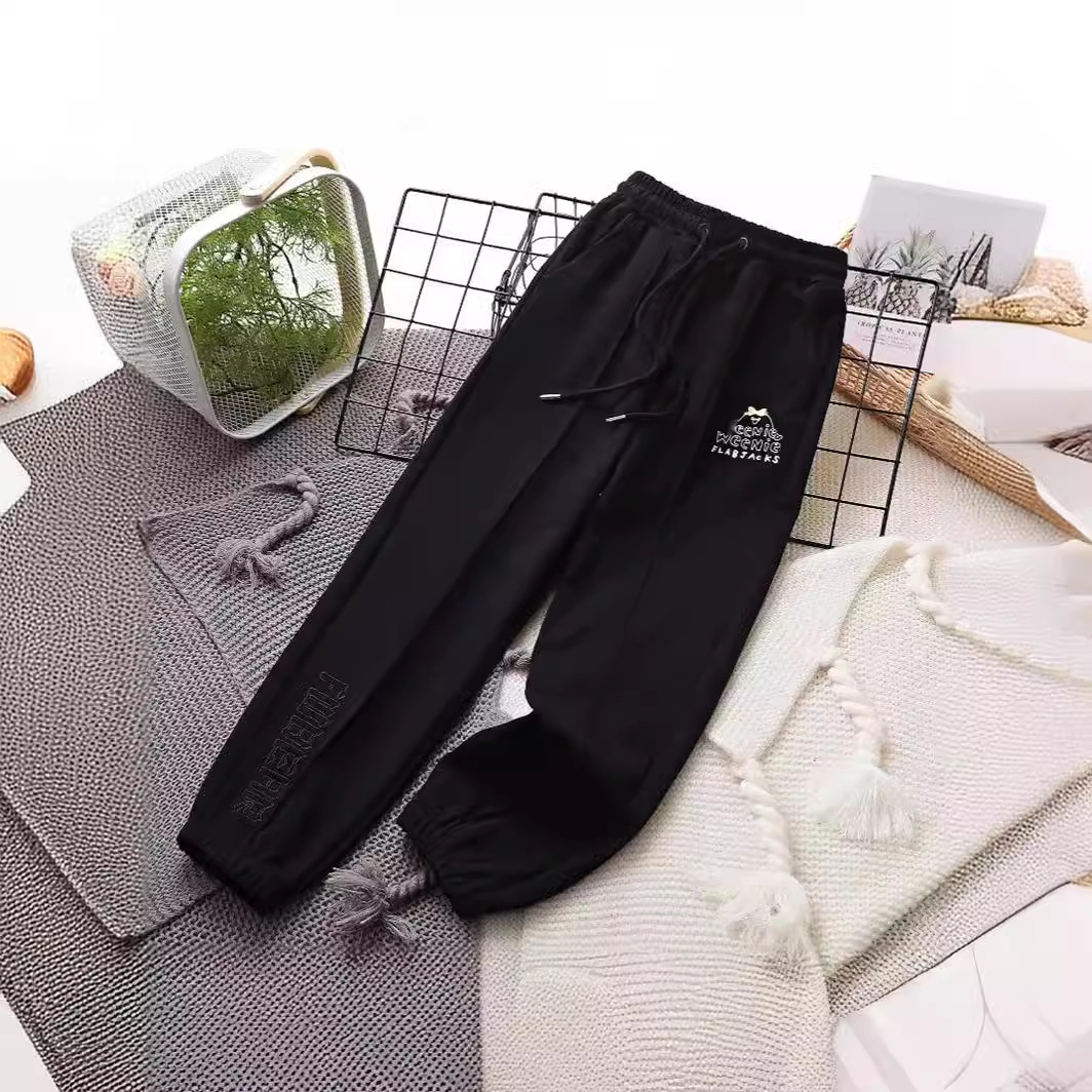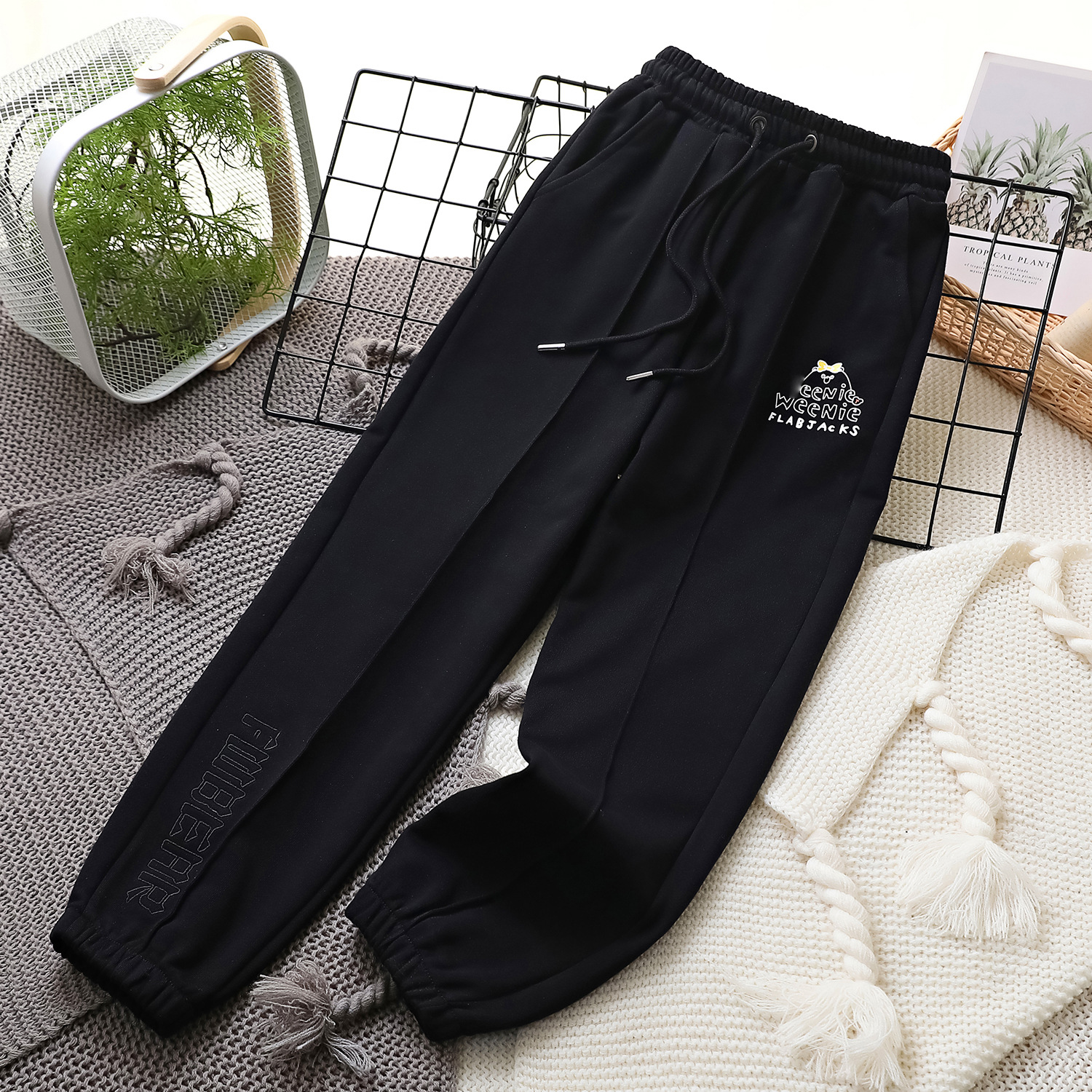欧美款男女卫裤刺绣小狐狸百搭束腿裤松紧腰高腰裤宽松外穿打底裤