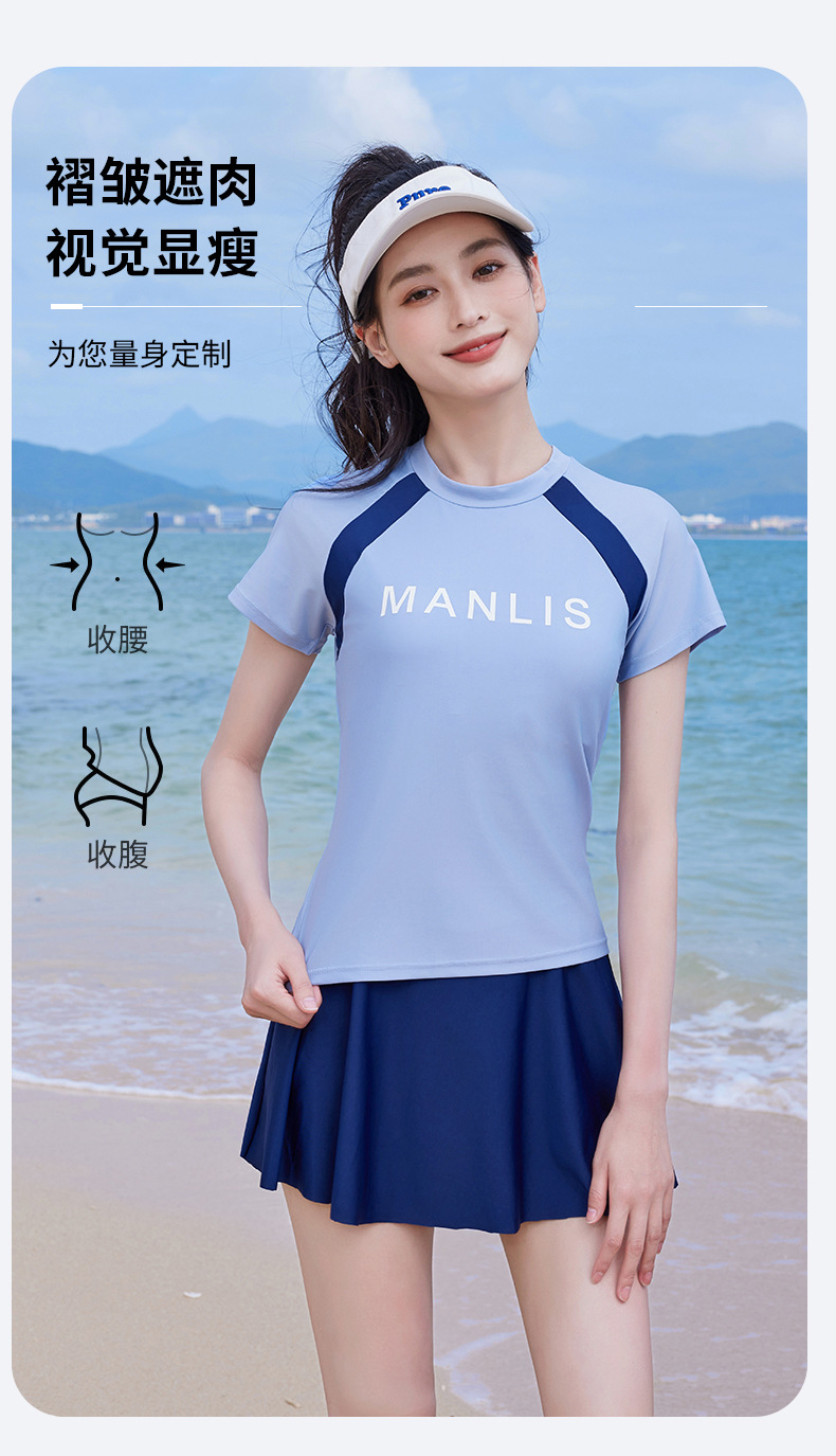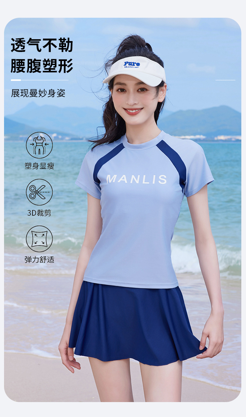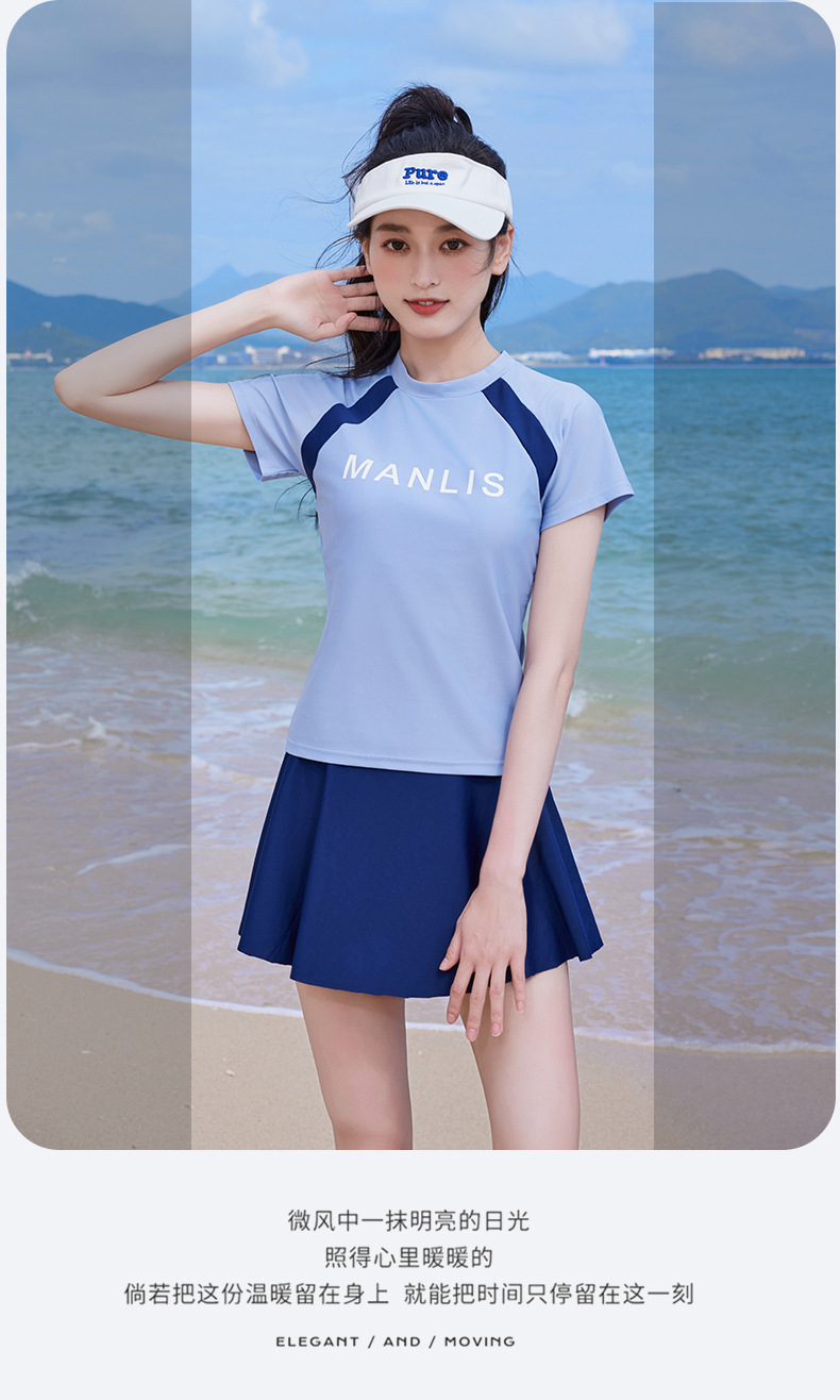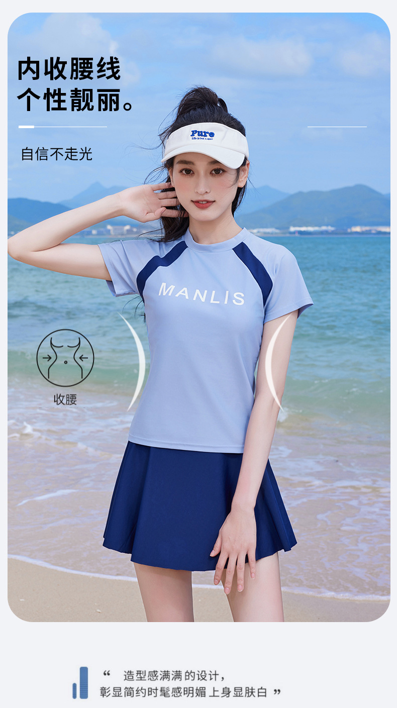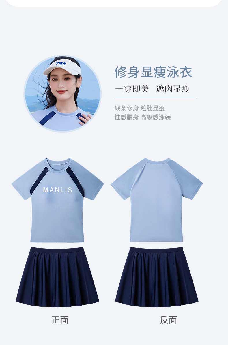 新款甜美小清新女士泳衣天青蓝运动保守款分体泳装A字裙显瘦耐穿