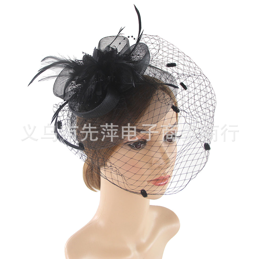 亚马逊货源欧美网纱羽毛小礼帽头饰复古花朵面纱发饰表演厂家直销