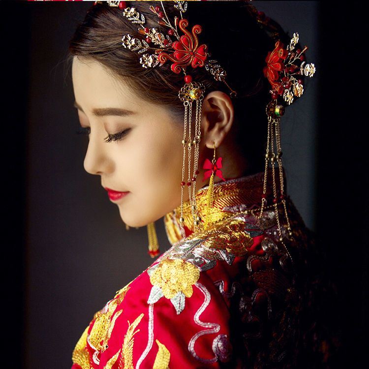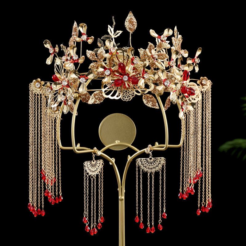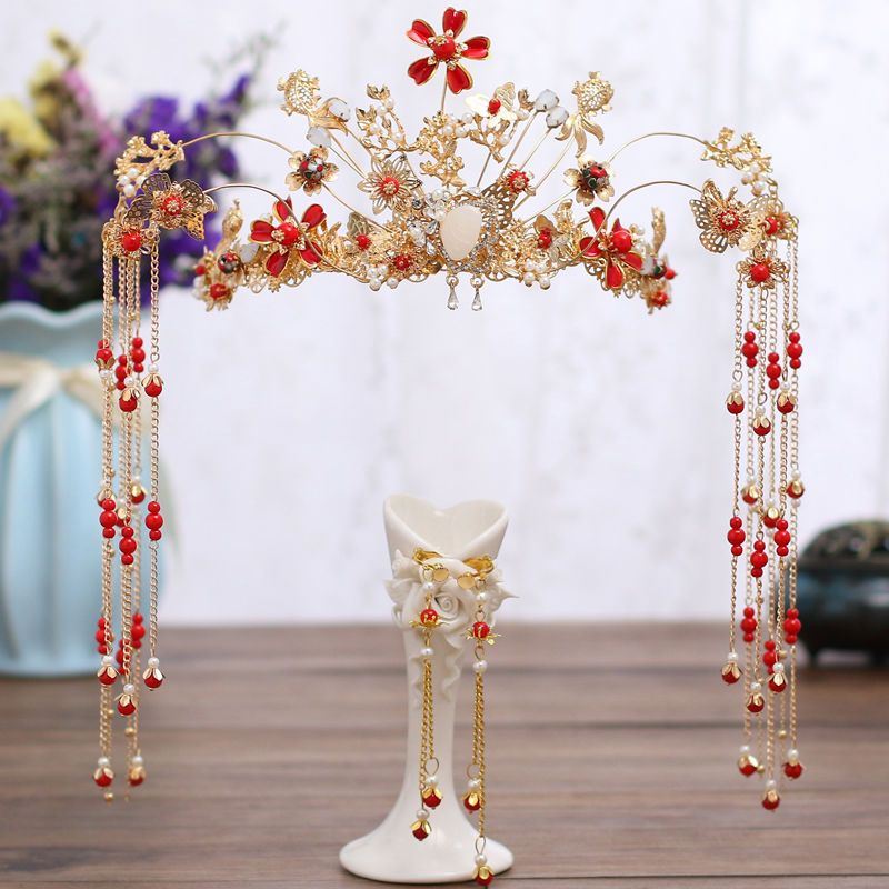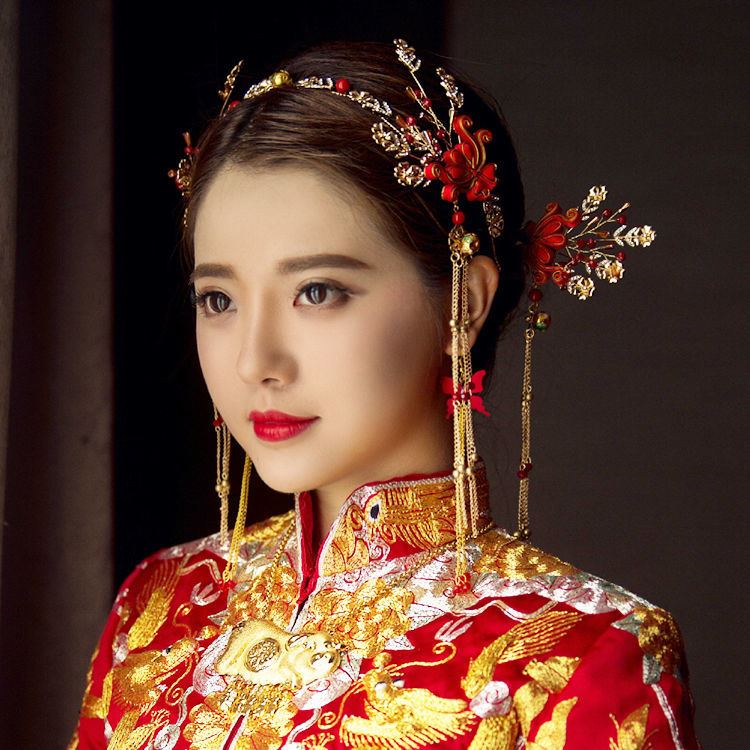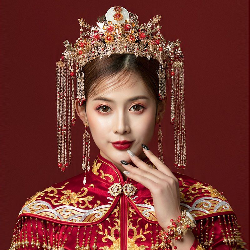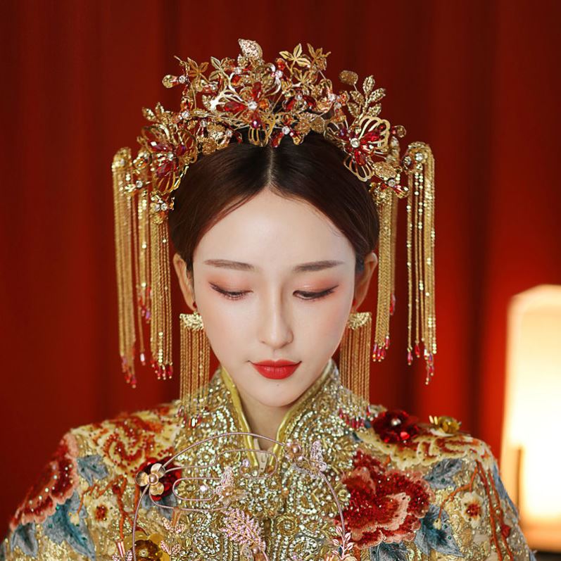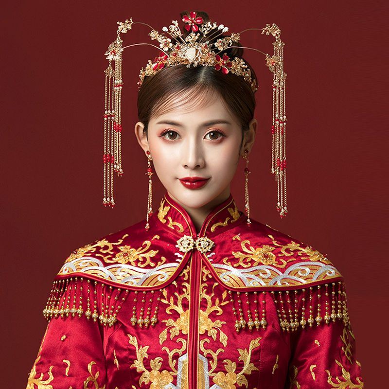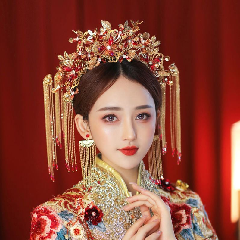 2023款唯美古典水晶琉璃新娘秀禾头饰红色气质造型婚礼配饰套装