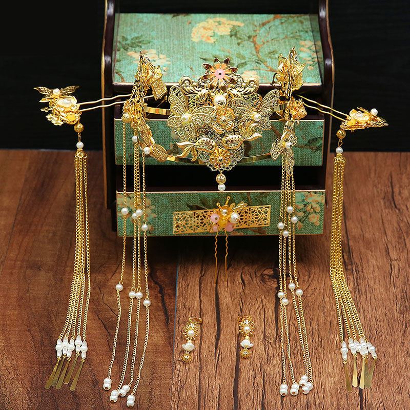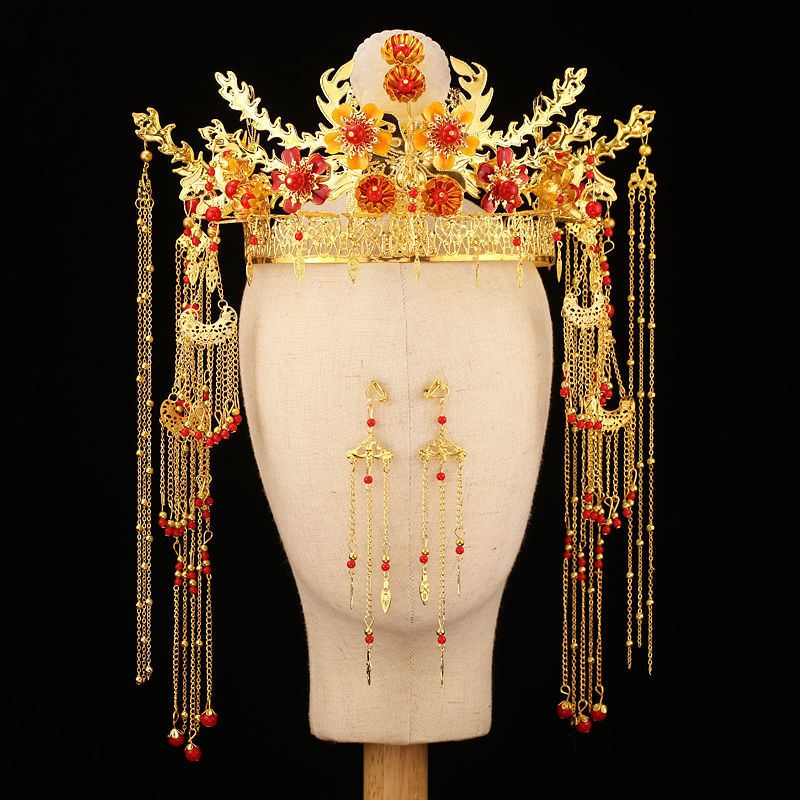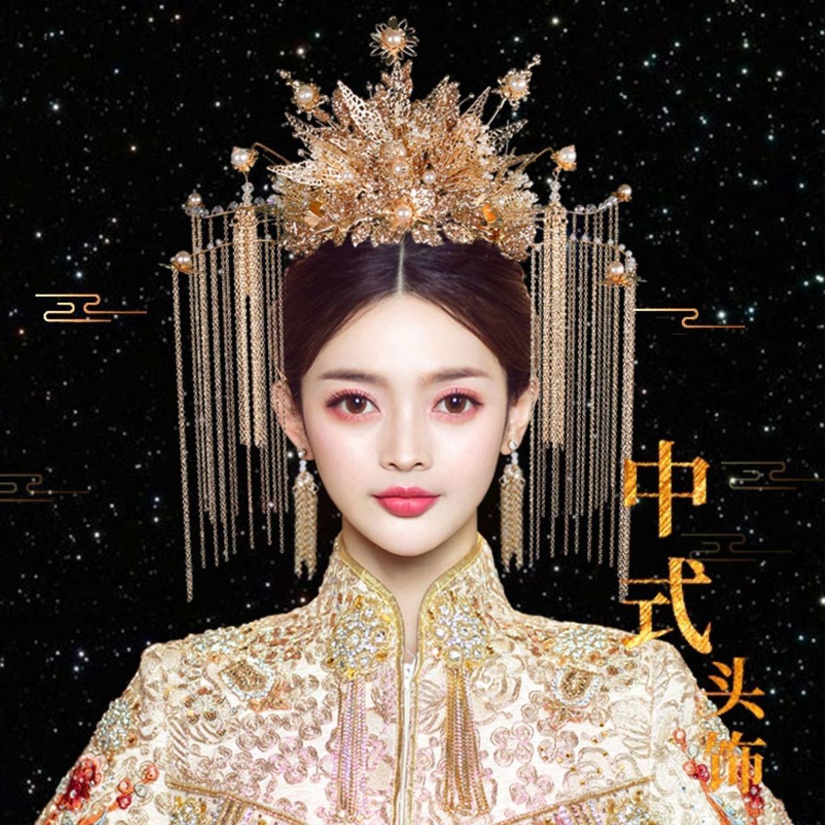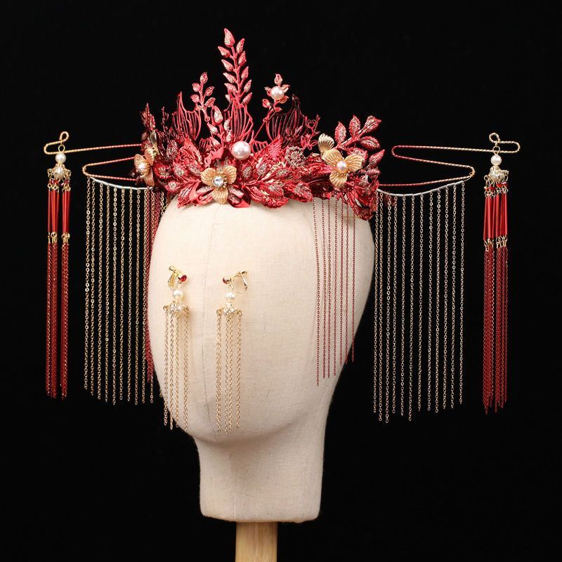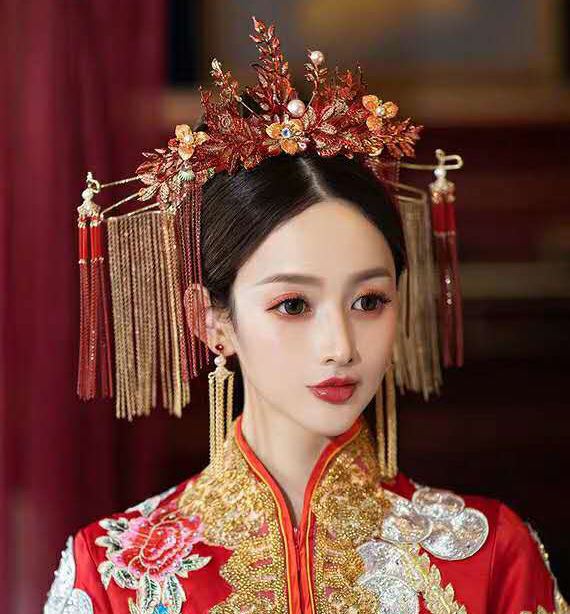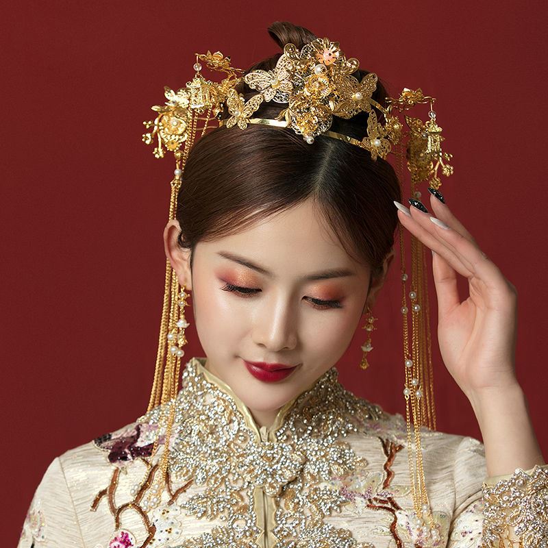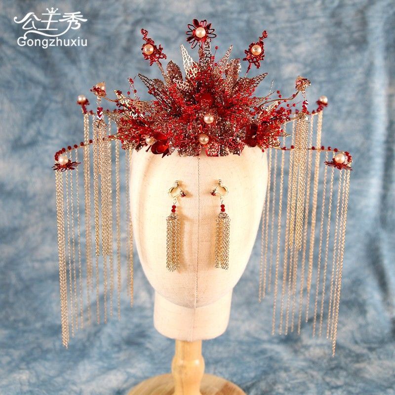 2023款唯美古典水晶琉璃新娘秀禾头饰红色气质造型婚礼配饰套装