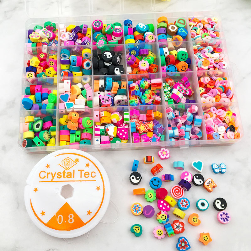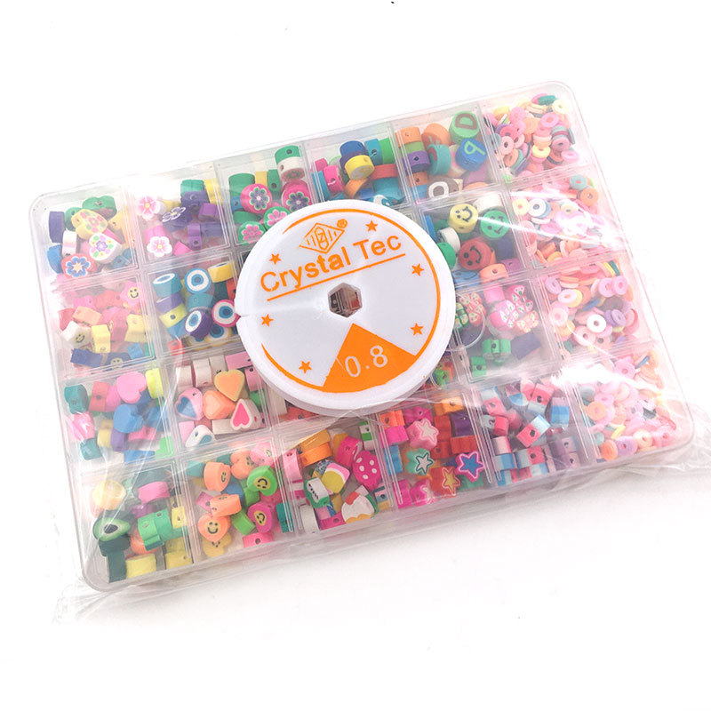 包装:软陶珠20款各20个,4格软陶片共800个,配一卷弹力绳,24格盒