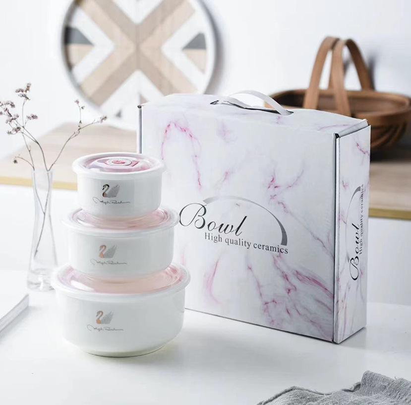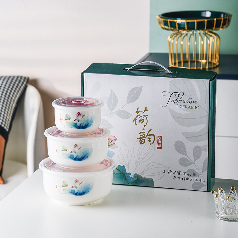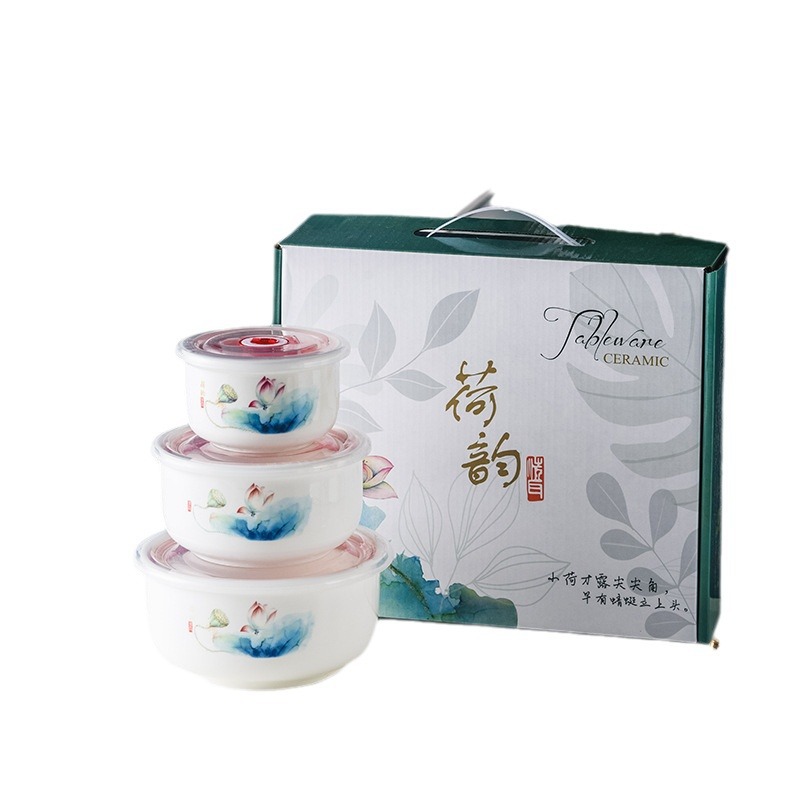 保鲜陶瓷密封保鲜碗三件套微波炉碗礼品婚庆保险回礼会销餐具批发