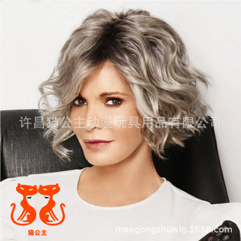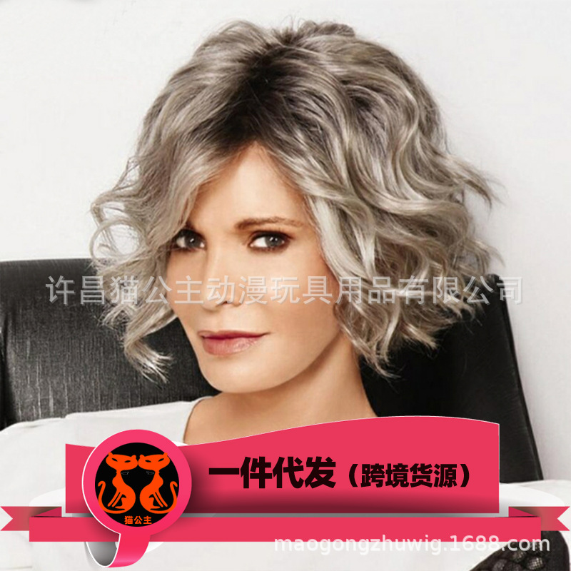厂家现货批发 时尚假发女士欧美渐变染色灰色 化纤短卷发头套