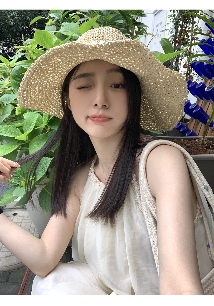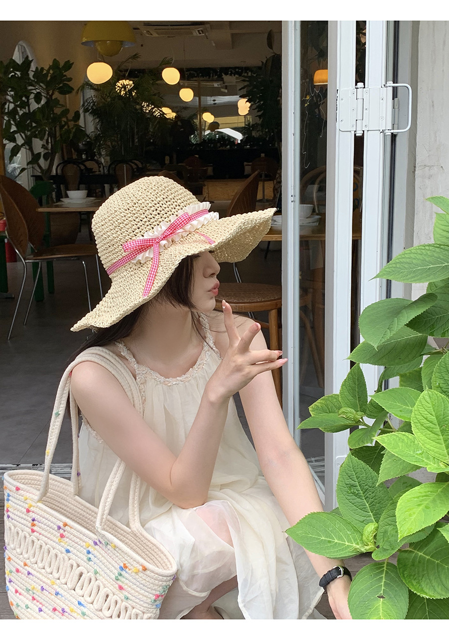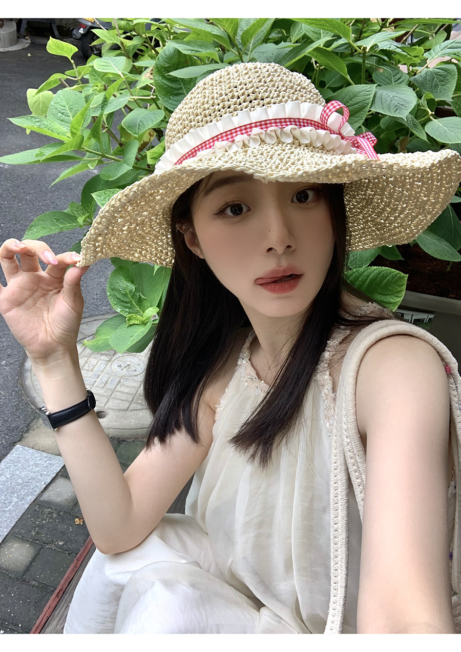 草帽女夏款户外旅游度假海边沙滩大檐蝴蝶结绑带渔夫帽草编遮阳帽