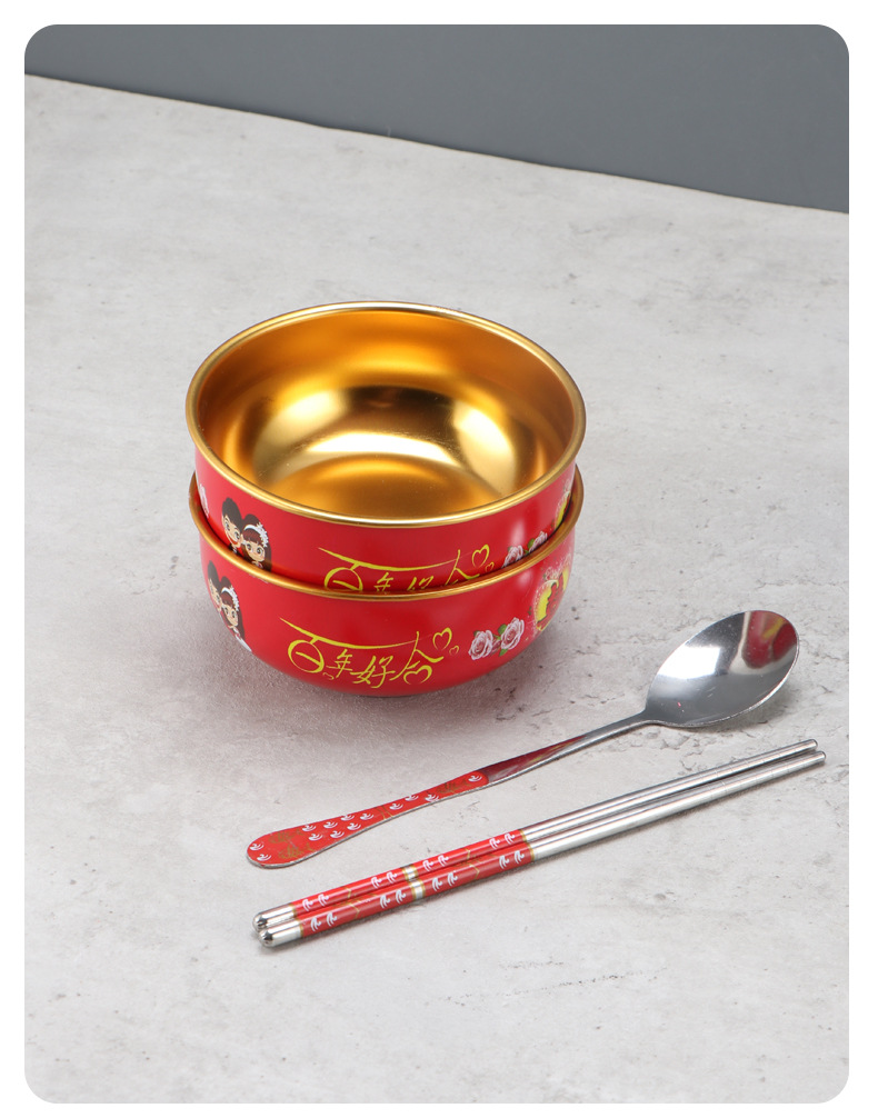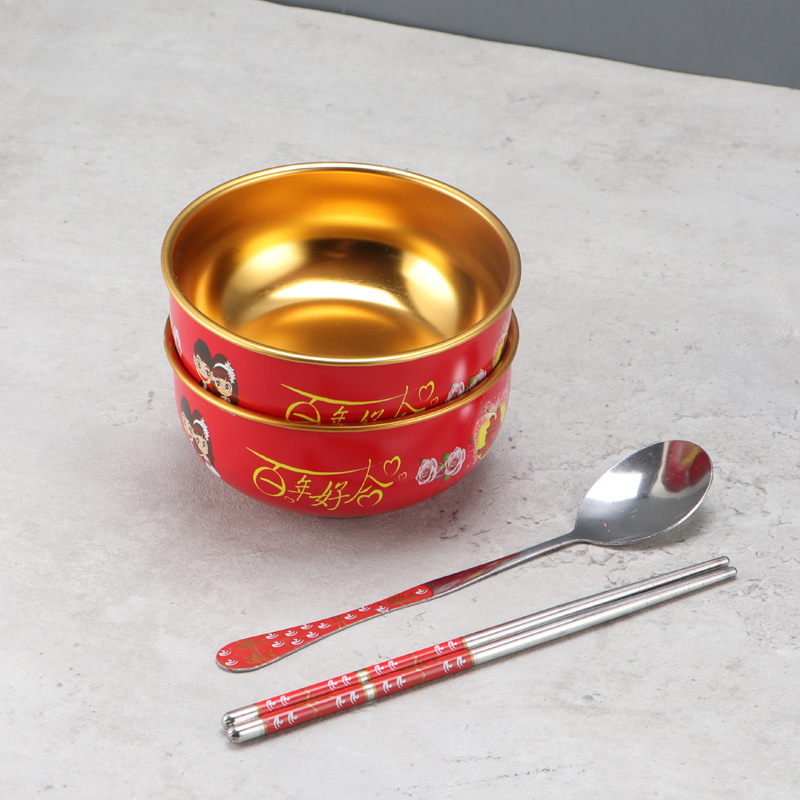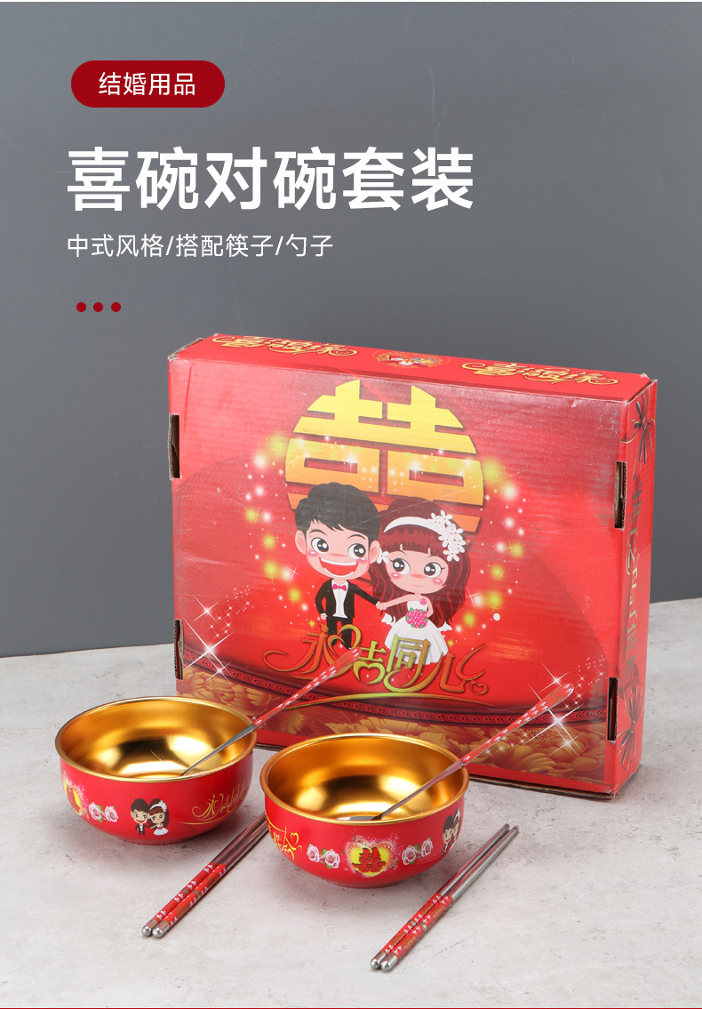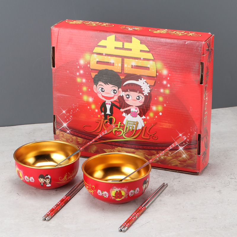 不锈钢结婚碗筷套装批发婚礼陪嫁红色卡通碗礼盒婚庆用品中式喜碗
