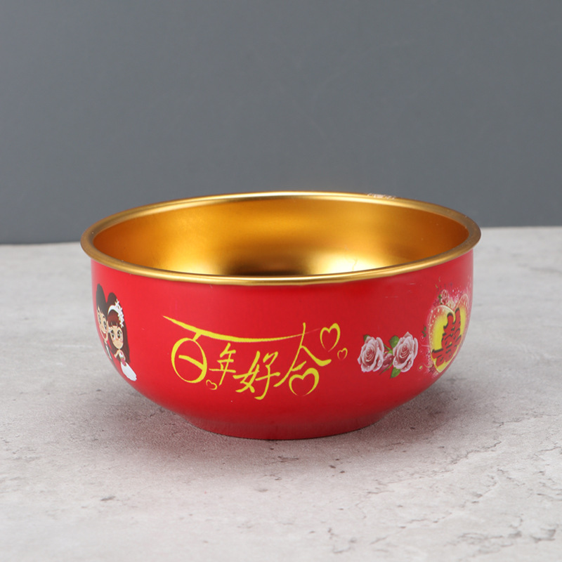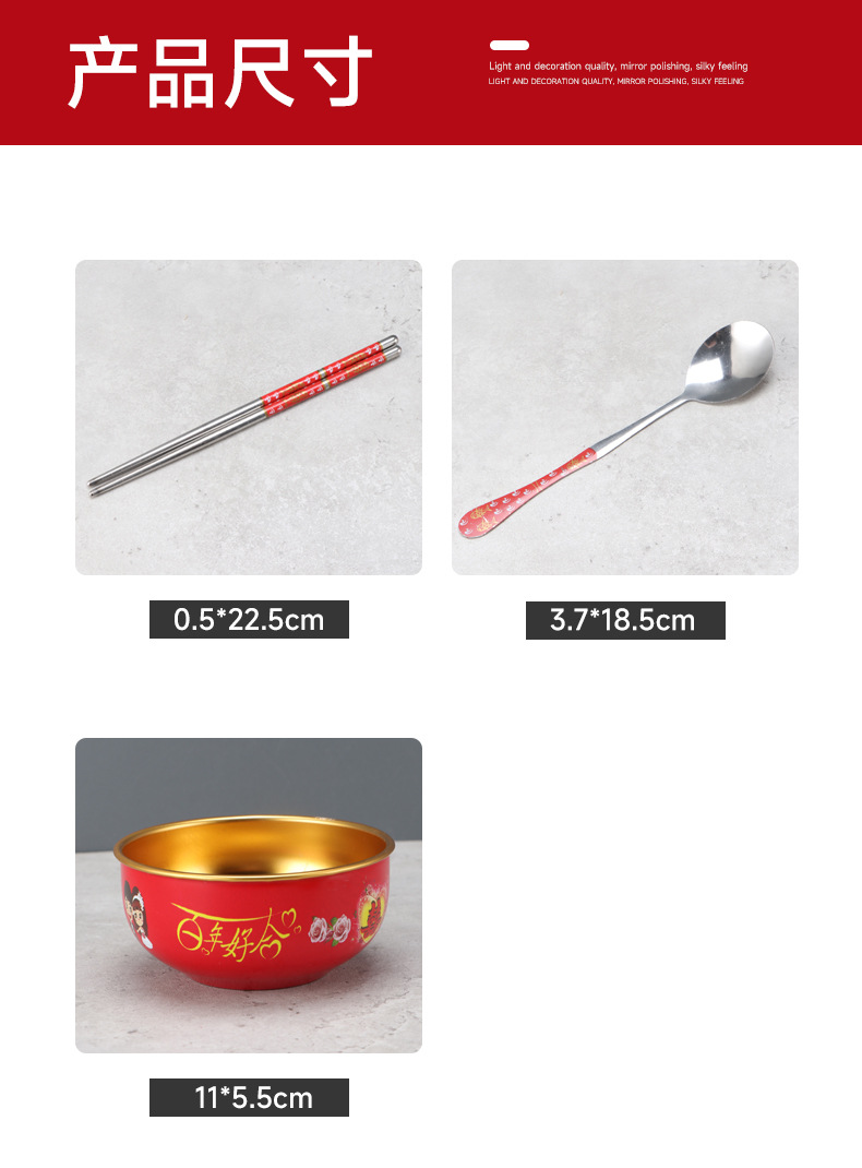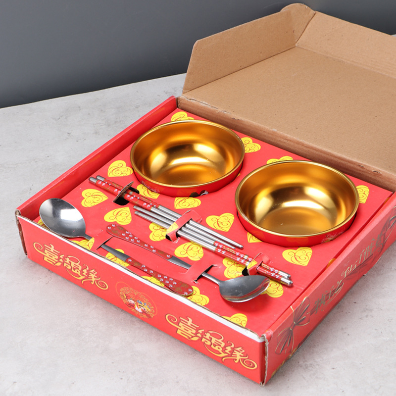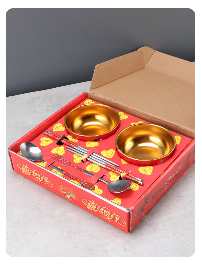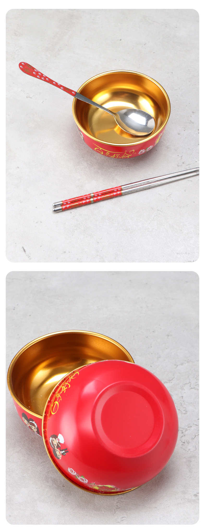 不锈钢结婚碗筷套装批发婚礼陪嫁红色卡通碗礼盒婚庆用品中式喜碗