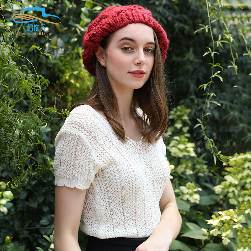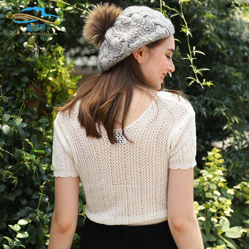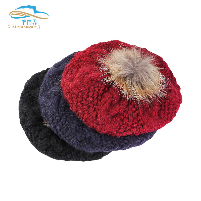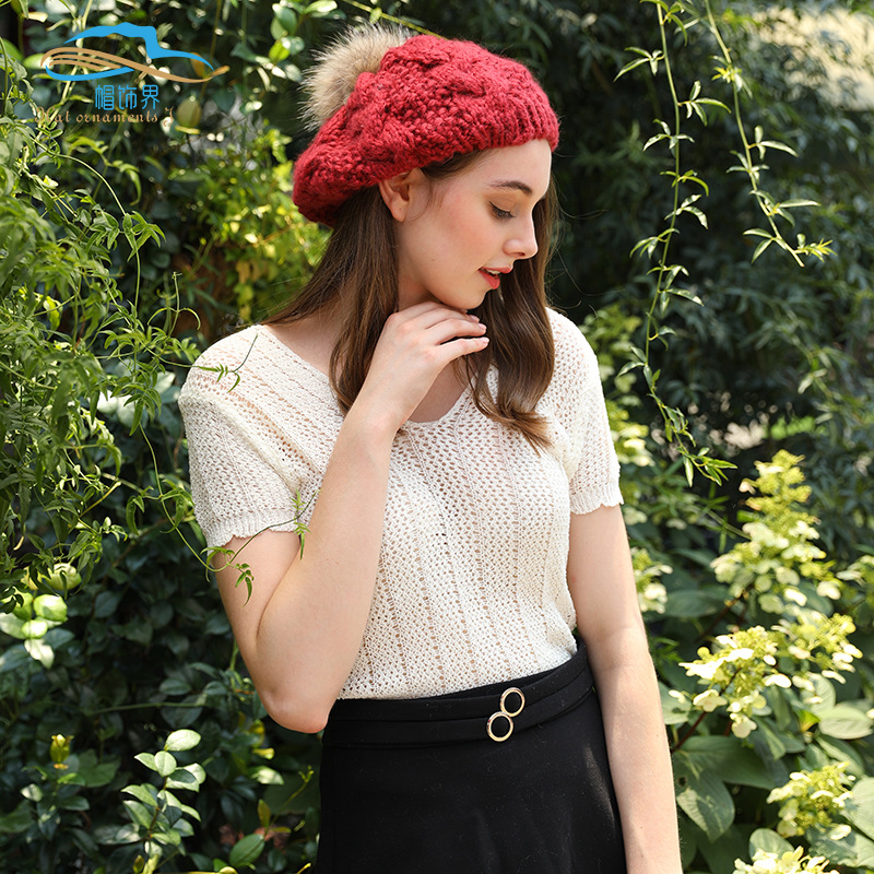 韩版秋冬季时尚新款日系毛线贝雷帽 单色毛球贝雷帽保暖
