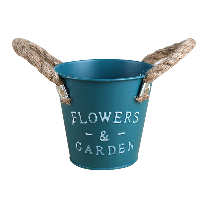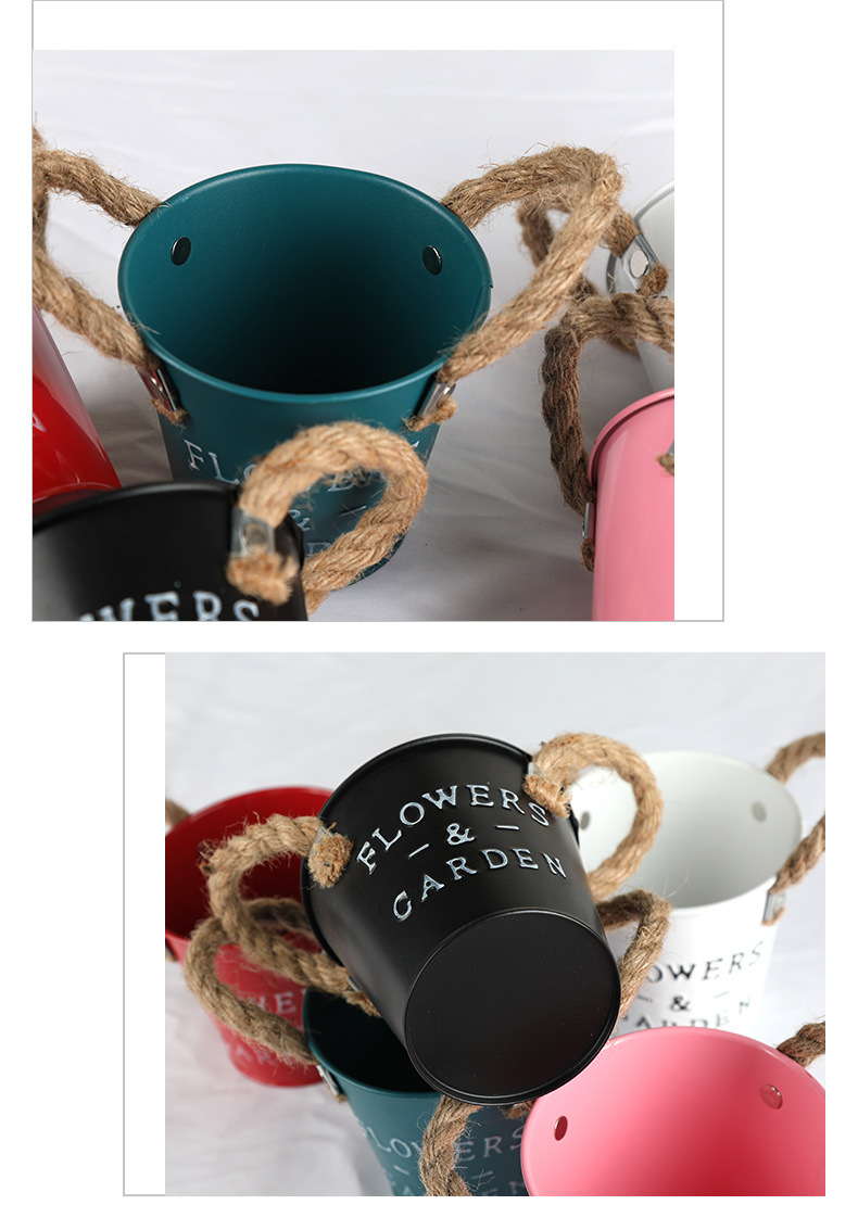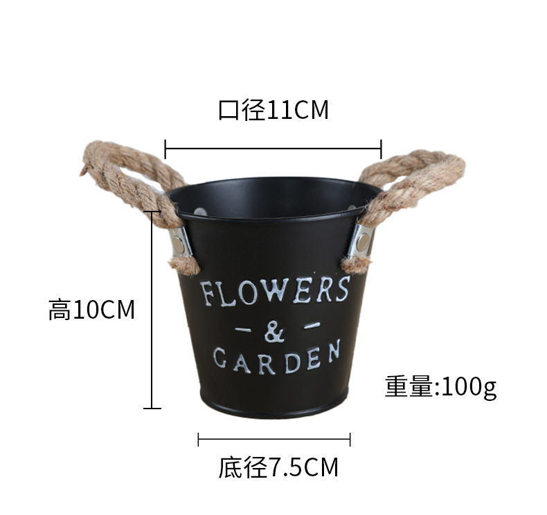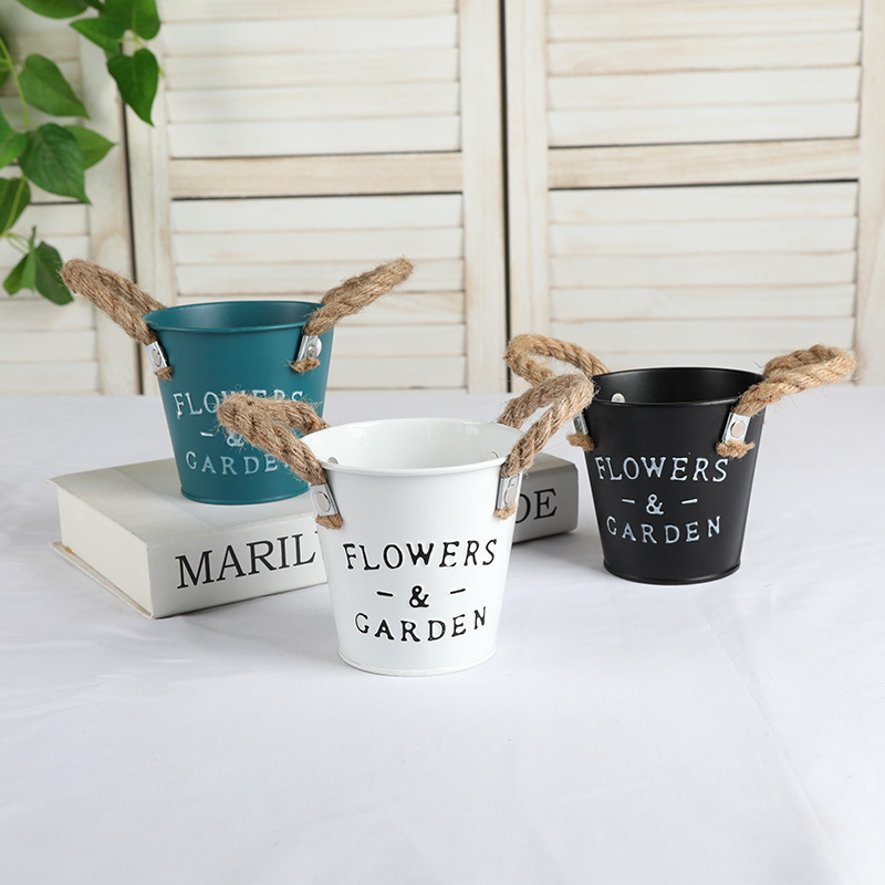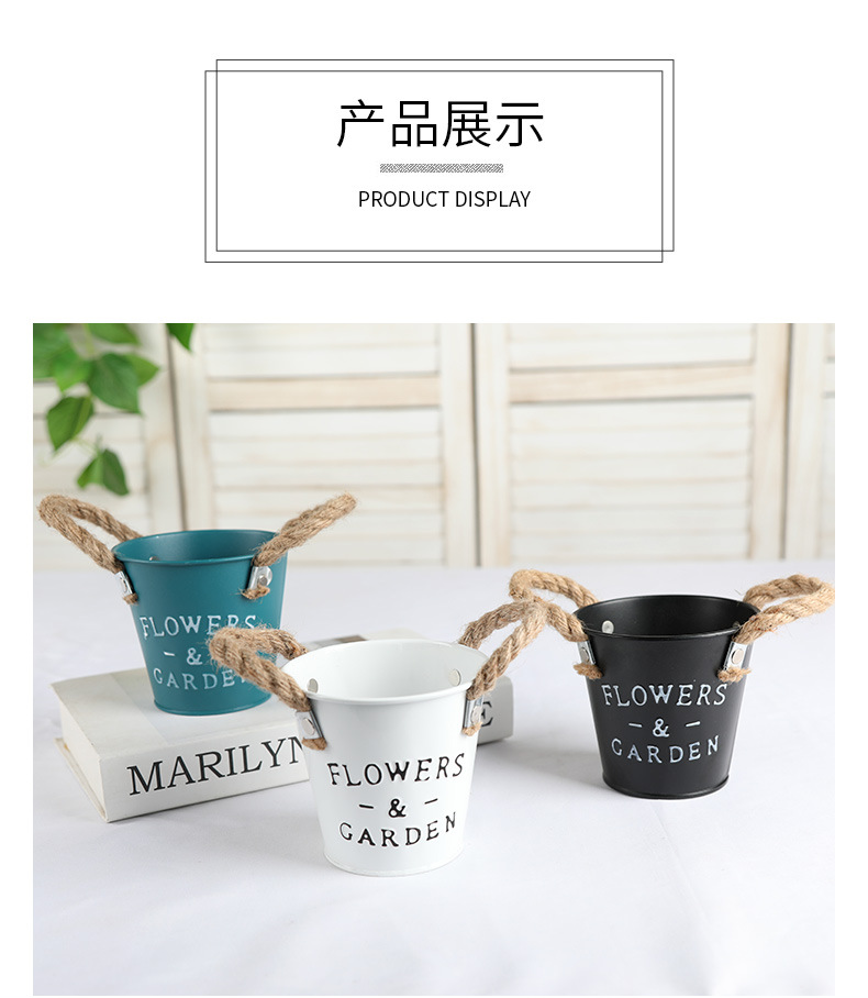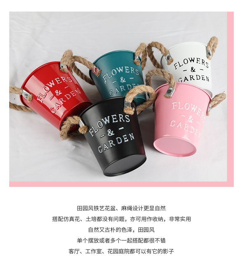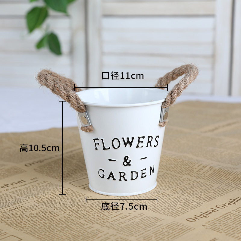 跨境热卖 铁皮花盆多肉盆栽小桶 田园花器 麻绳把手 桌面摆件容器