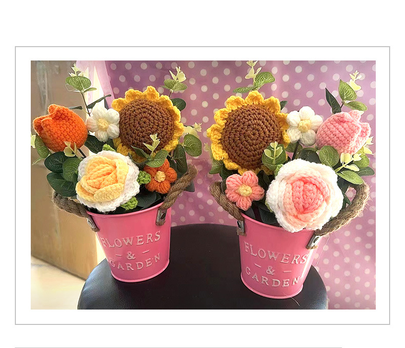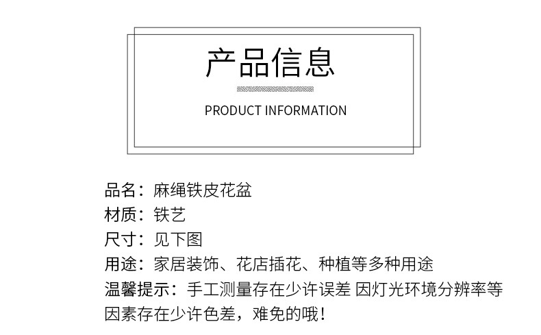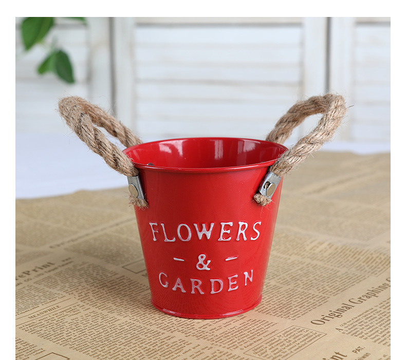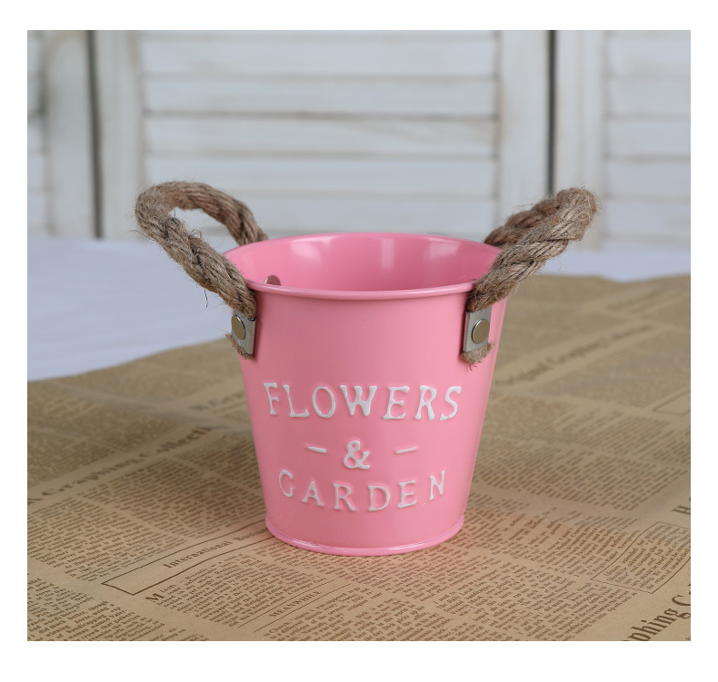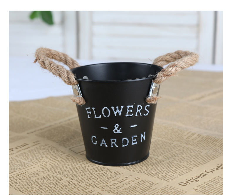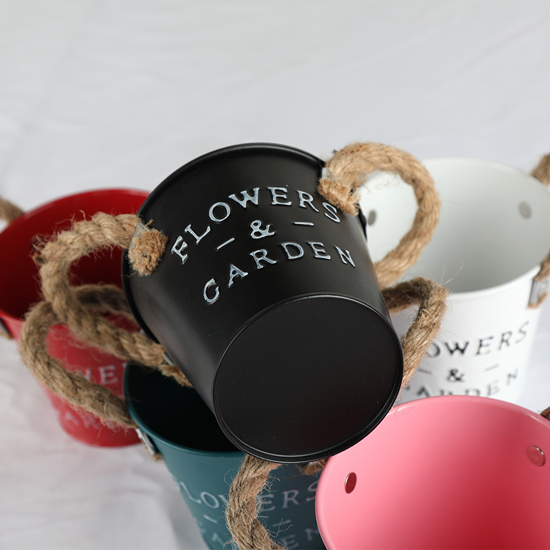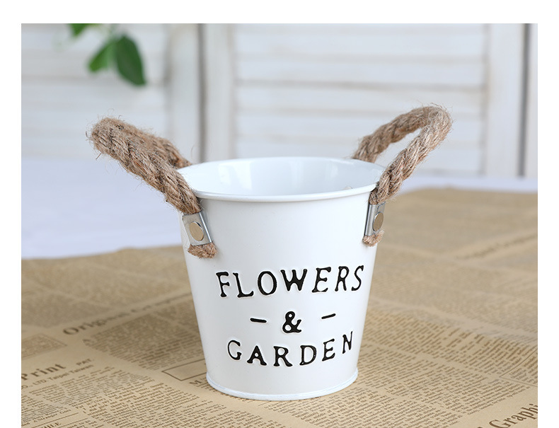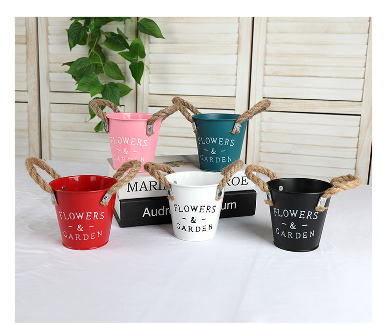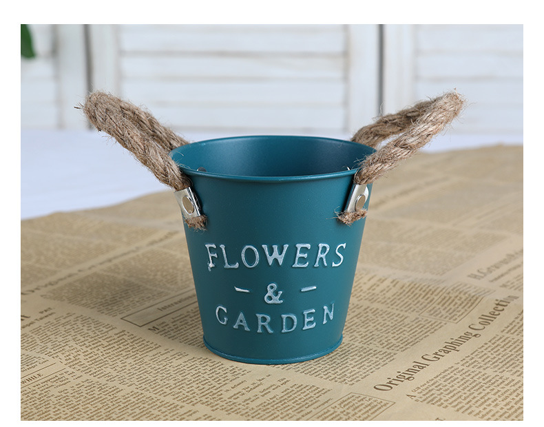 跨境热卖 铁皮花盆多肉盆栽小桶 田园花器 麻绳把手 桌面摆件容器