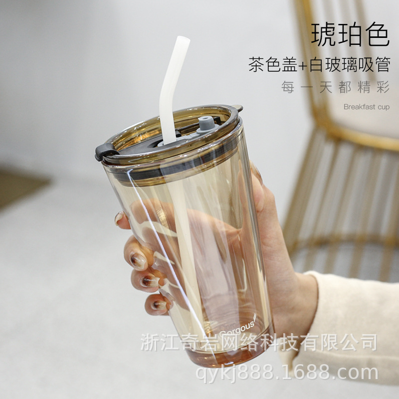 简约北极光玻璃杯吸管杯感奶茶水杯轻奢早餐杯学生ins咖啡杯代发