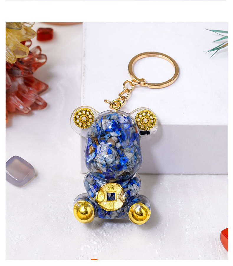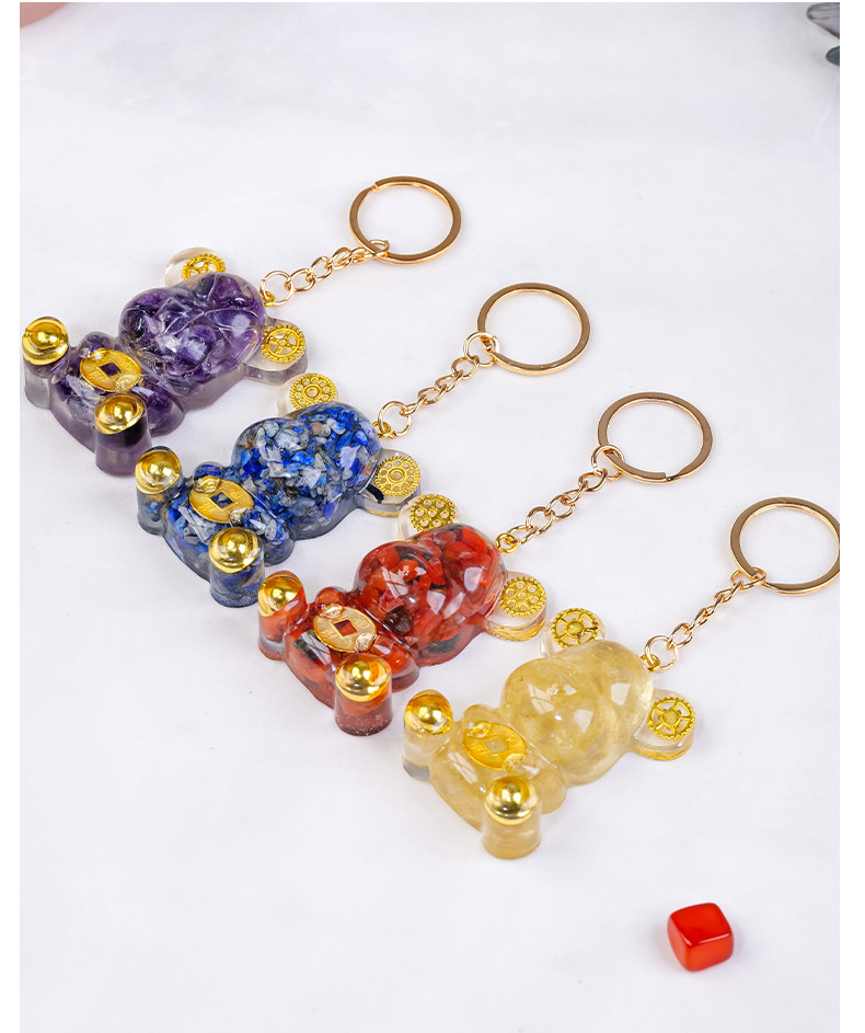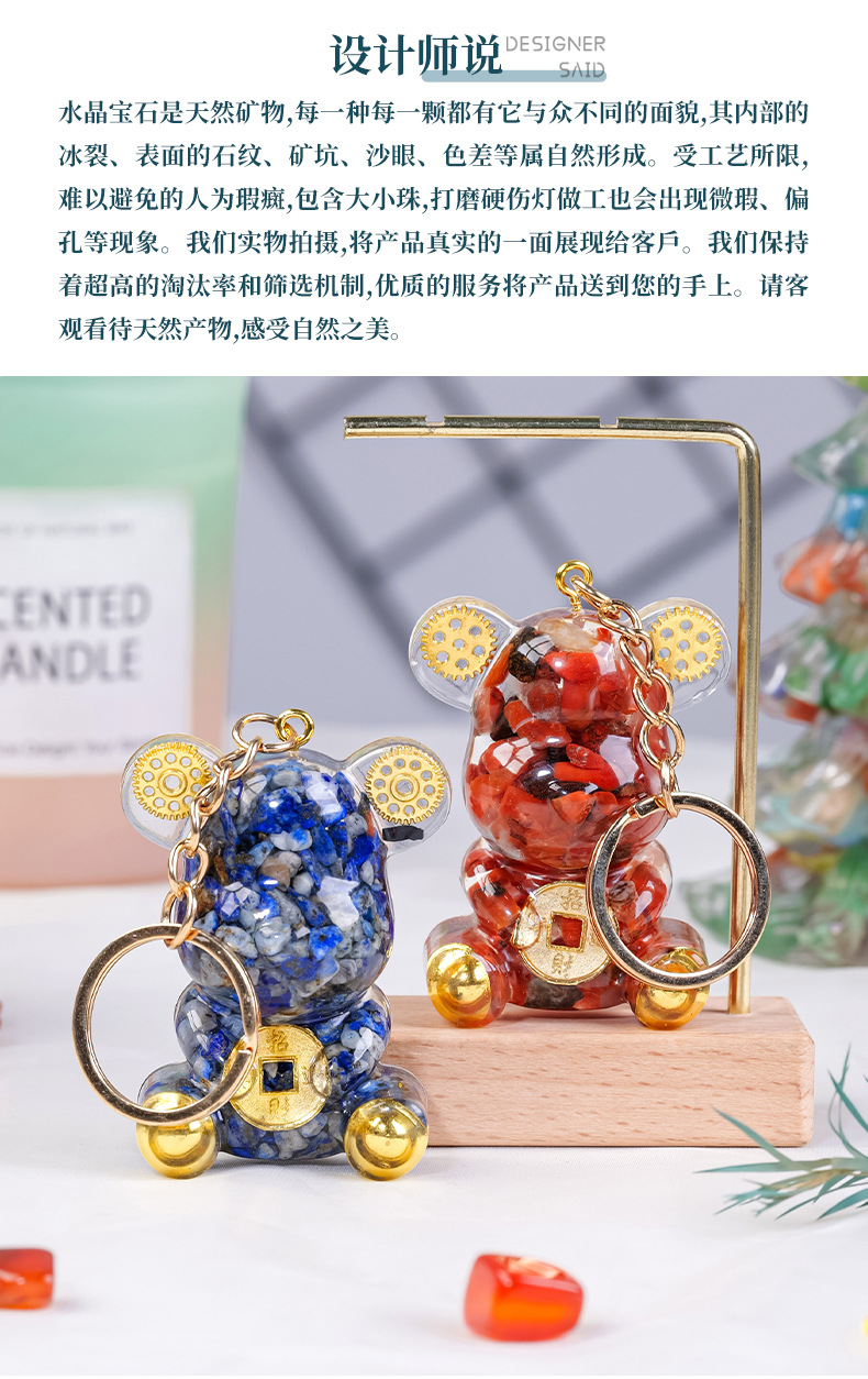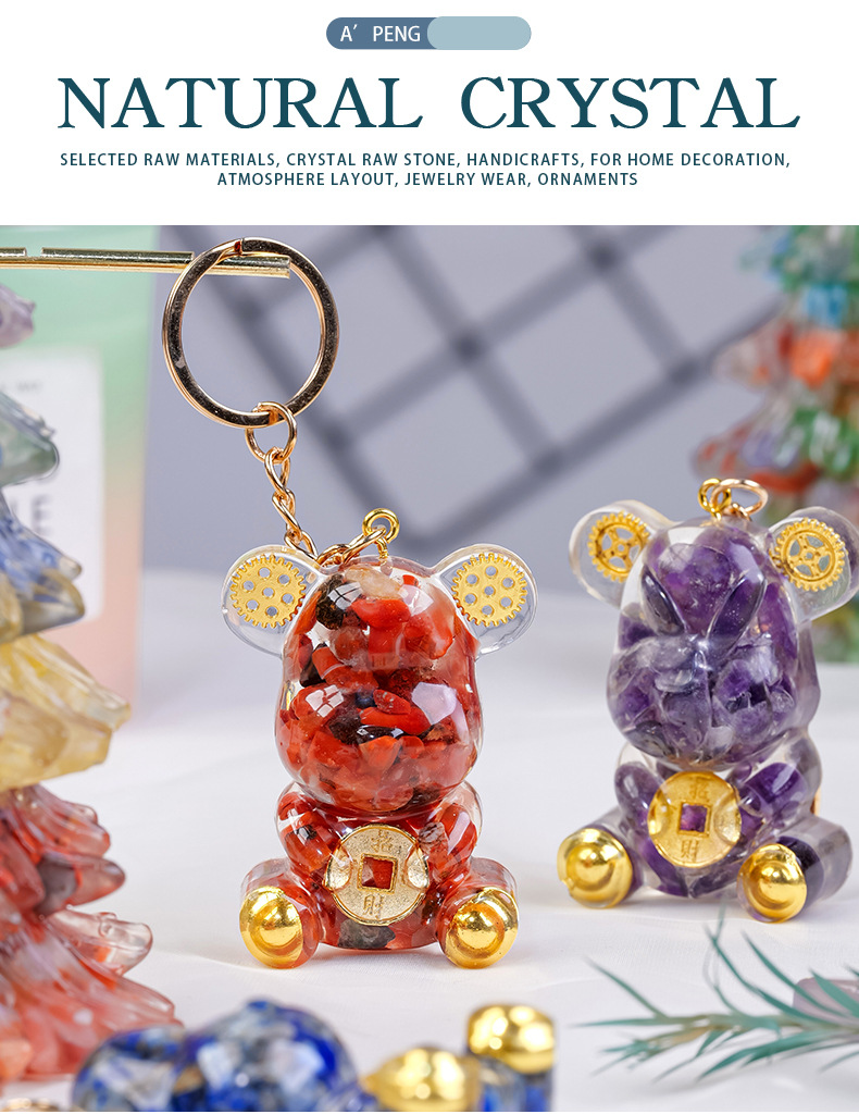 天然水晶暴力熊钥匙扣 紫水晶原石水晶小熊滴胶树脂包包装饰挂件