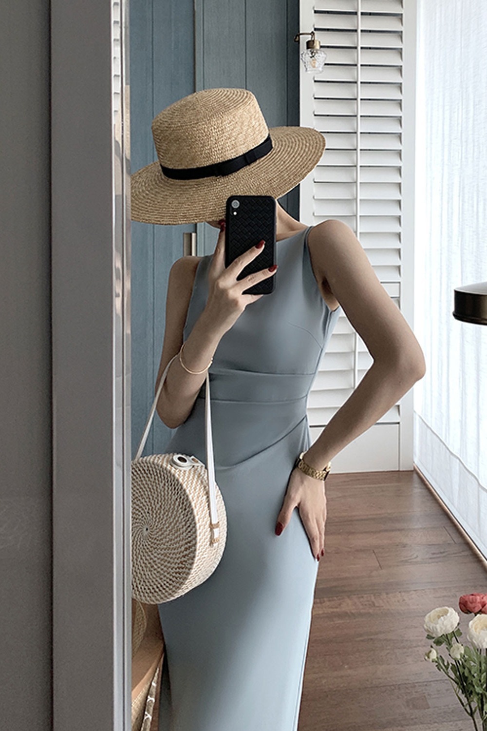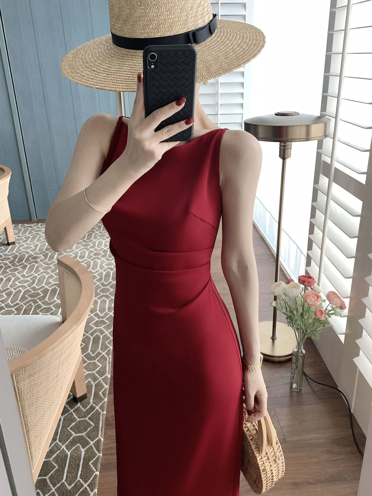 【锐达】法式复古赫本风连衣裙夏一字肩无袖长裙收腰显瘦赫本裙