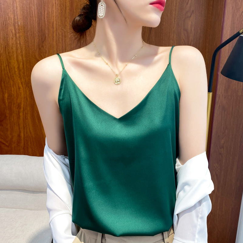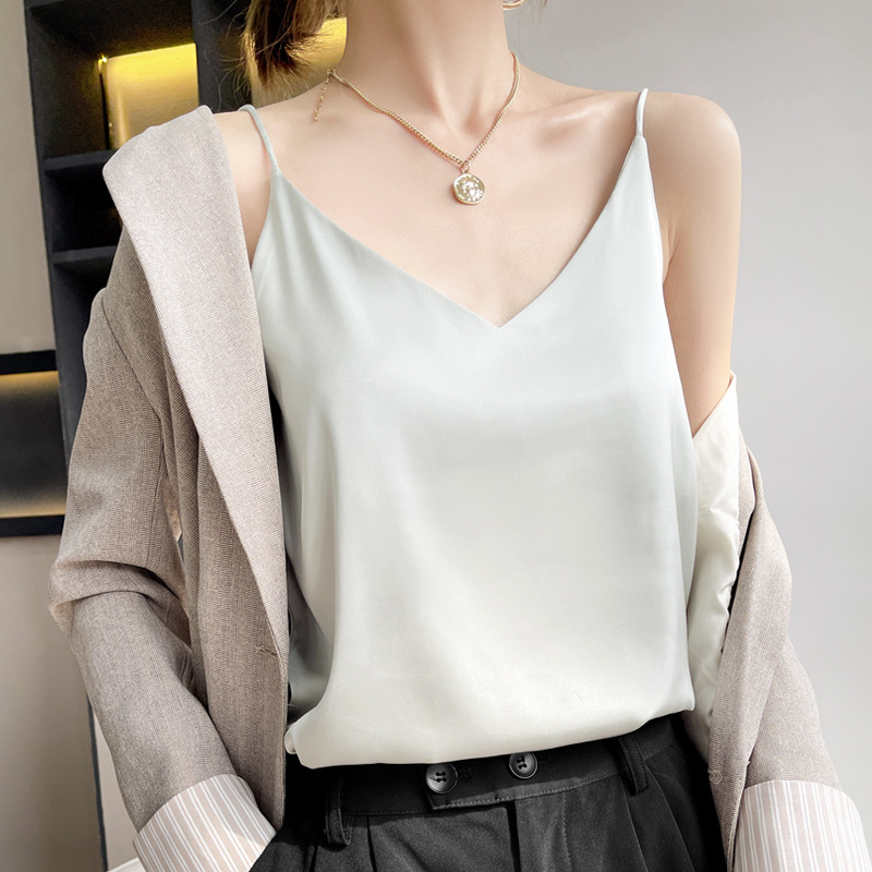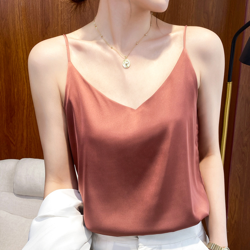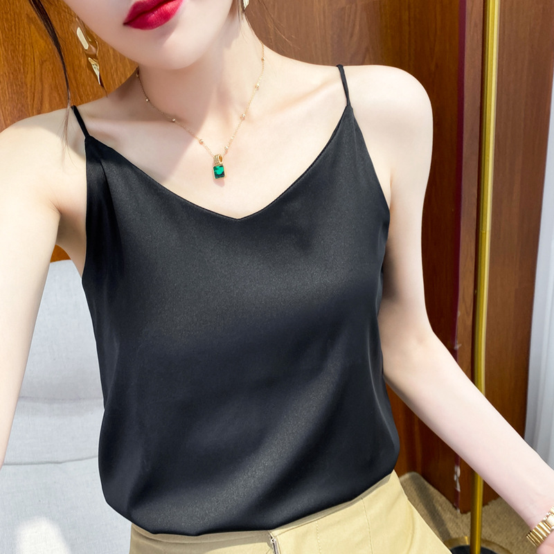 夏季内搭修身前后V领单肩带无袖纯色简约百搭仿真丝吊带小背心