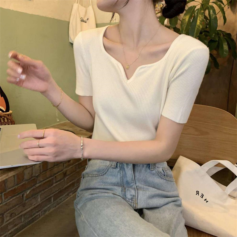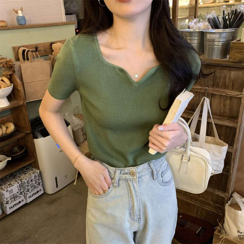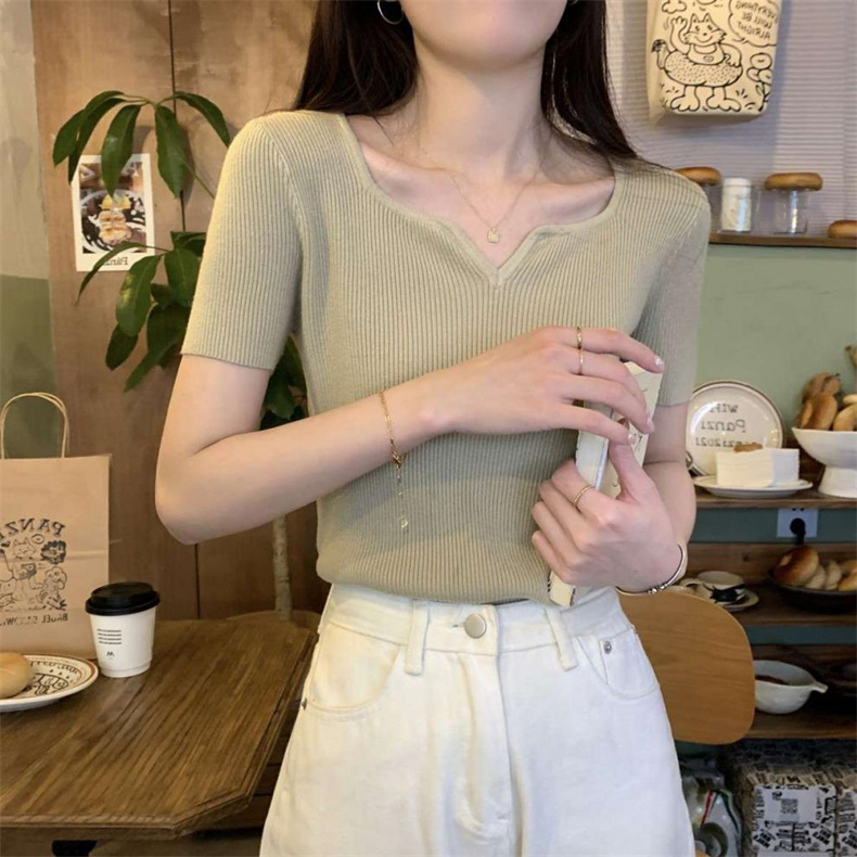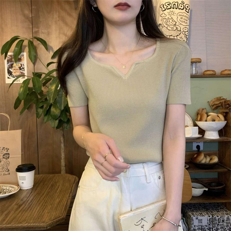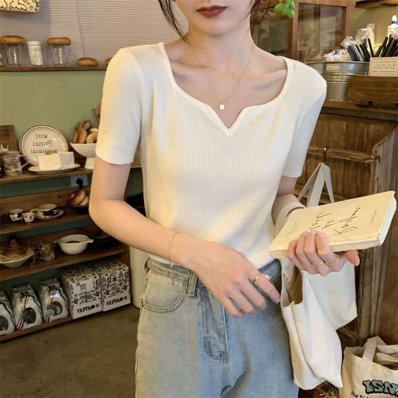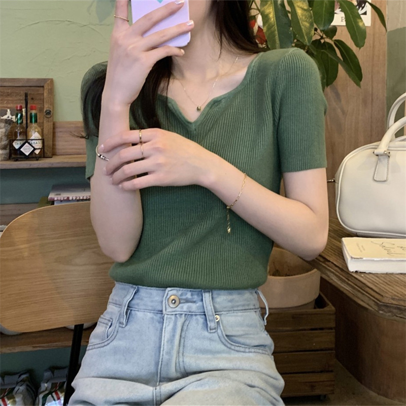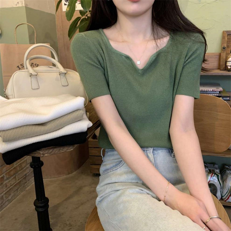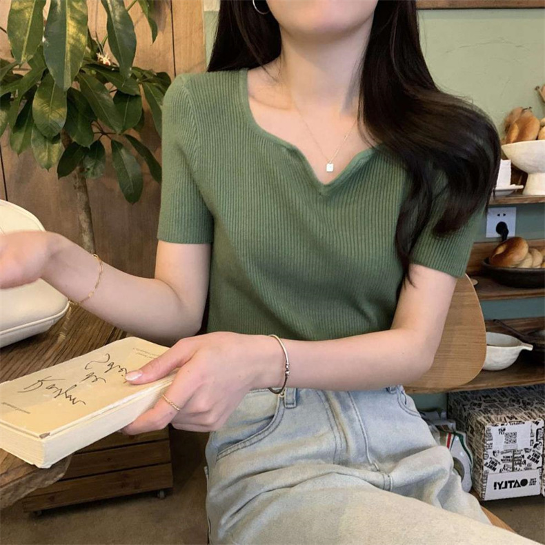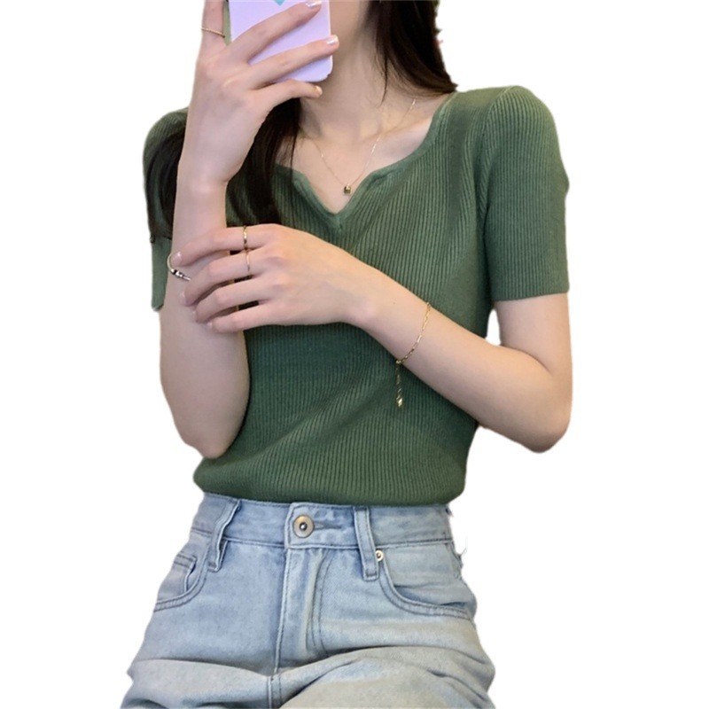 2024夏季新款设计感V领纯色冰丝短袖针织衫女慵懒风百搭T恤女毛衣