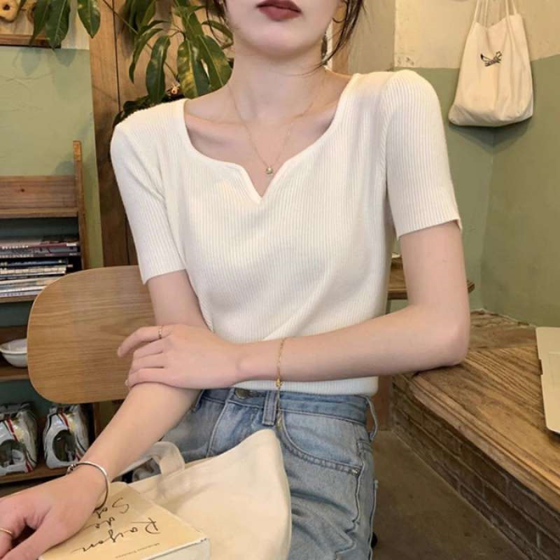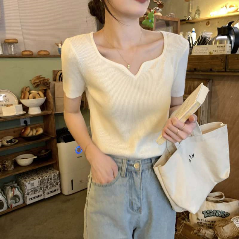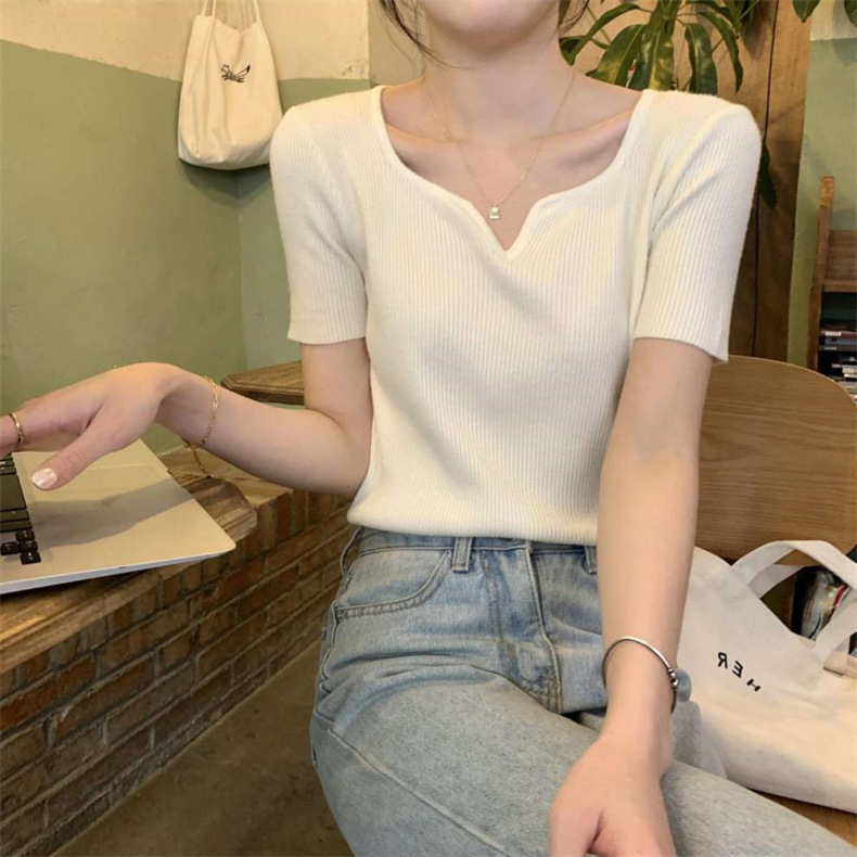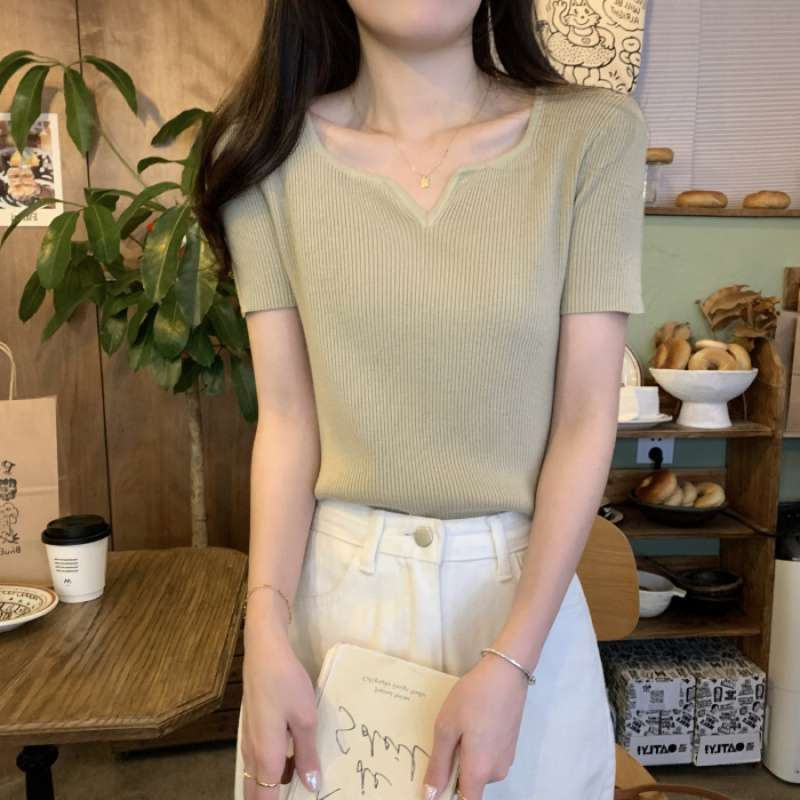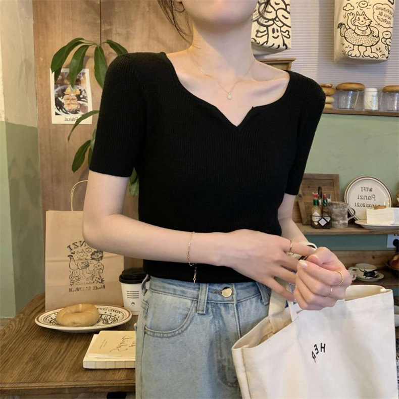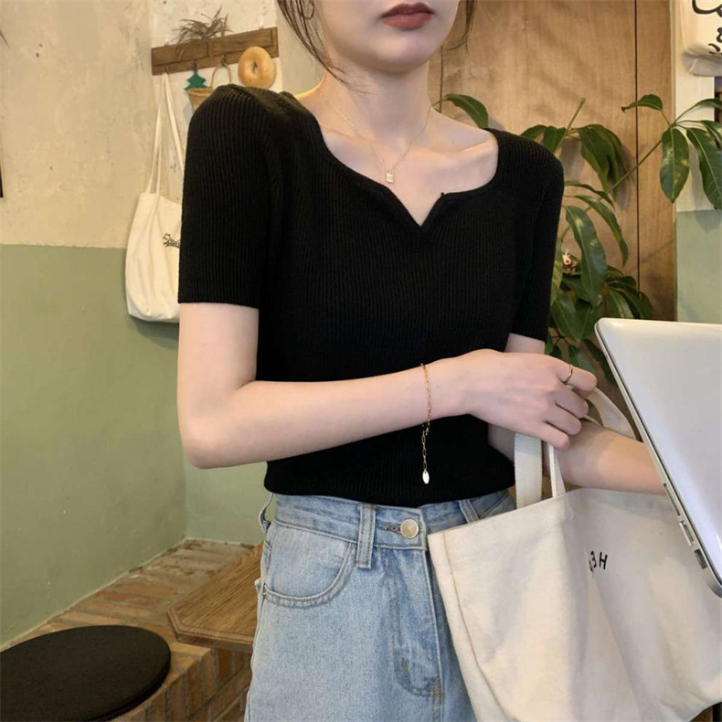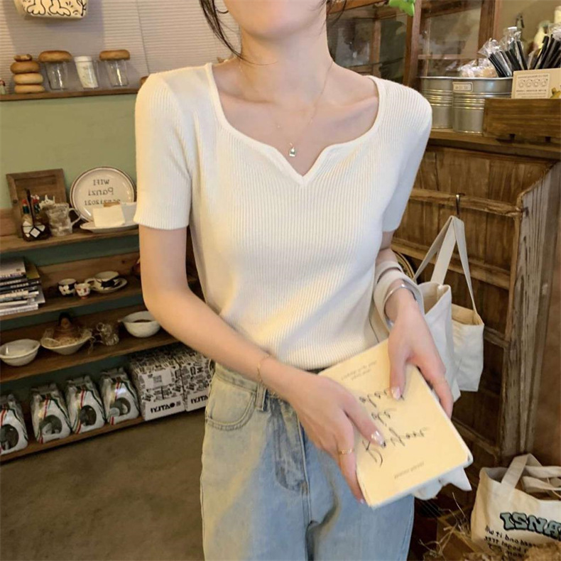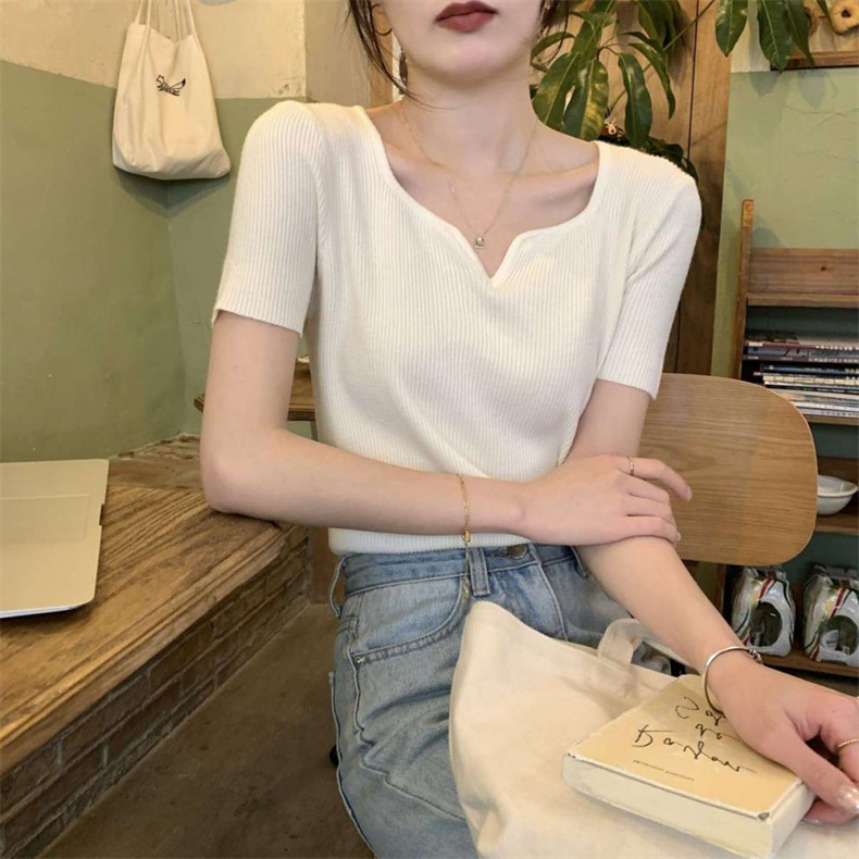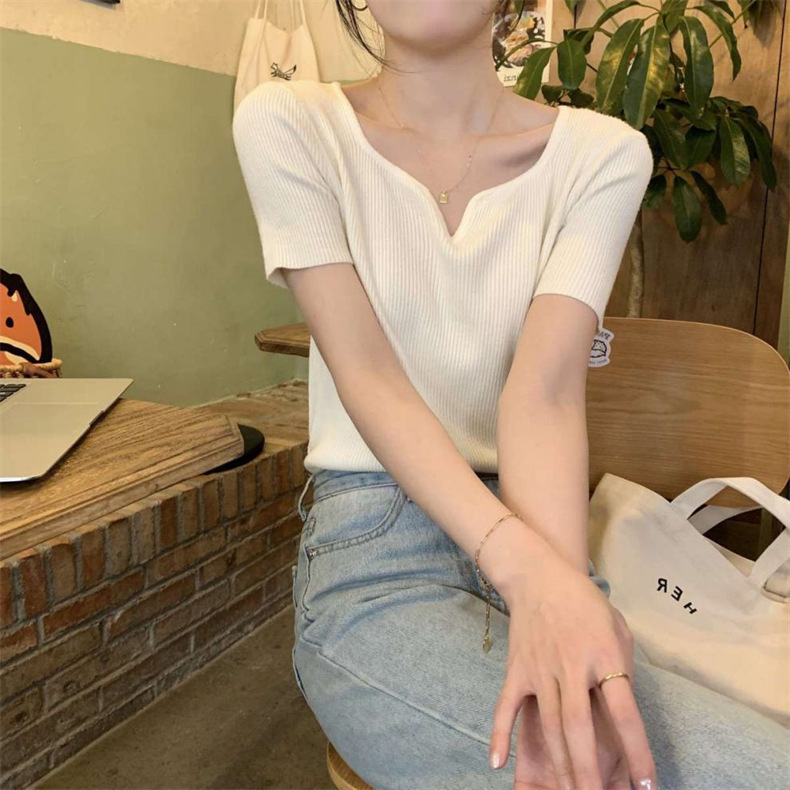 2024夏季新款设计感V领纯色冰丝短袖针织衫女慵懒风百搭T恤女毛衣