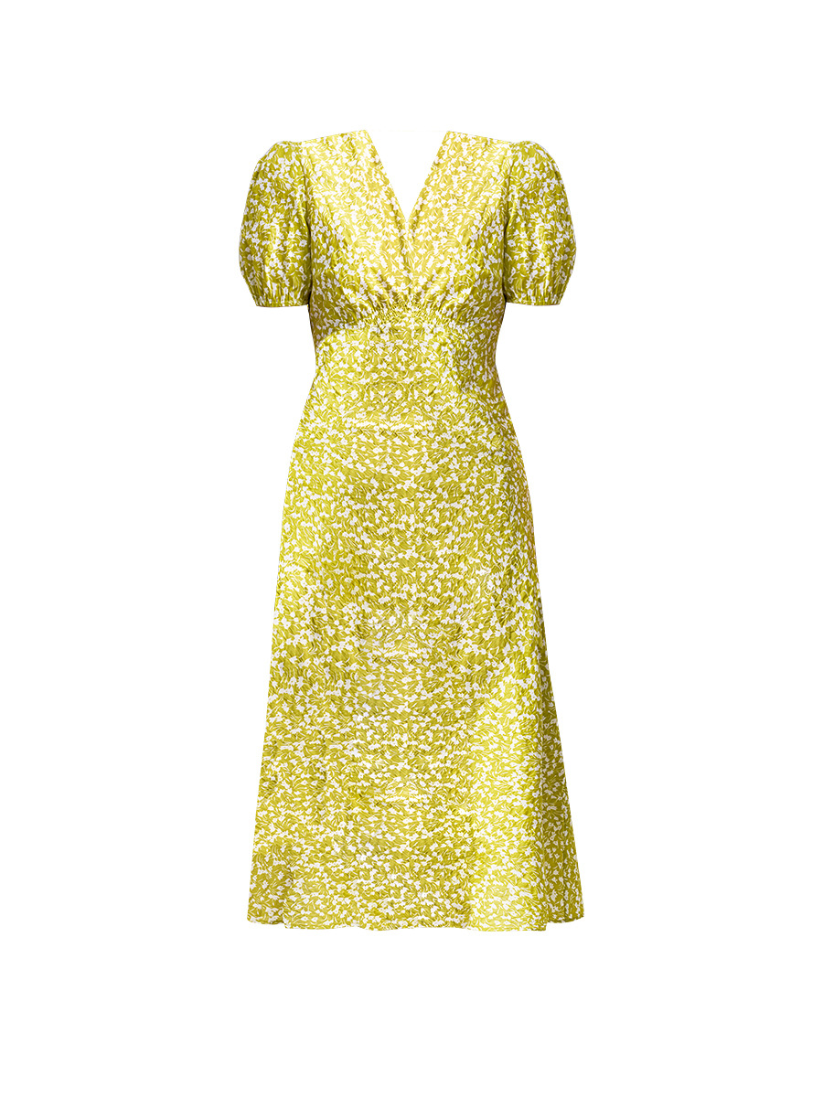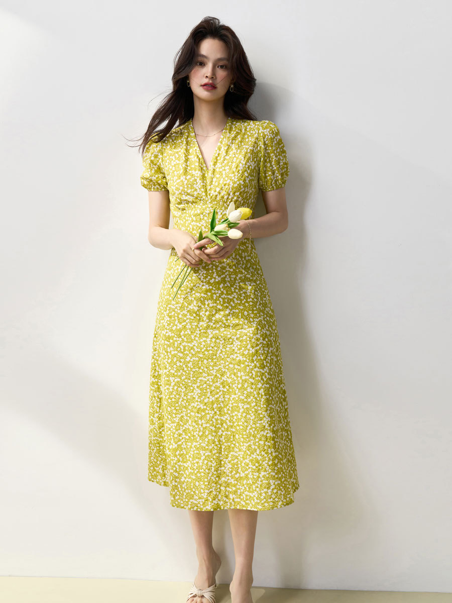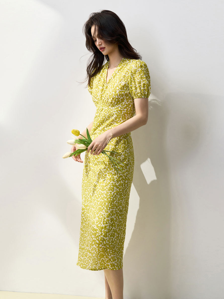 24夏新棉盐缩褶皱肌理小碎花温柔浪漫高腰显瘦V领打揽连衣裙13930