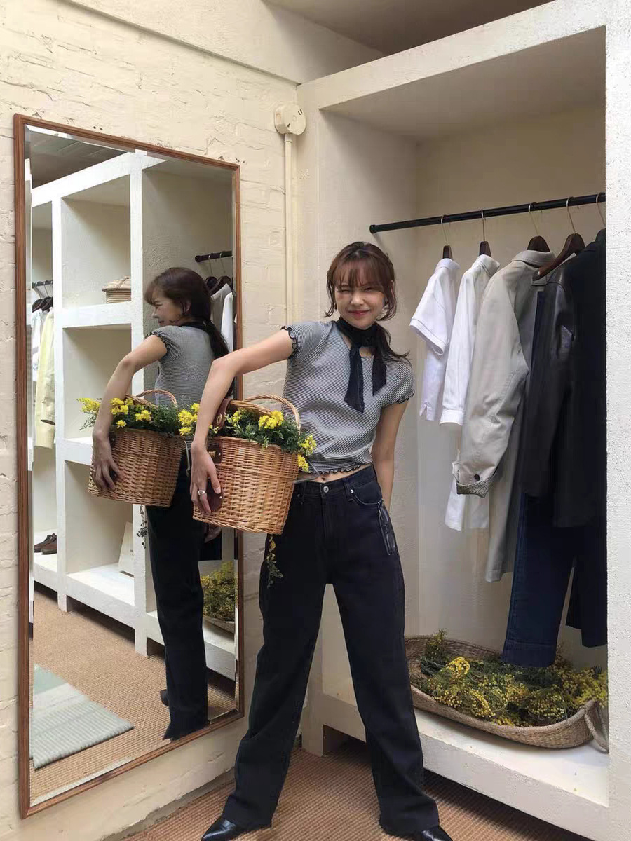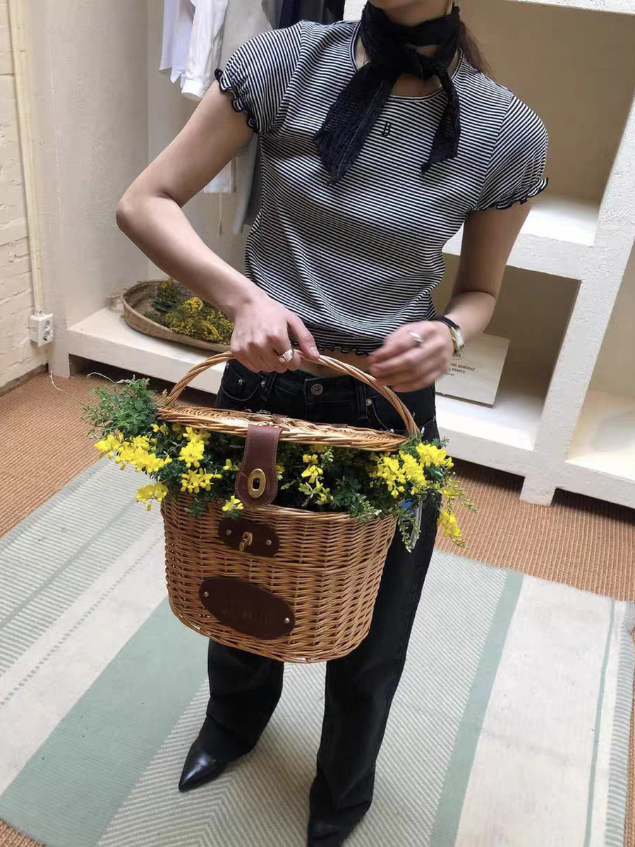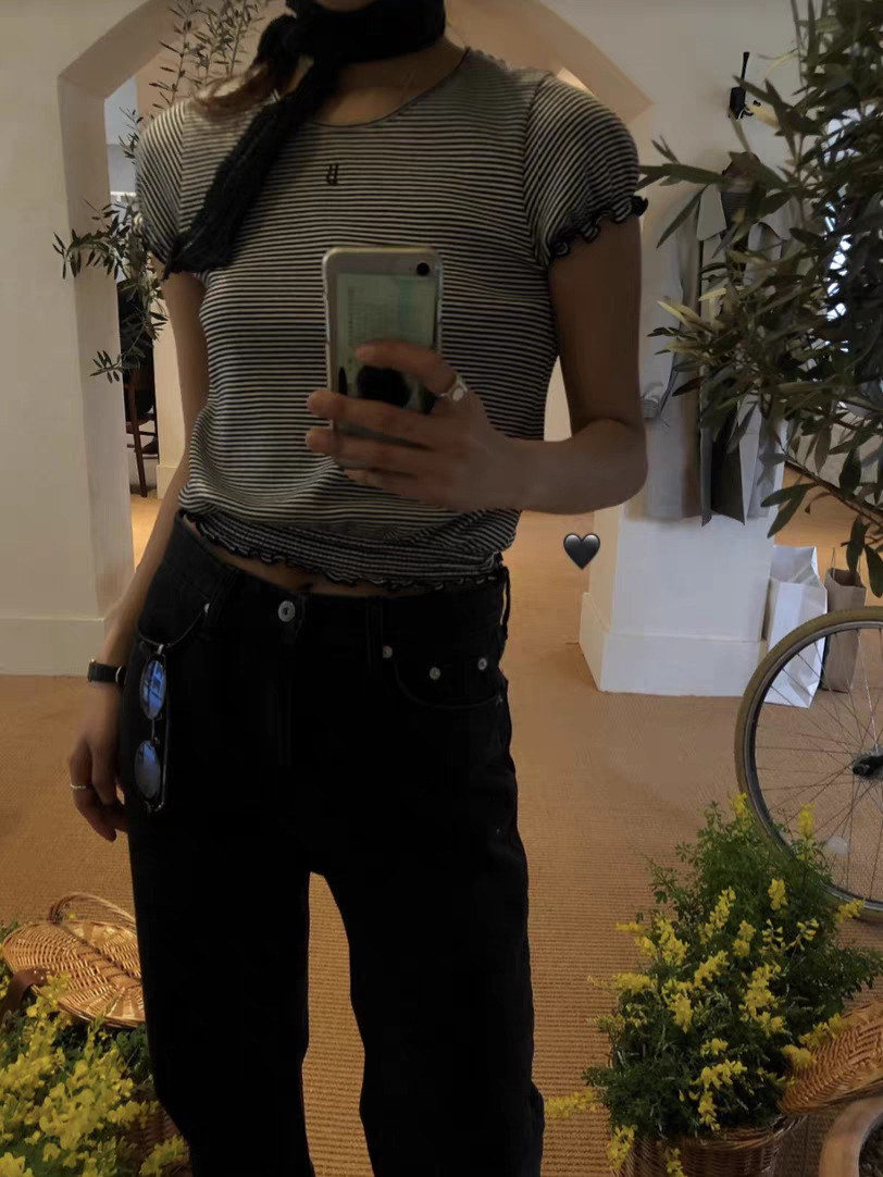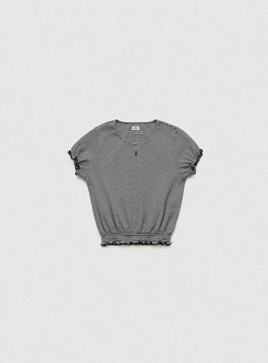 现 2024夏季新款韩国东大门th*Bar*net气质圆领木耳边条纹短袖T恤